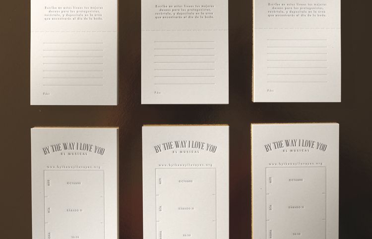 Ella baila, y él toca un instrumento, por eso esto no es una boda, es un musical. Las invitaciones simulan unas entradas a un musical, están impresas en papel reciclado de 250g con un acabado en golpe seco y tienen un trepado para el recorte de la parte inferior, donde se escribirá el mensaje a los novios. En la web www.bythewayiloveyou.org podemos ver el trailer del musical.