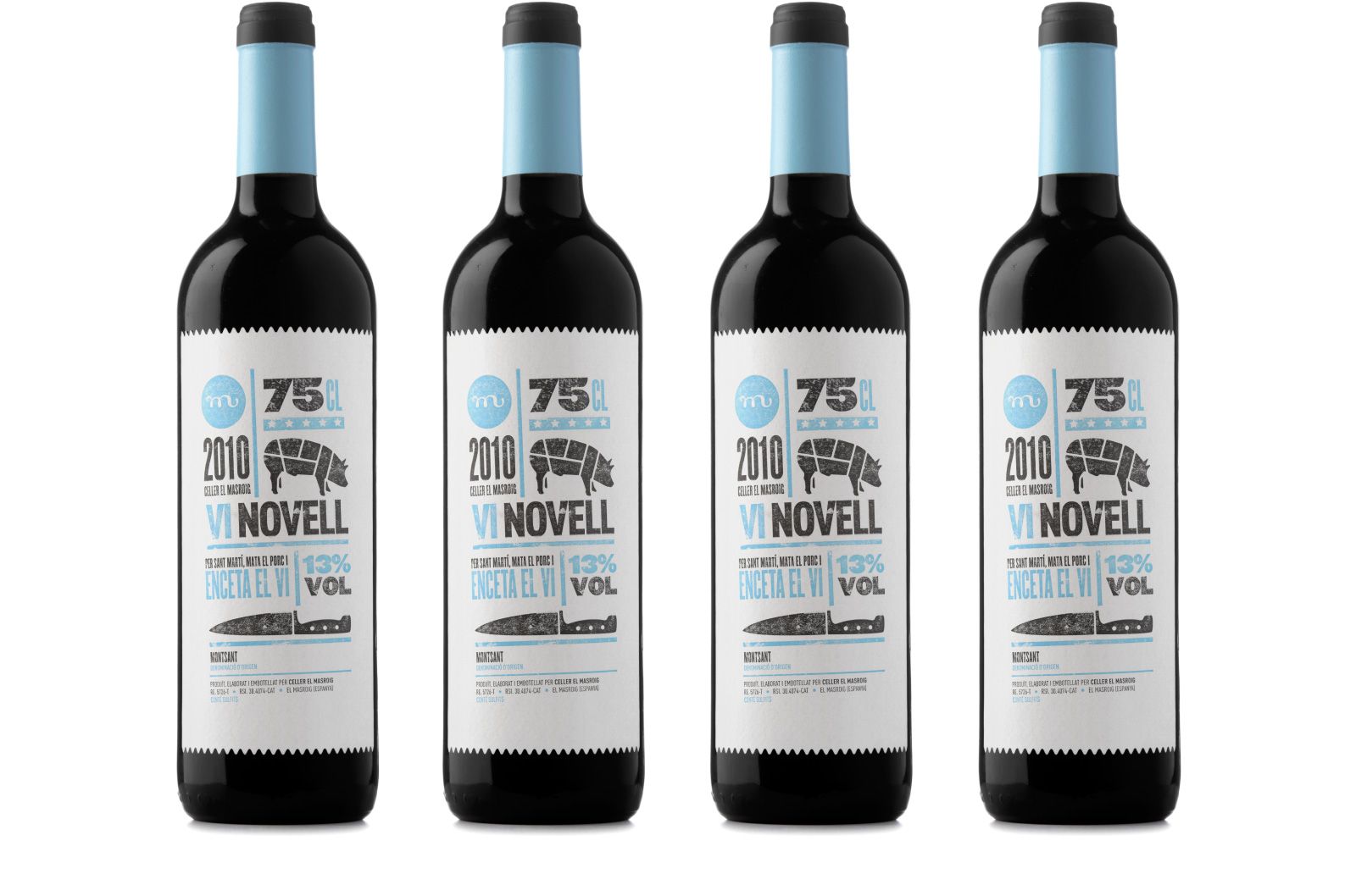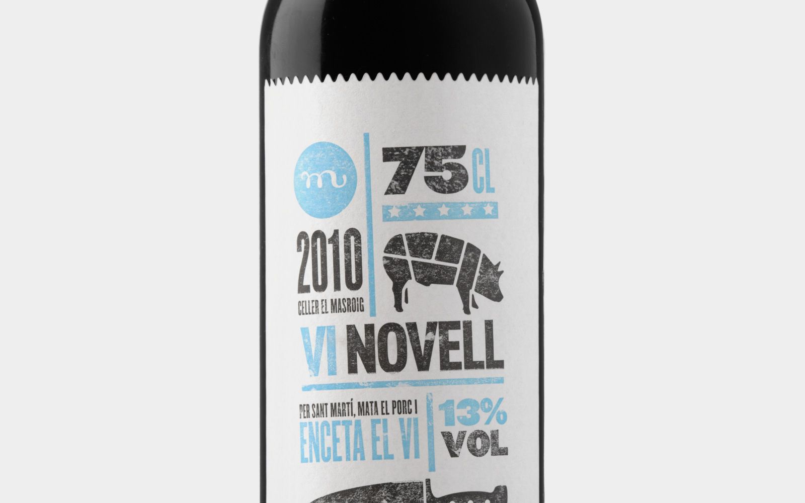 El Vi Novell es un vino fresco y afrutado que se embotella antes de que su fermentación finalice para poderlo consumir en San Martín coincidiendo con la matanza del cerdo. Para el diseño de la edición de 2010 nos inspiramos en los antiguos carteles de las fiestas populares impresos con tipografías de madera.
