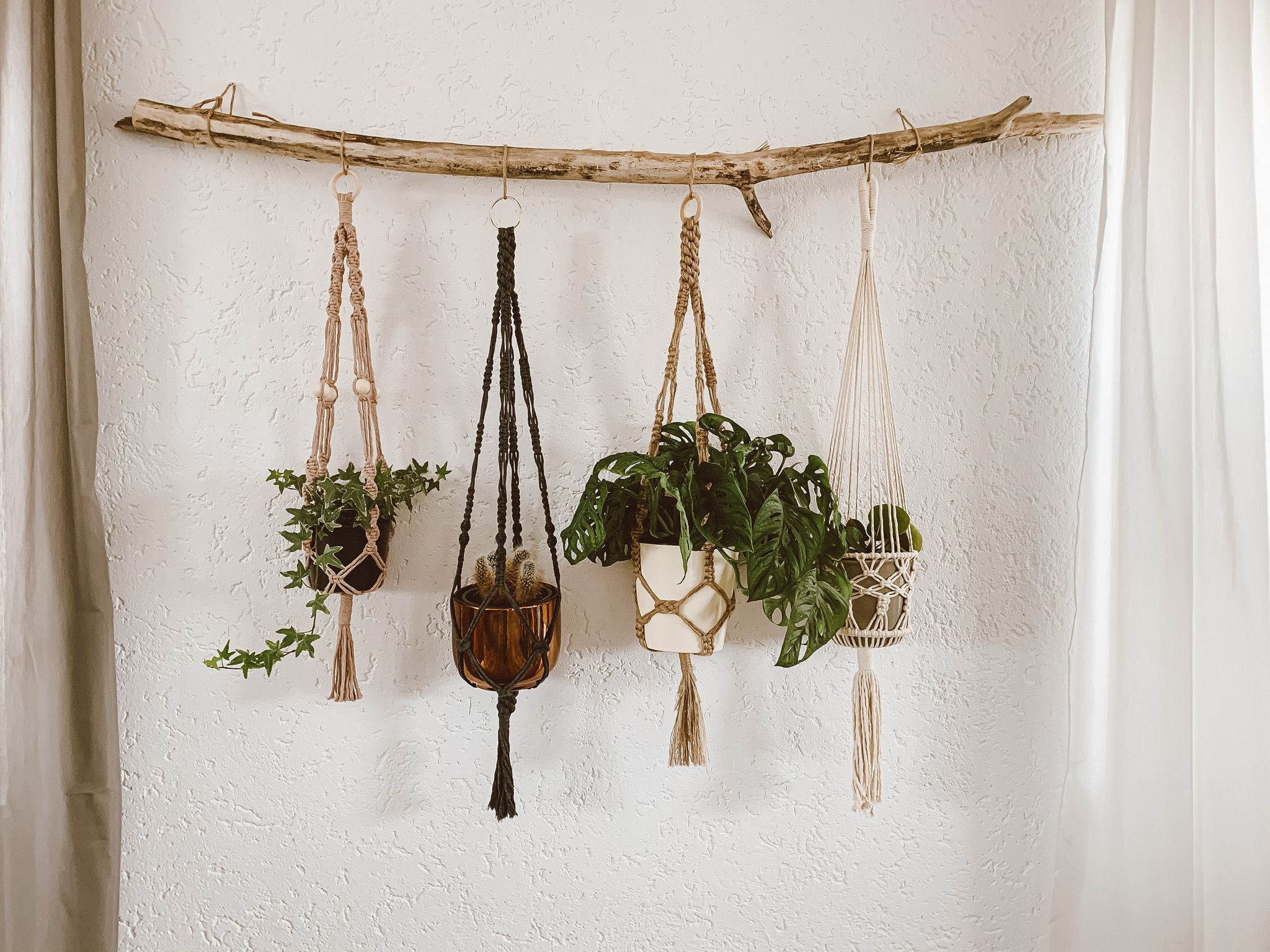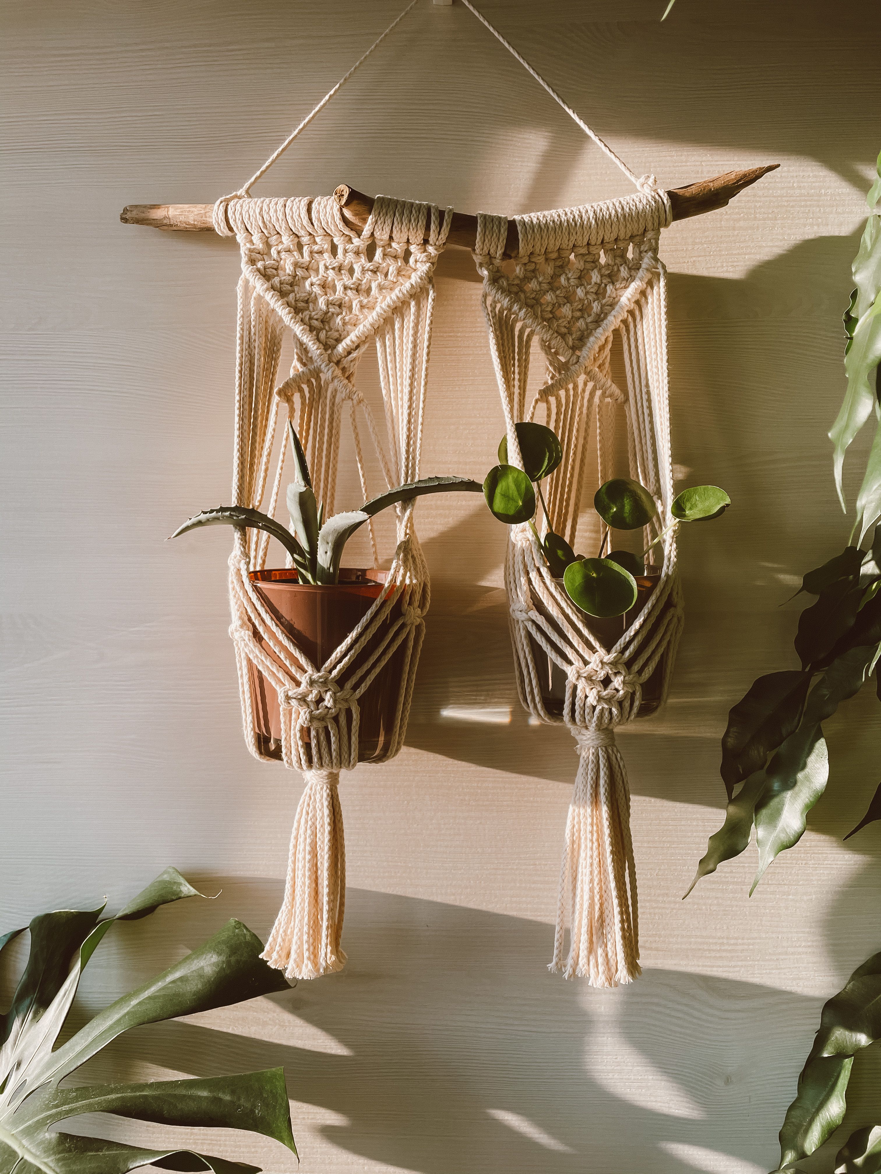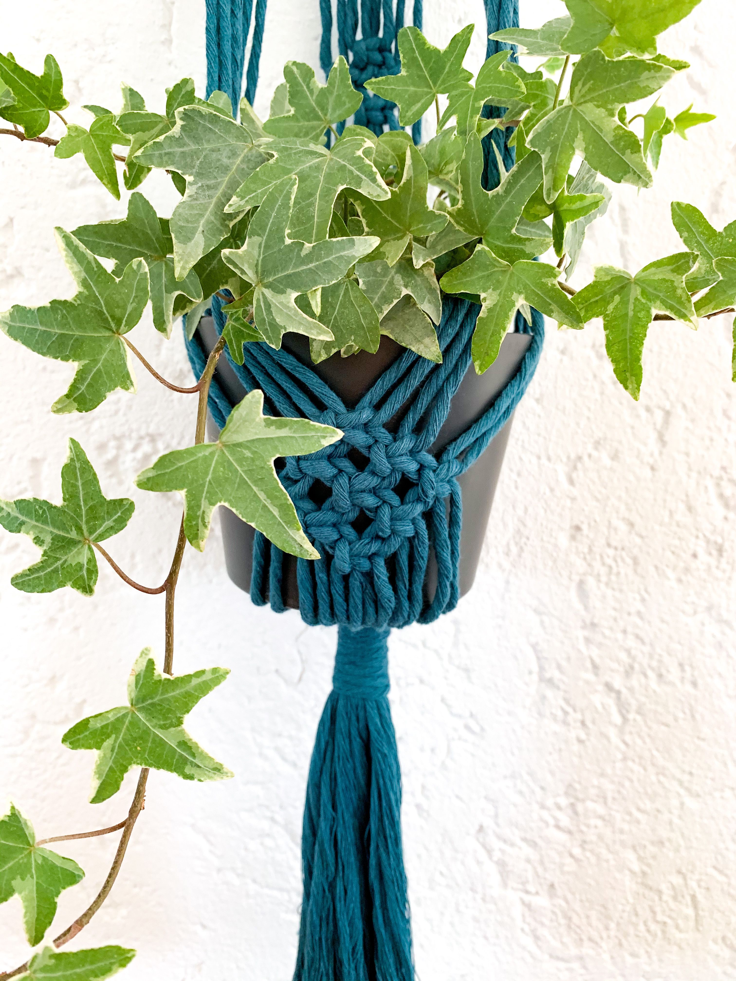 Anstatt einer Blumenampel knüpfe ich gerne auch Pflanzenhänger für die Wand.Variation: Doppelte Pflanzenhänger zum Aufhängen an der Wand.Unendliche Möglichkeiten: Für große oder kleine Töpfe, gleiche oder verschiedene Knoten Muster.Oder auch als mini Pflanzenhänger für einen kleinen Kaktus oder andere kleine Pflanzen.Blumenampel mit einem kleinen Holztablett zum Aufstellen von kleinen Töpfen.Verschiedenste Farbkombinationen von Garn mit dem Grün der Blätter kombinieren.Klassische Blumenampeln zum Aufhängen an der Decke.Minimalistische, klassische Blumenampeln.