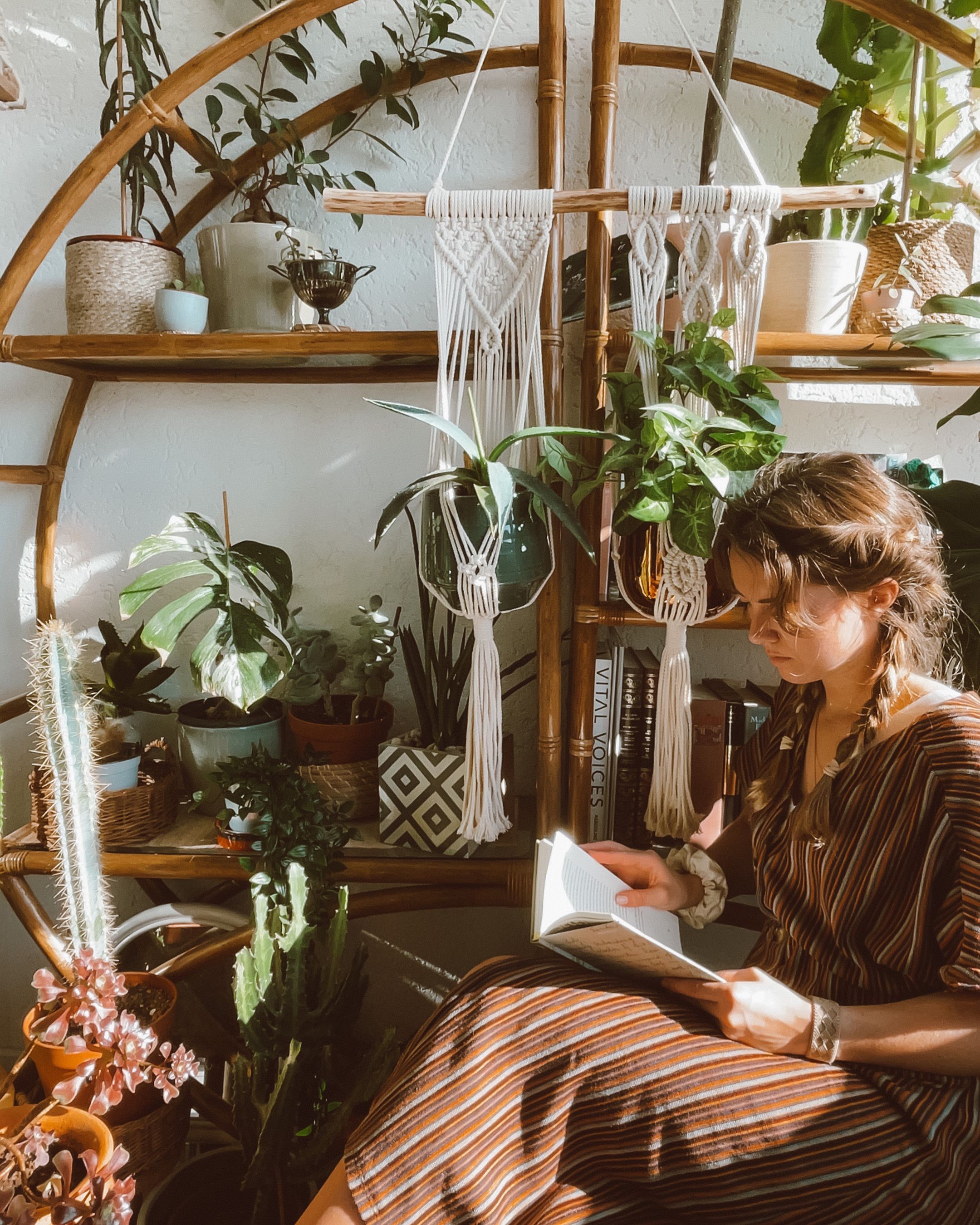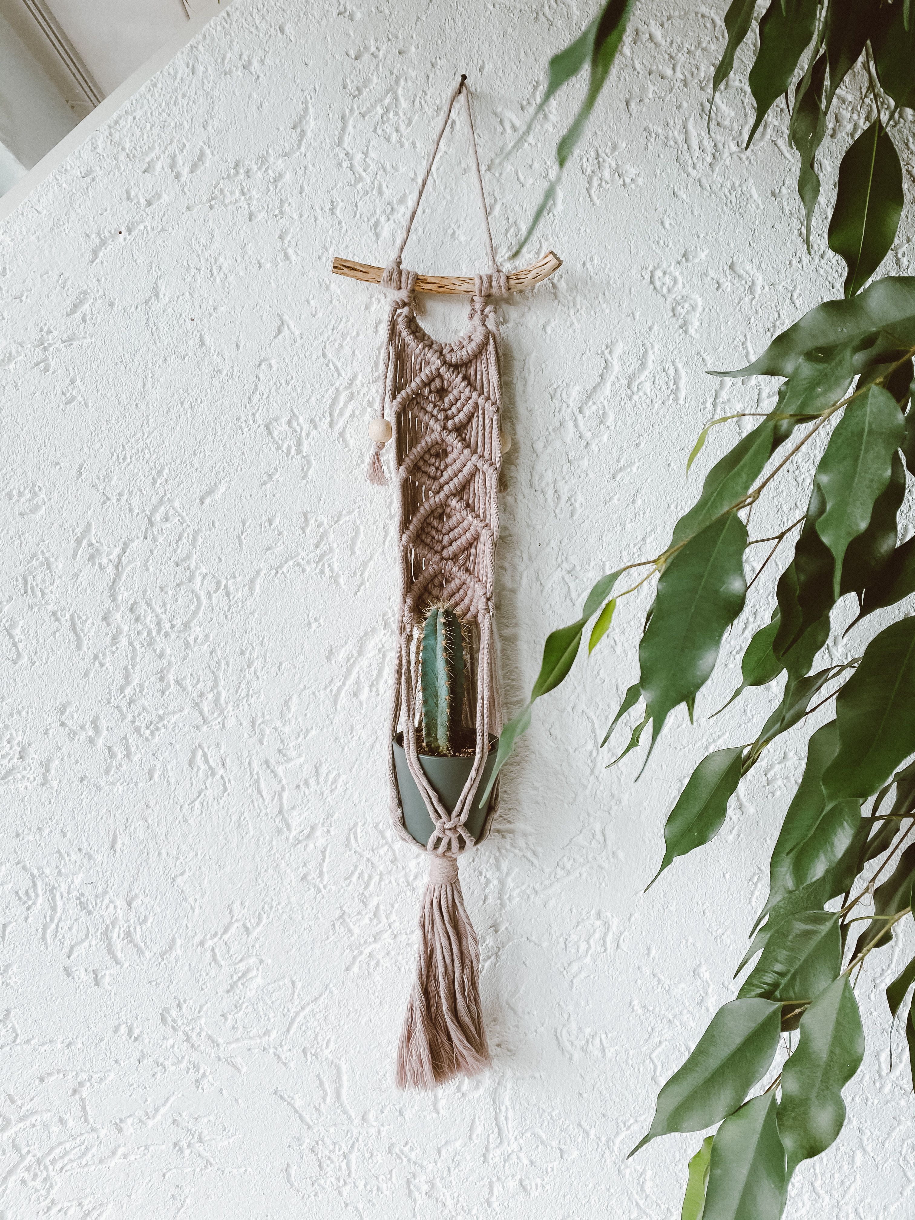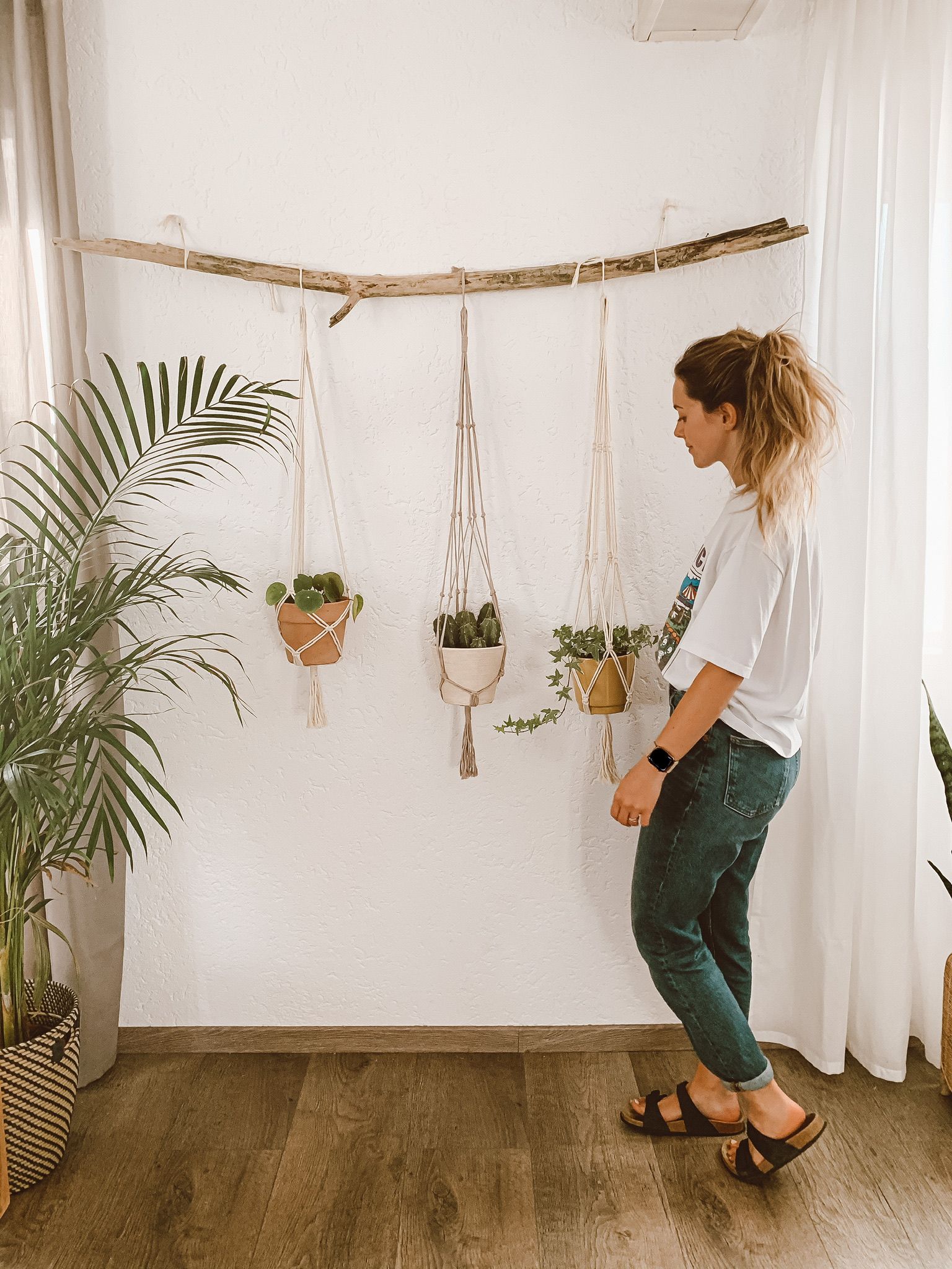 Anstatt einer Blumenampel knüpfe ich gerne auch Pflanzenhänger für die Wand.Variation: Doppelte Pflanzenhänger zum Aufhängen an der Wand.Unendliche Möglichkeiten: Für große oder kleine Töpfe, gleiche oder verschiedene Knoten Muster.Oder auch als mini Pflanzenhänger für einen kleinen Kaktus oder andere kleine Pflanzen.Blumenampel mit einem kleinen Holztablett zum Aufstellen von kleinen Töpfen.Verschiedenste Farbkombinationen von Garn mit dem Grün der Blätter kombinieren.Klassische Blumenampeln zum Aufhängen an der Decke.Minimalistische, klassische Blumenampeln.