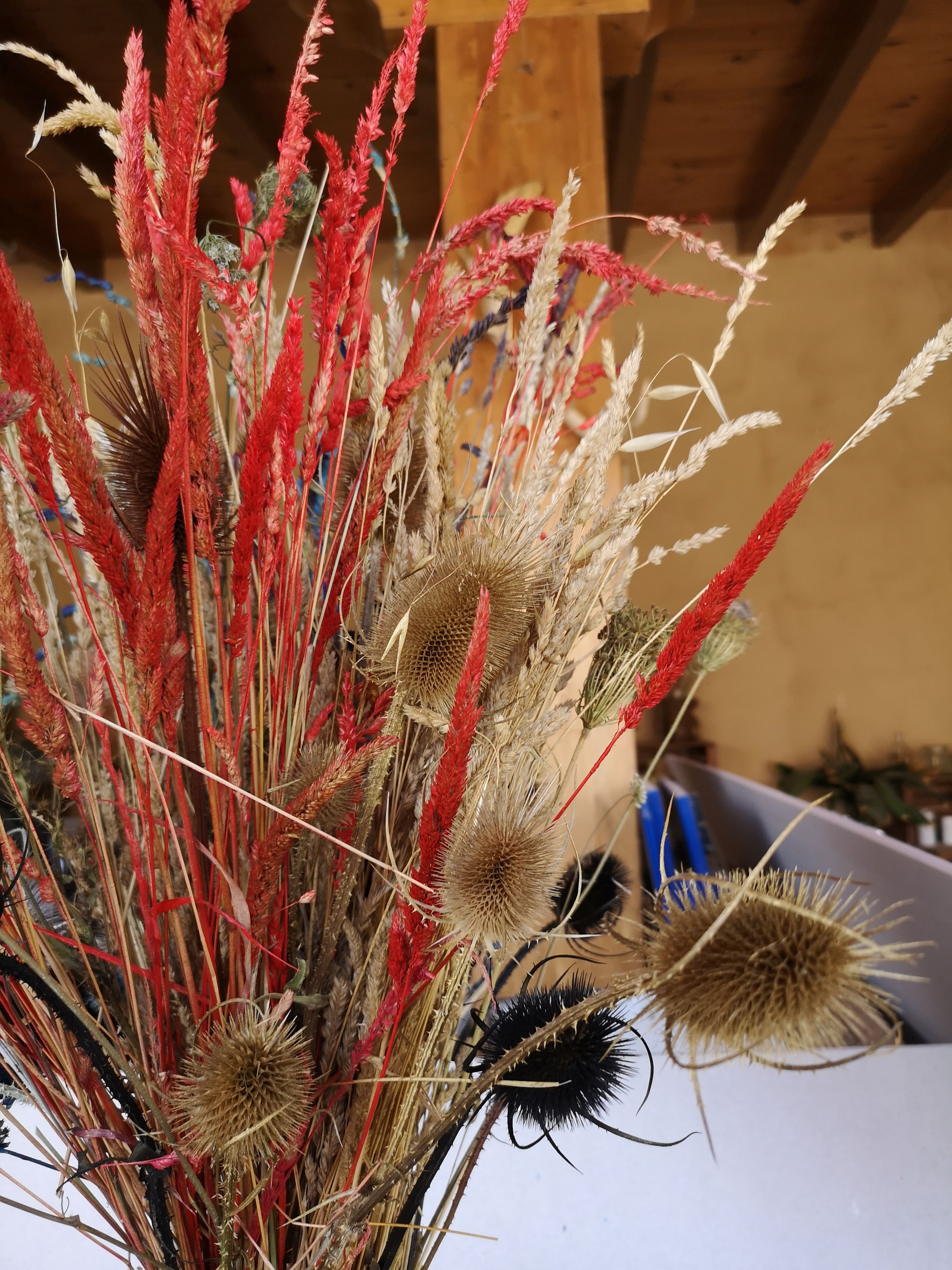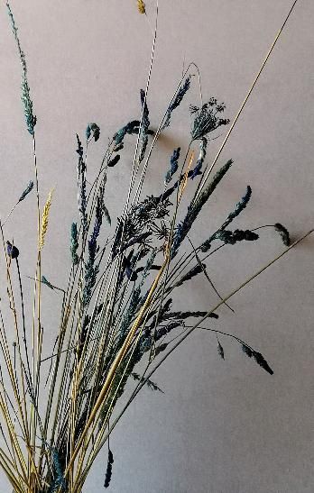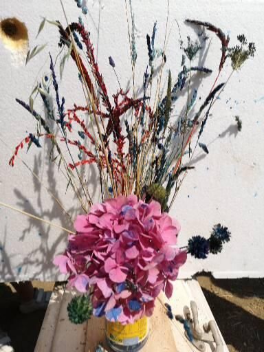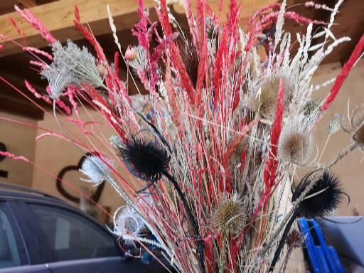 Las hierbas antes de recolectarlas (León, España) Pinturas utilizadas. La anilina que encontré era para madera, preferí usar spray rojo. Pruebas diversas con diversas concentración de tinte Experimentando a teñir flor preservada (Hortensia) tras 4 días en glicerol con agua. Spray blanco sobre cardos. Los que grafiteé en negro parecían chamuscados. No se ven cardos rojos pero fueron los que más destacaban y luego usé en una composición con juncos Uno de los centros rústicos ya terminado.
