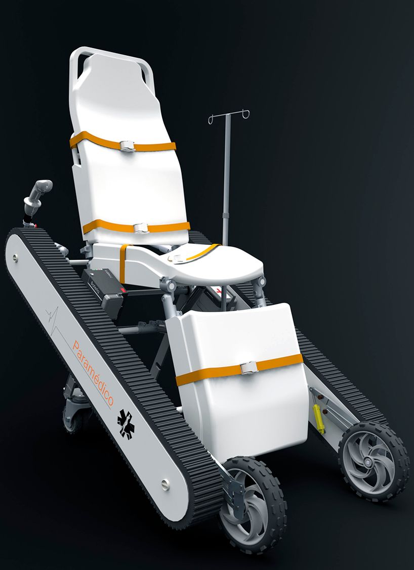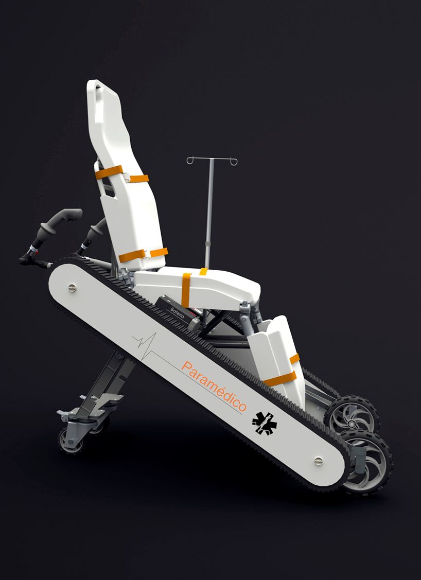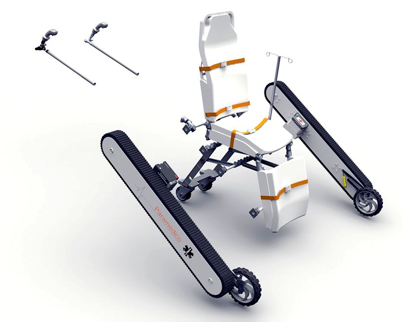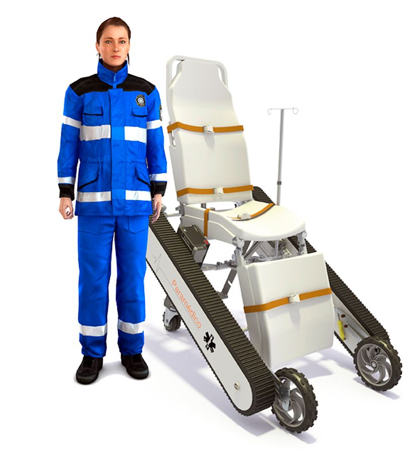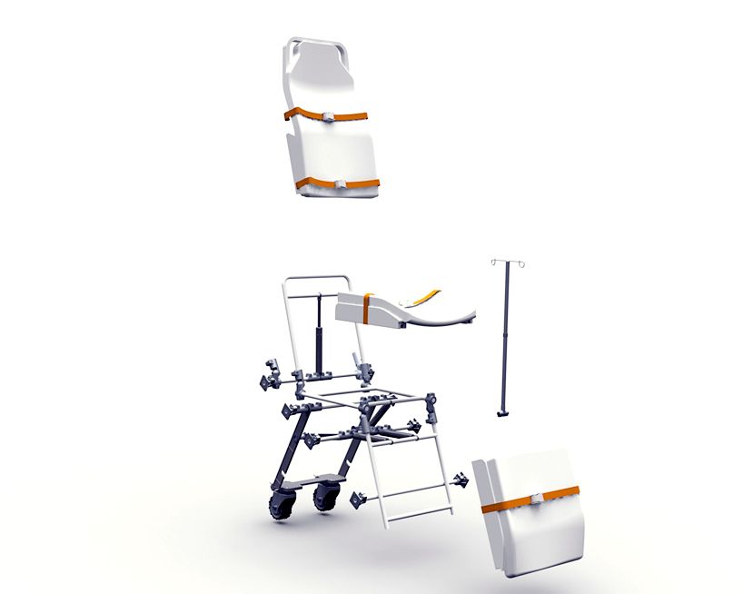Diseño de una silla camilla modular con un sistema de oruga integrado. Este objeto puede utilizarse en situaciones de difícil acceso durante emergencias médicas. Además ofrece excelente ergonomía, tanto para el paramédico como para el paciente.