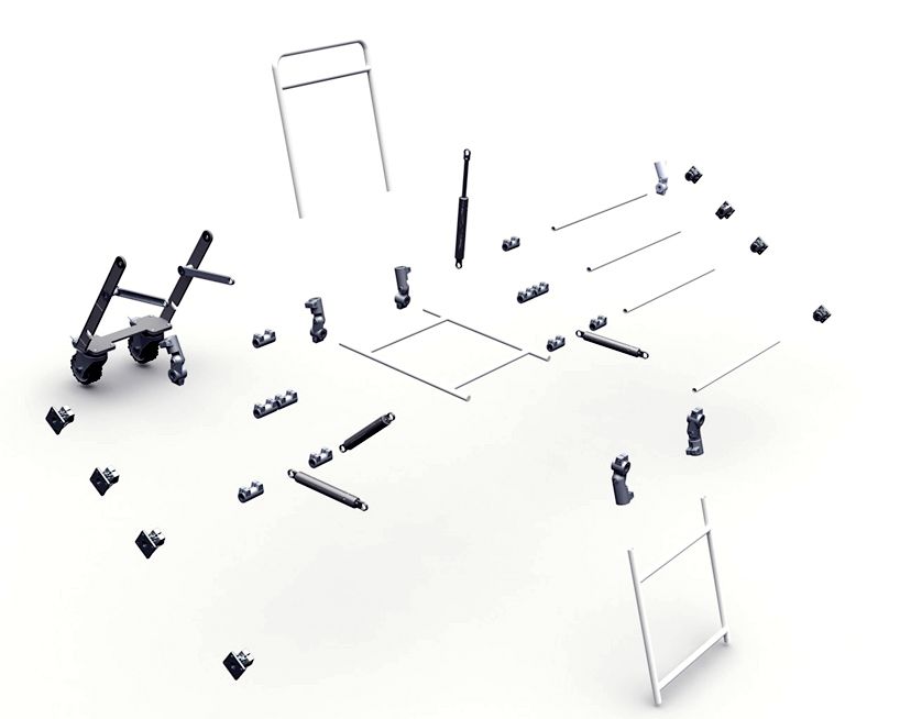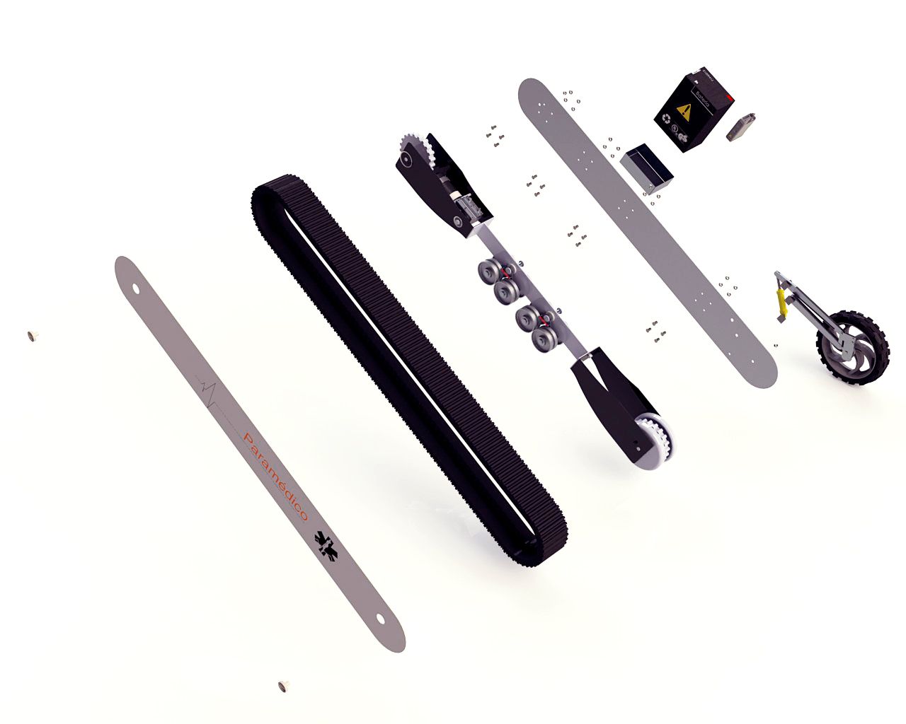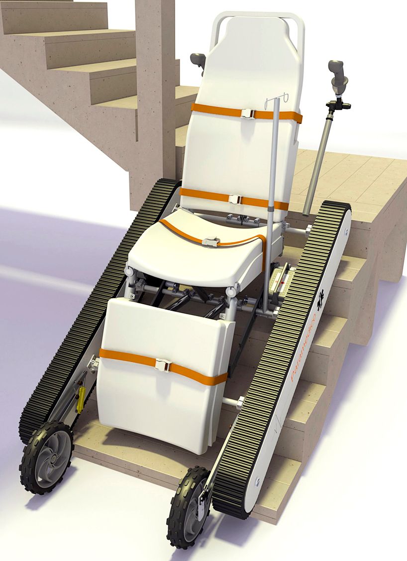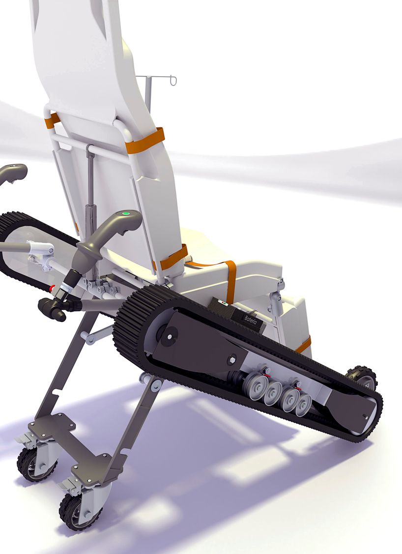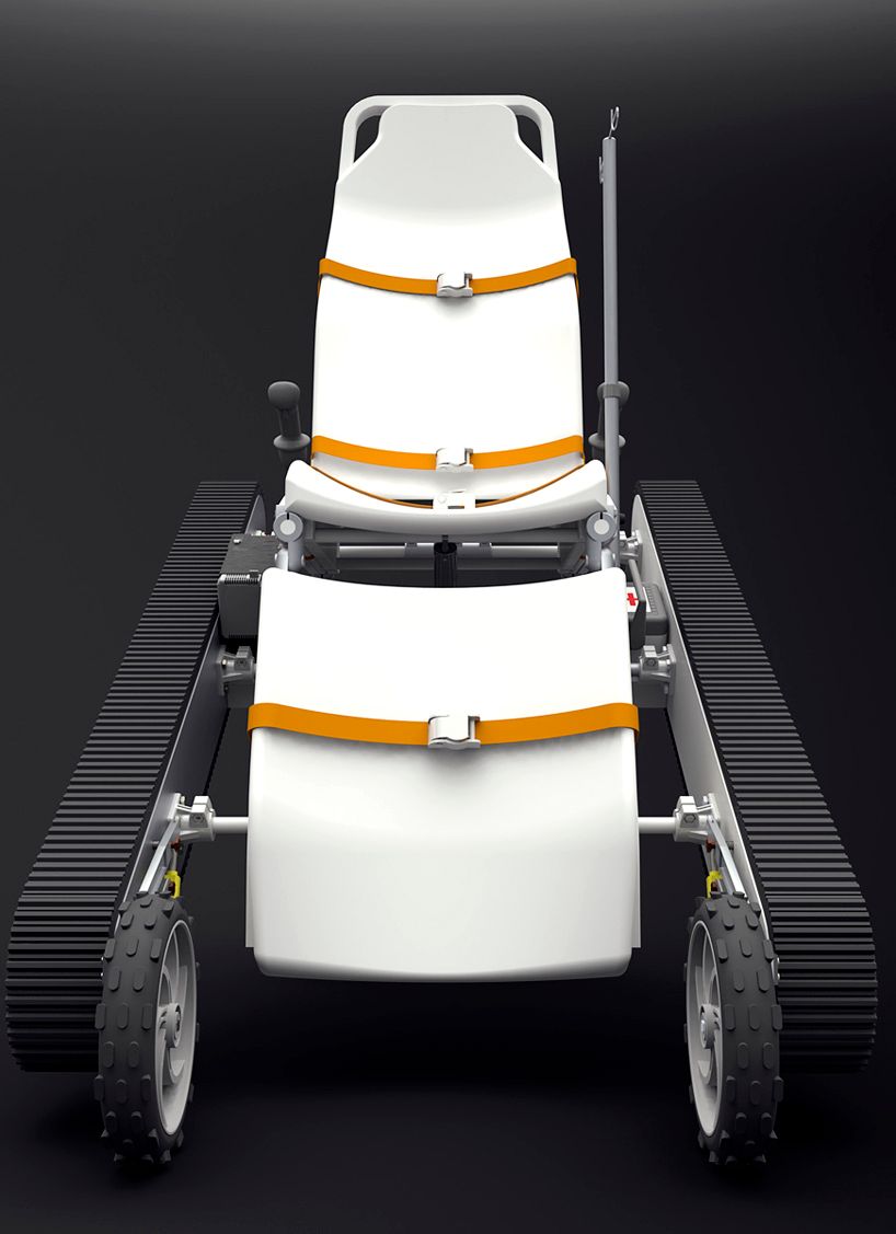 Diseño de una silla camilla modular con un sistema de oruga integrado. Este objeto puede utilizarse en situaciones de difícil acceso durante emergencias médicas. Además ofrece excelente ergonomía, tanto para el paramédico como para el paciente.