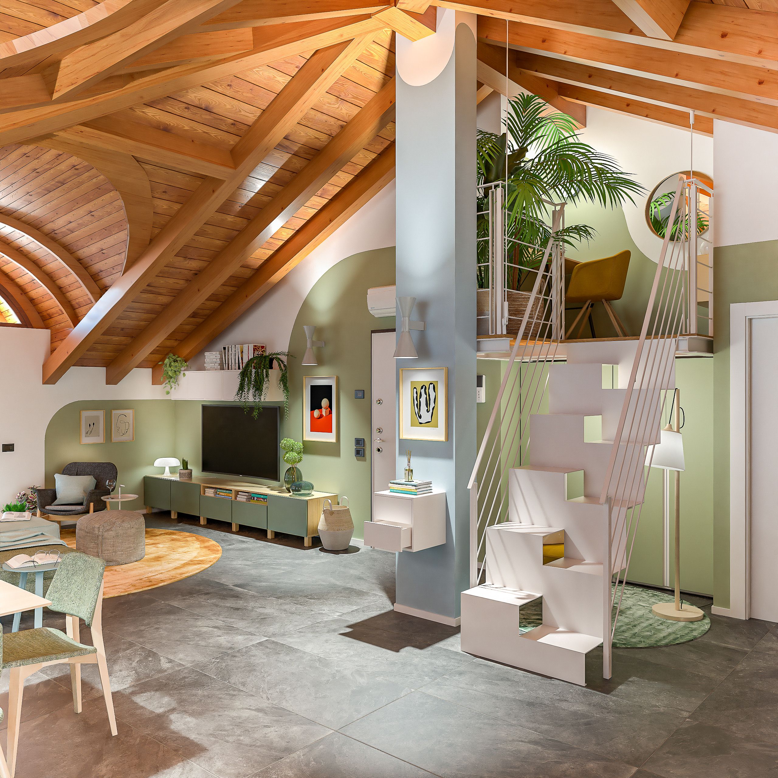 Ho utilizzato la geometria curvilinea delle decorazioni sulle pareti (suggerita sia dalle volte del tetto e arcate delle finestre, sia dalla parete che separa il living dal bagno) come filo conduttore per tutte le zone funzionali dell'ambiente.