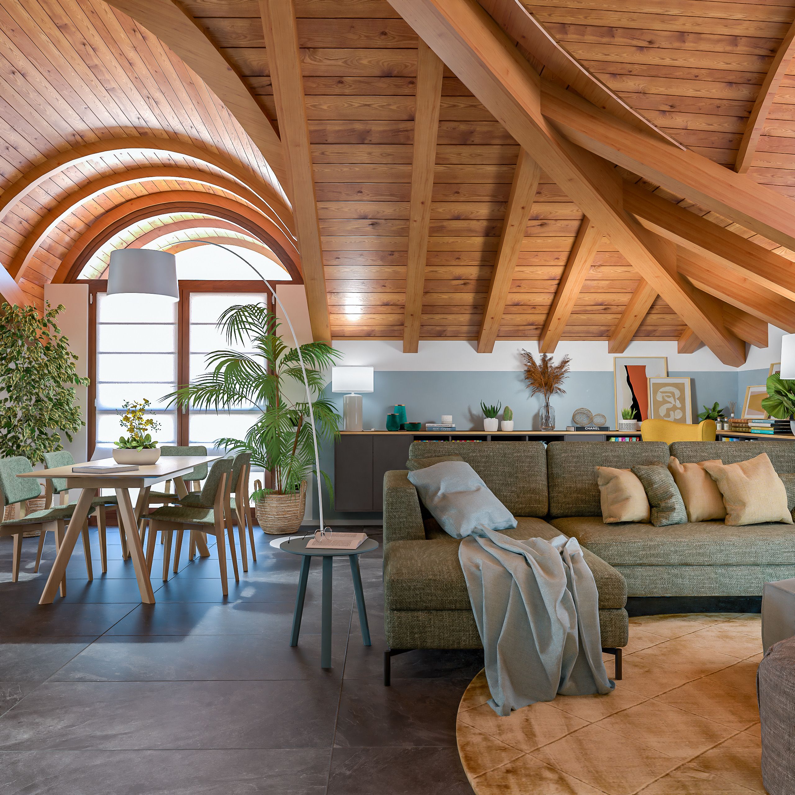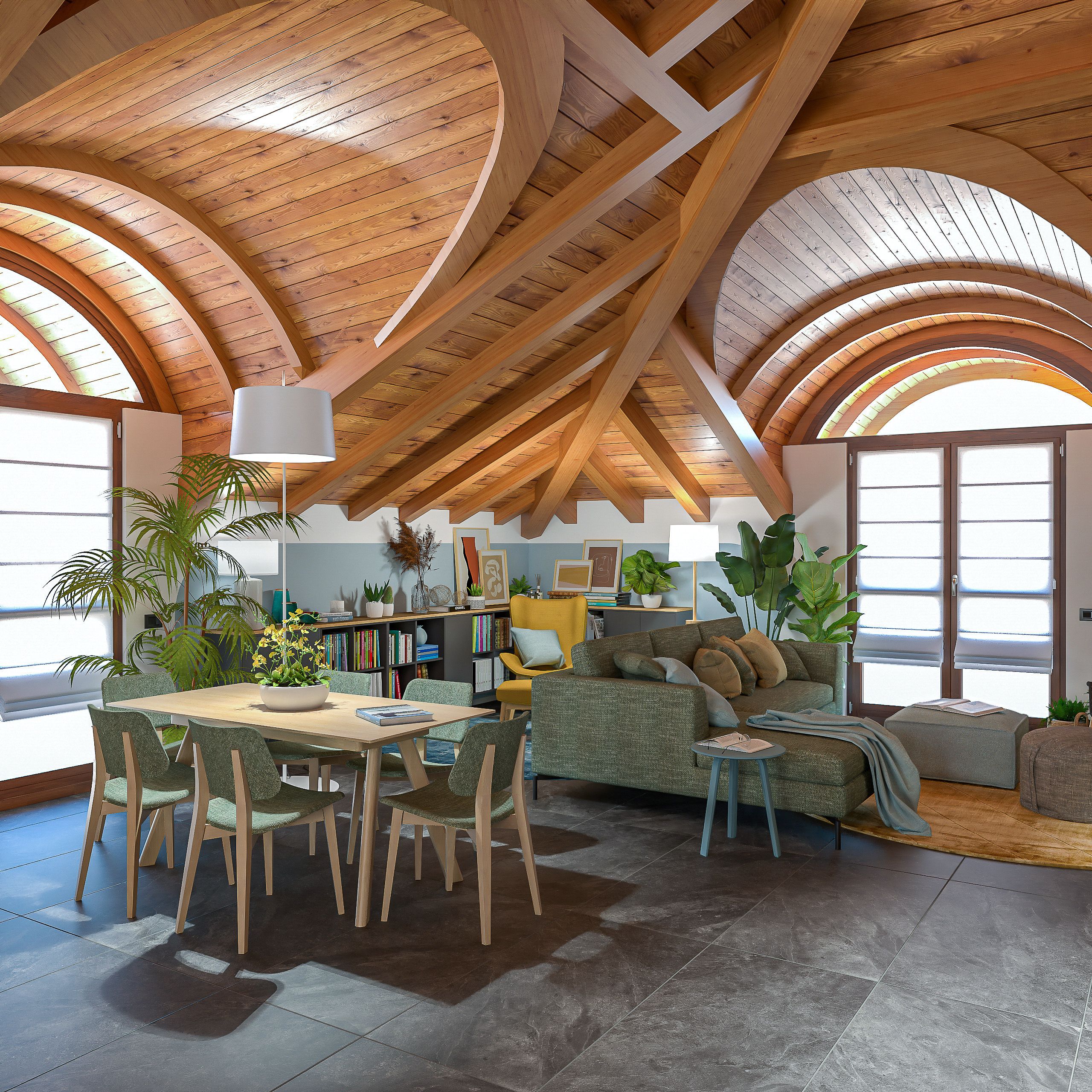 Il piano calpestabile del soppalco è realizzato con un assito di legno di abete lamellare (lo stesso utilizzato per il tetto), sul quale andrà posato parquet di rovere o un pavimento vinilico effetto rovere