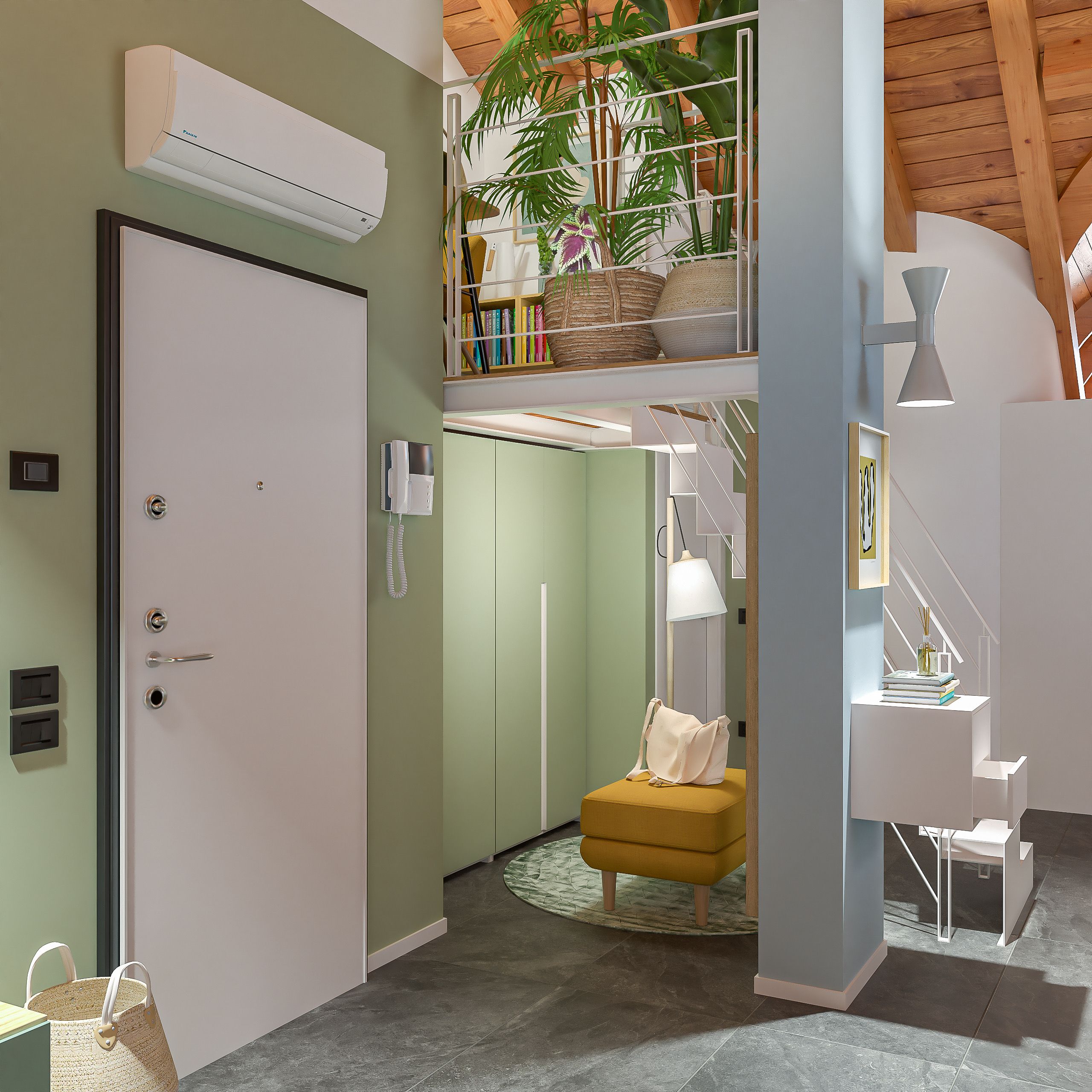 Lo spazio sottostante il soppalco svolge la funzione di guardaroba all'ingresso.