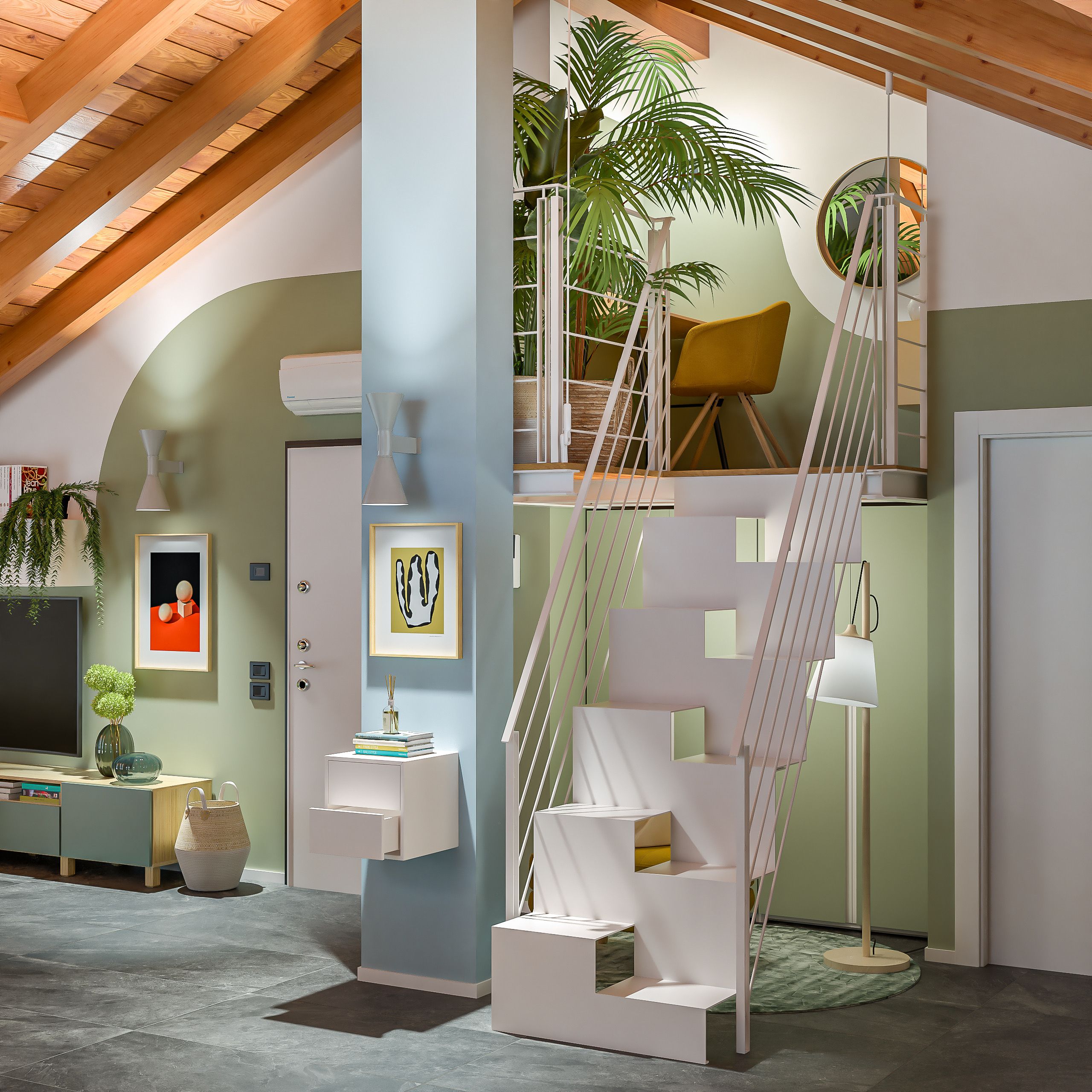 Il soppalco si colloca a poco più di 180 cm da terra per rendere fruibile la parte superiore, che è dedicata ad un piccolo angolo studio.