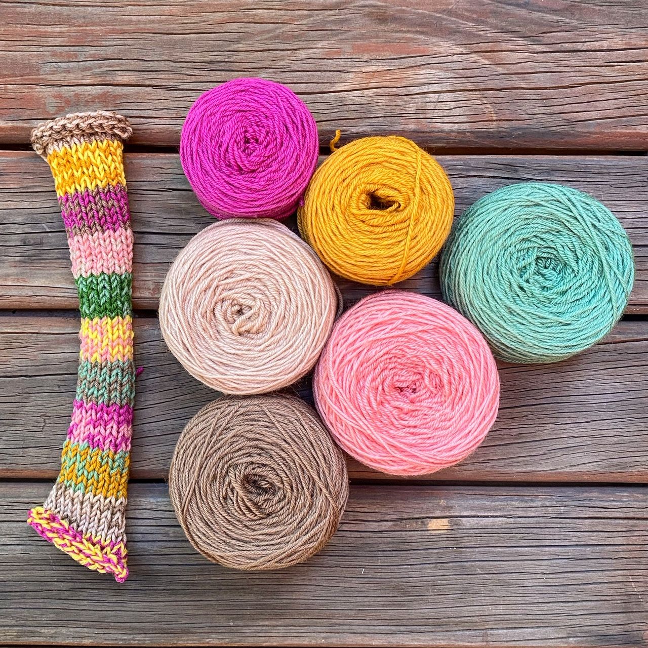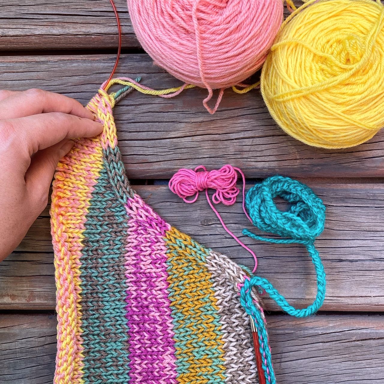 El sweater Iris está tejido de lado, empezando por el centro delantero. Se teje como espejo: primero una parte y luego la otra. Está diseñado de esta manera para poder tener escote en V y rayas verticales.