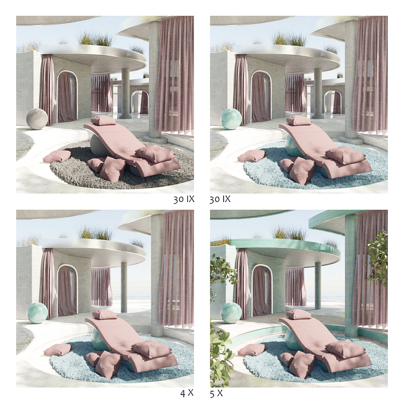 Anyway, there are many things that I like in my artwork. For example buildings and their rooftop shapes. Also, curtains and doors/portals. Portals were inspired by Maison de Samble by Charlotte Taylor. Spheres, that are the base of my furniture and the sphere that is on the left side, are another thing that I liked in this picture.