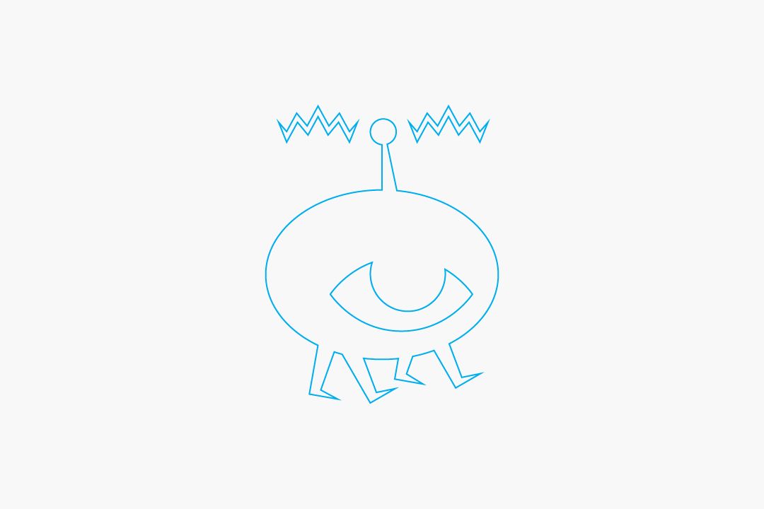 Así fue como llegamos a la propuesta que combina todo lo anterior, representada por una pequeña criatura juguetona que de su ojo se proyecta el nombre del estudio.