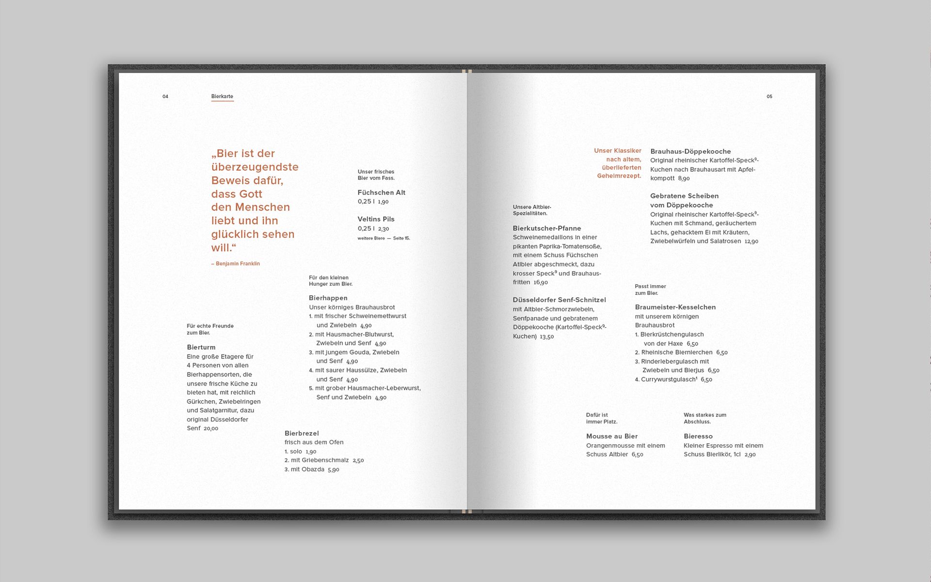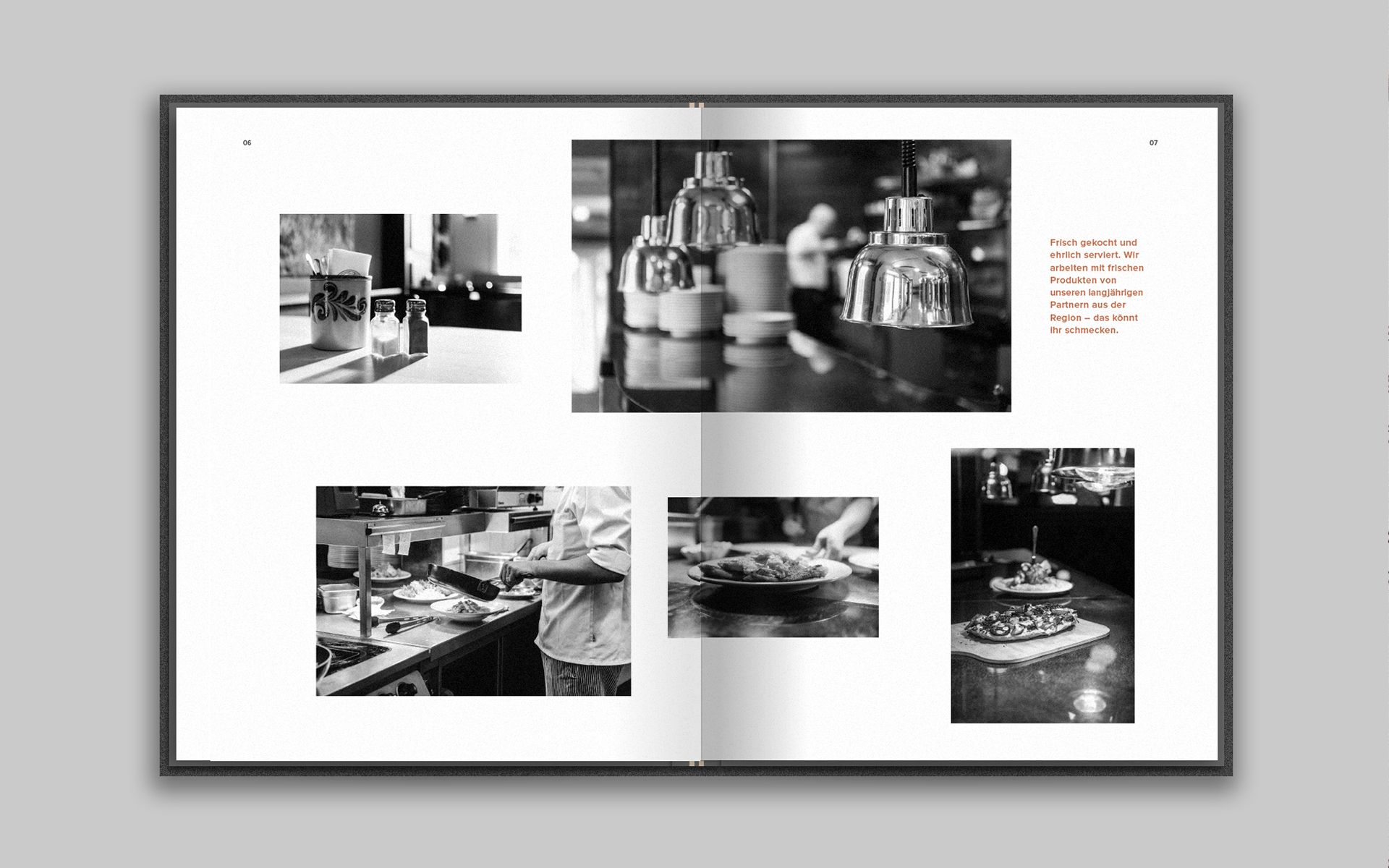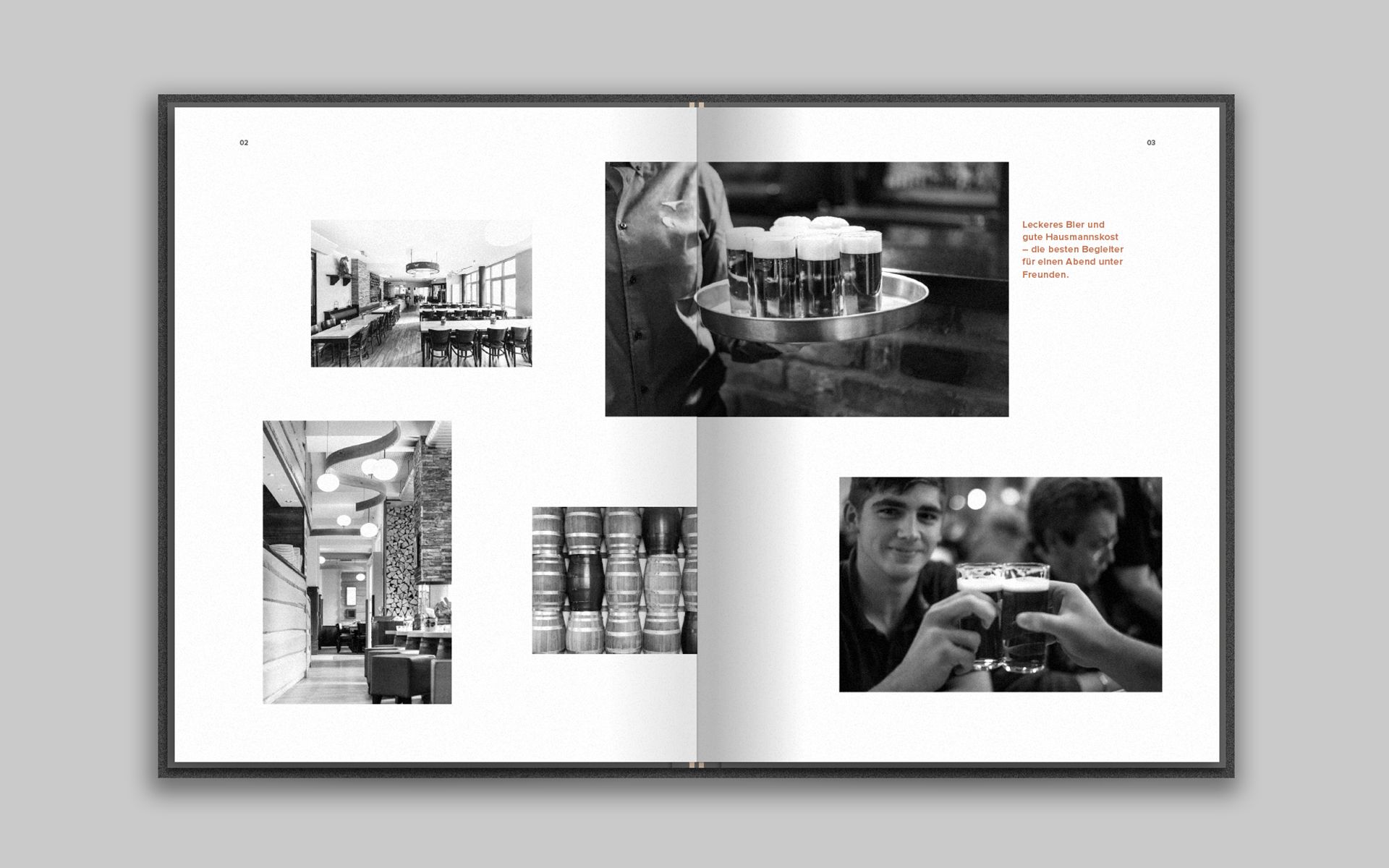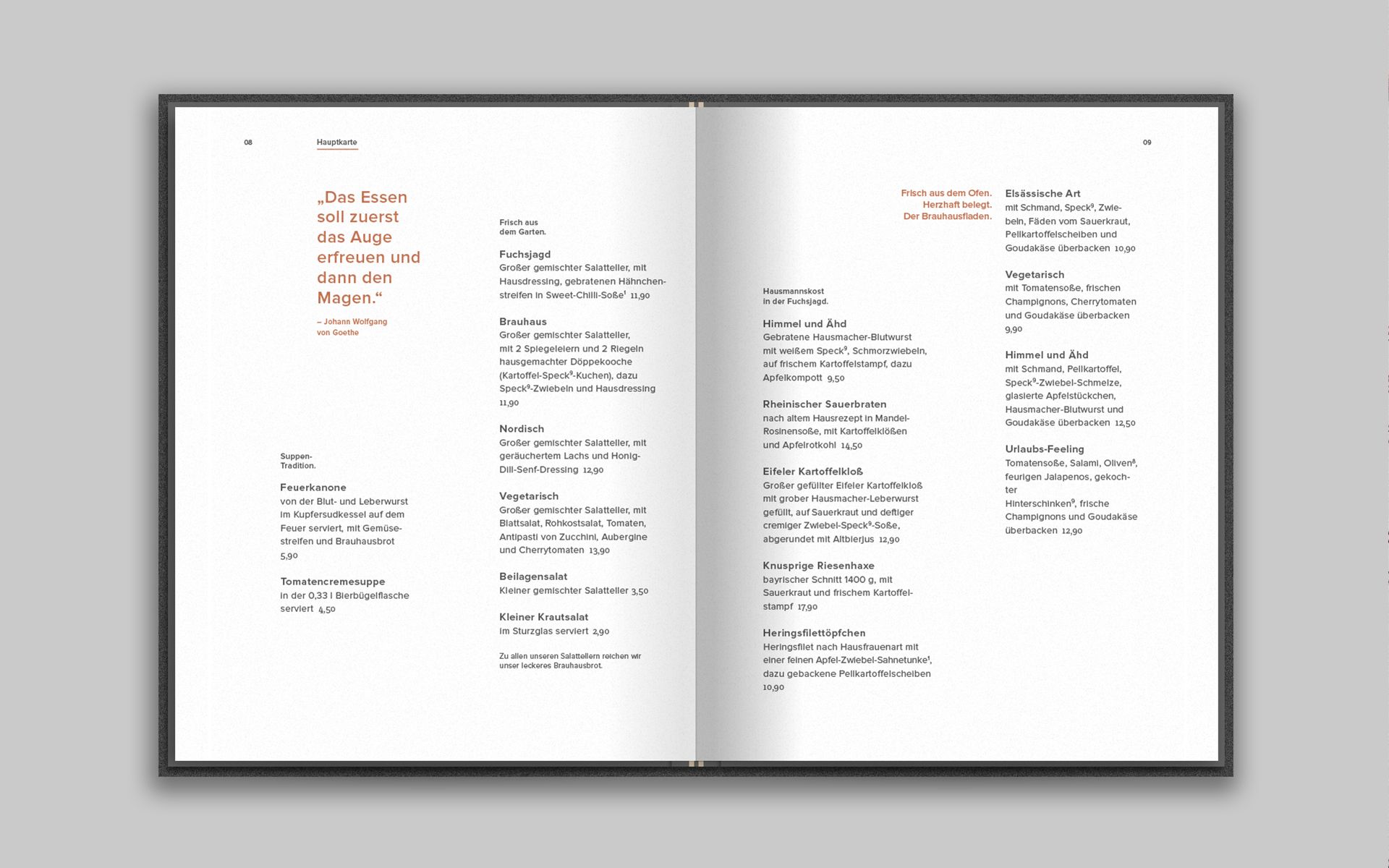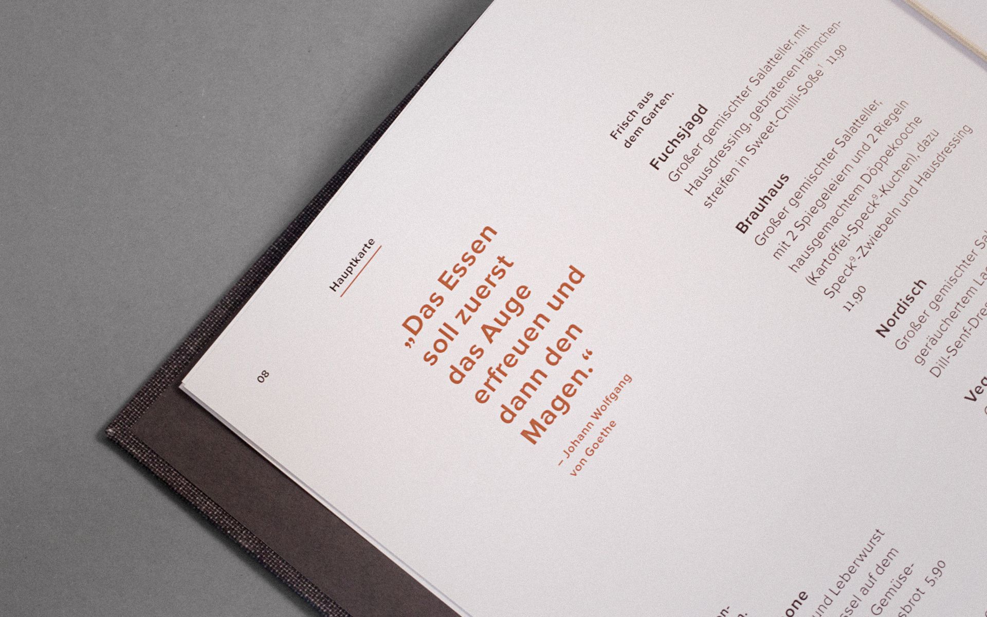 The menu is the central communication tool of a restaurant business and should, in contrast to a simple price catalogue of the dishes offered, reflect the philosophy of the business and its performance. Analogous to the concept of hunting, the guest goes on a search while reading the menu. He is accompanied by small hints on his hunt and can discover old and new delicacies. Two integrated rubber bands ensure that the menu remains flexible in its handling, can be changed at short notice, special actions and events can be announced and there is the possibility to integrate the weekly changing lunch menu into the menu.