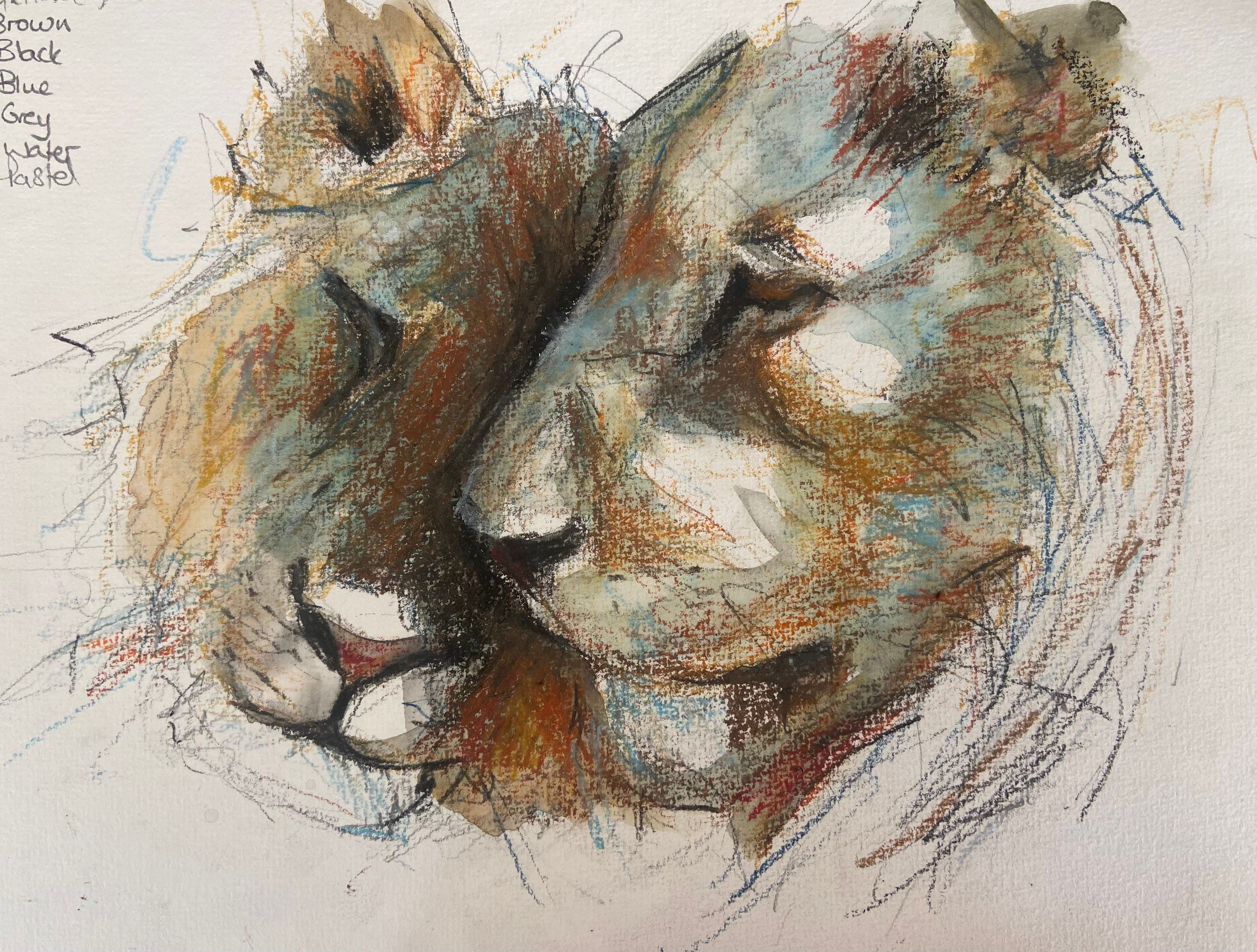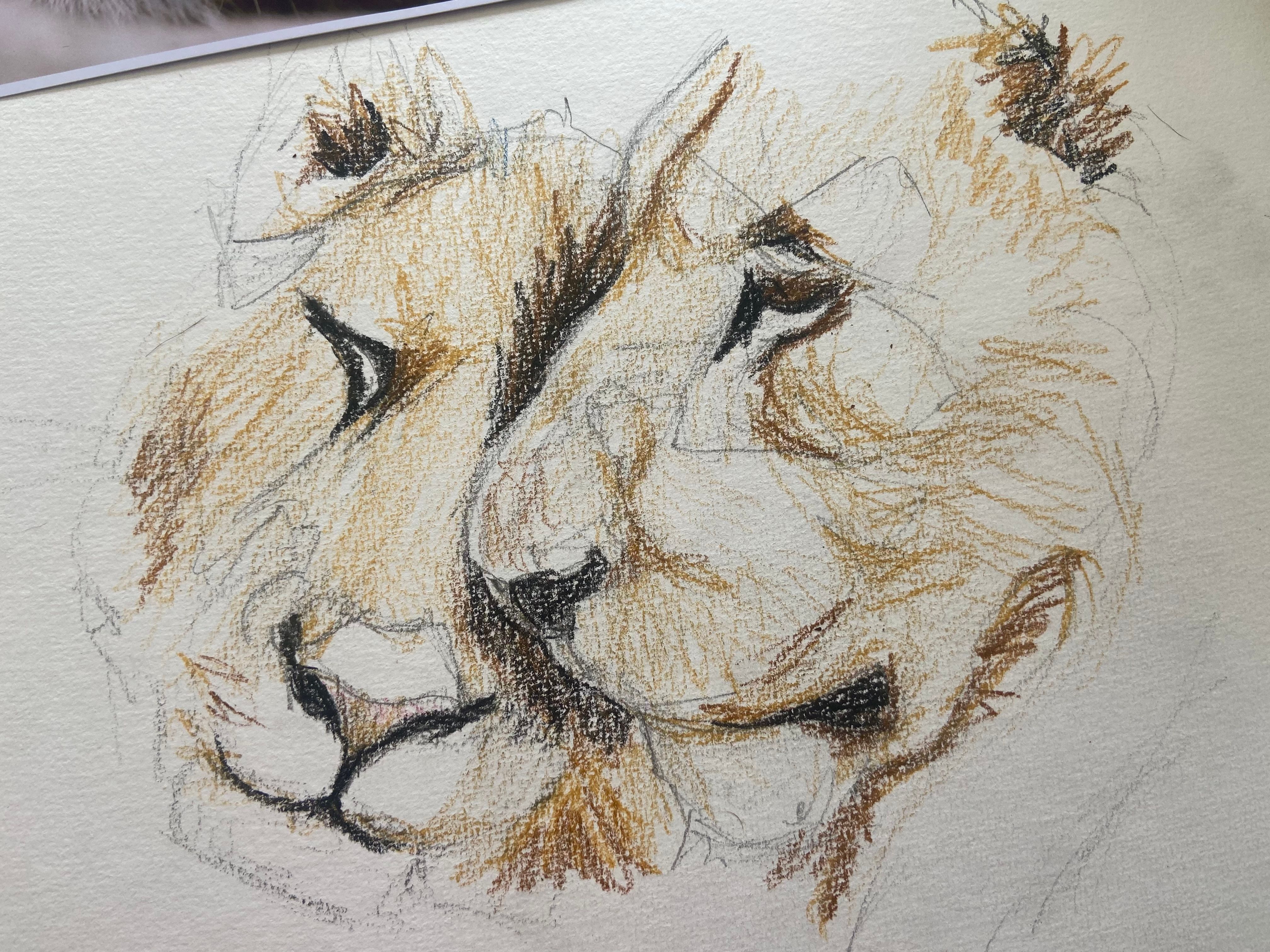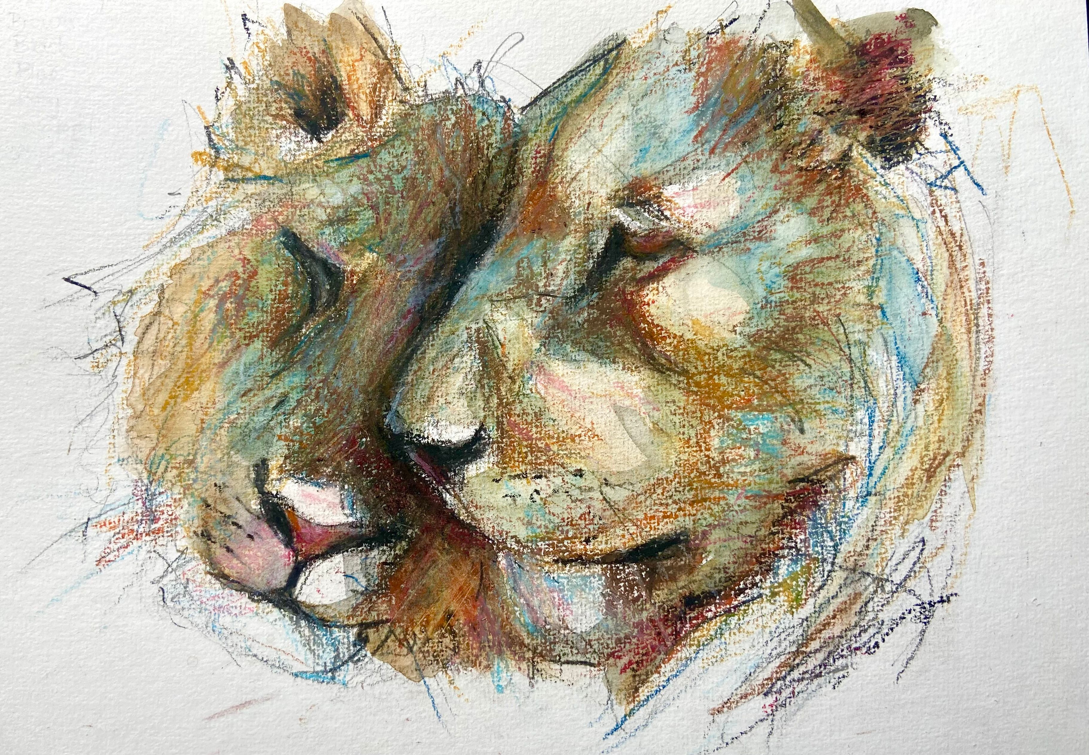 Lions en techniques mixtes utilisant des crayons aquarelles et des pastels à l'huile
