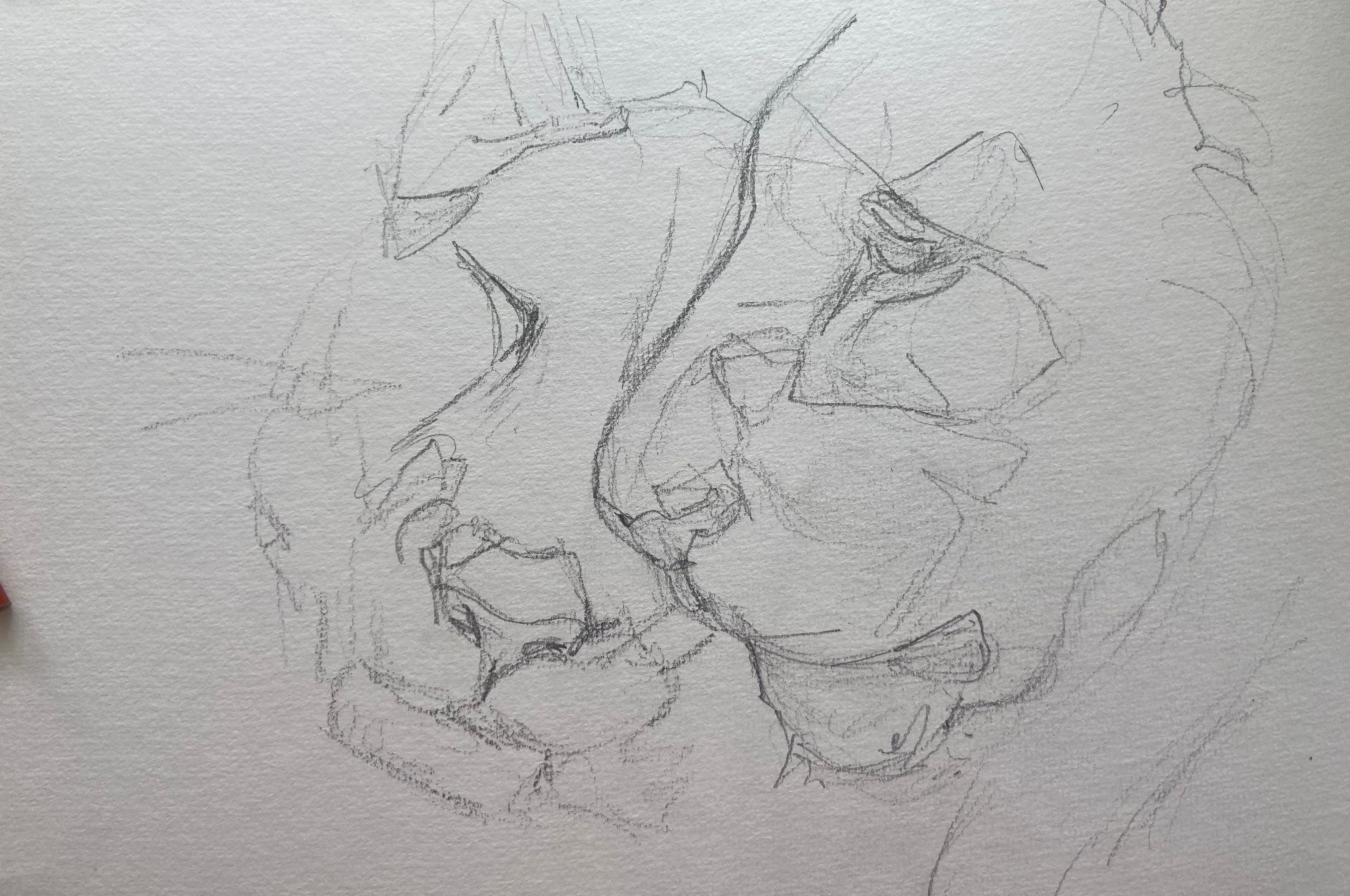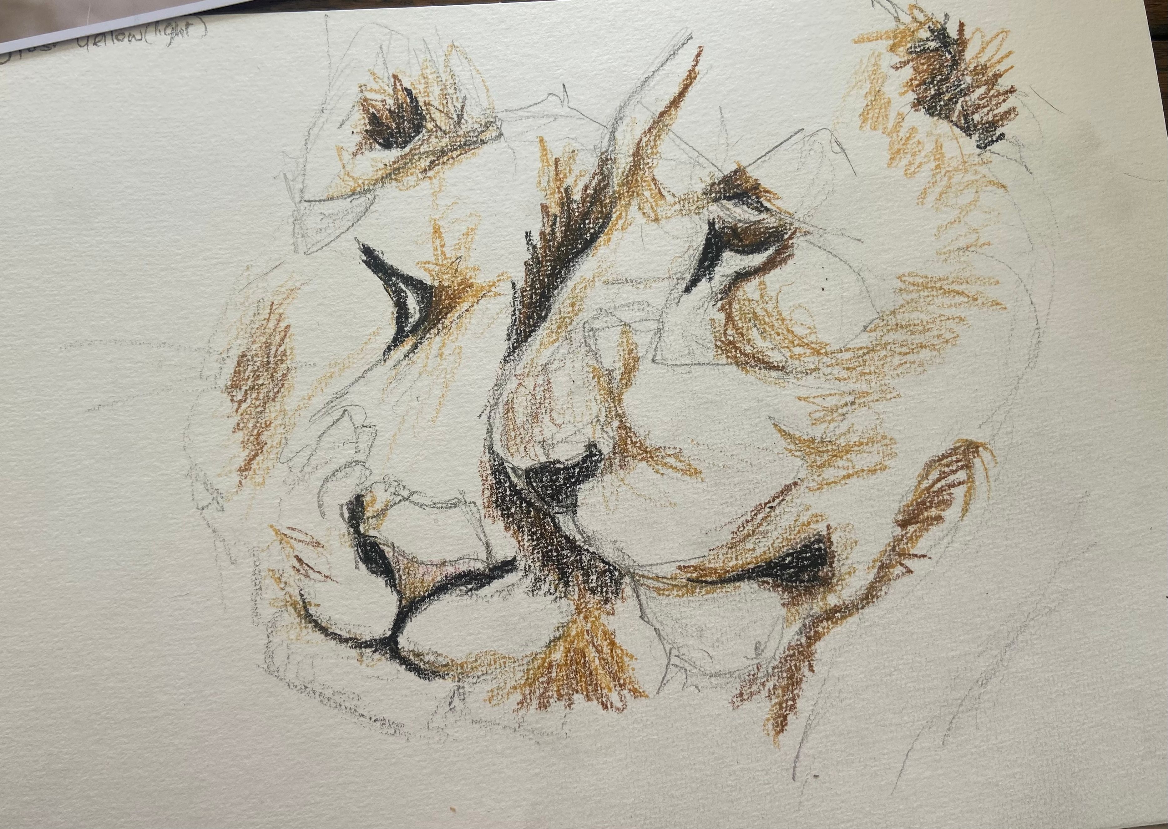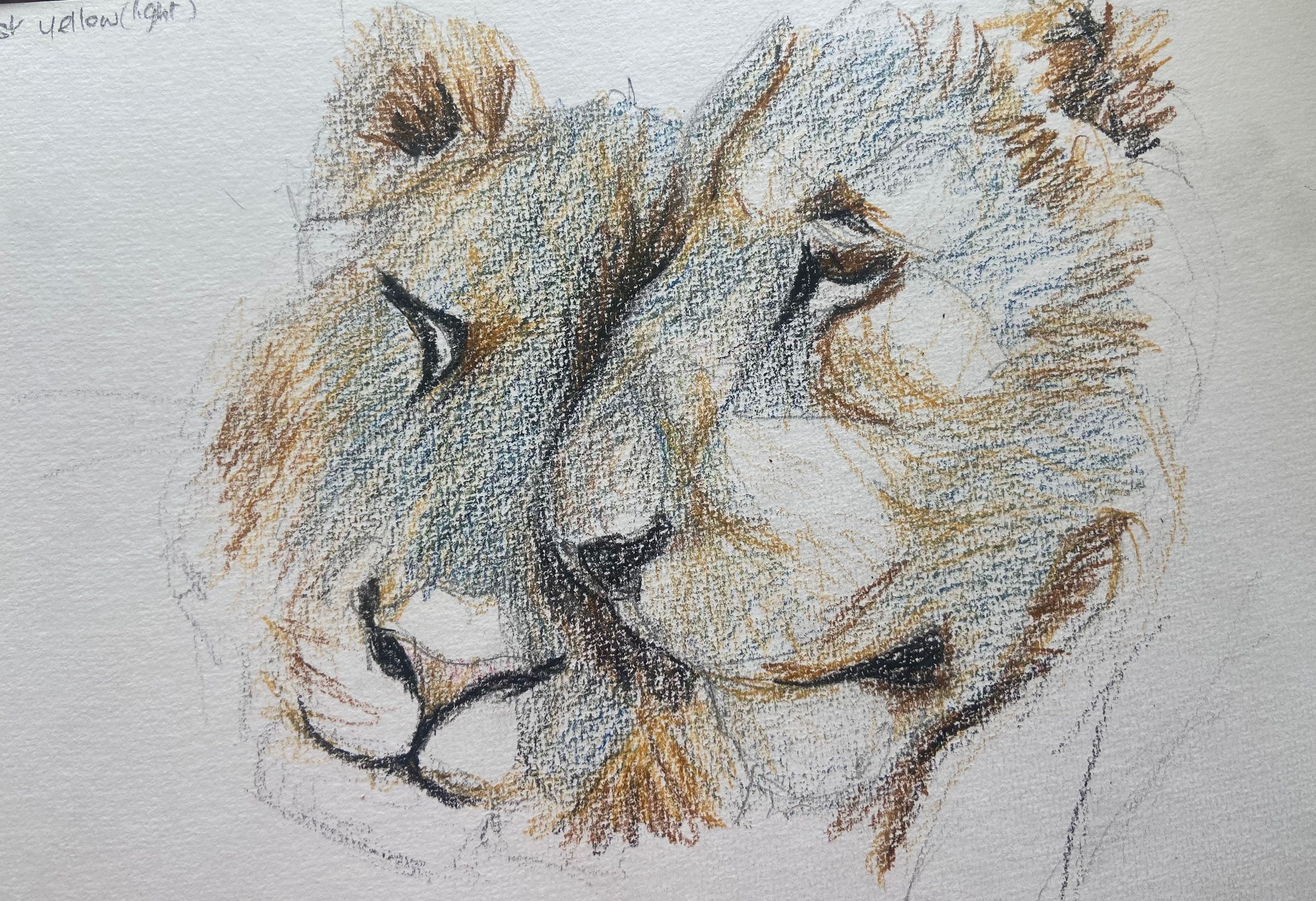 Lions en techniques mixtes utilisant des crayons aquarelles et des pastels à l'huile