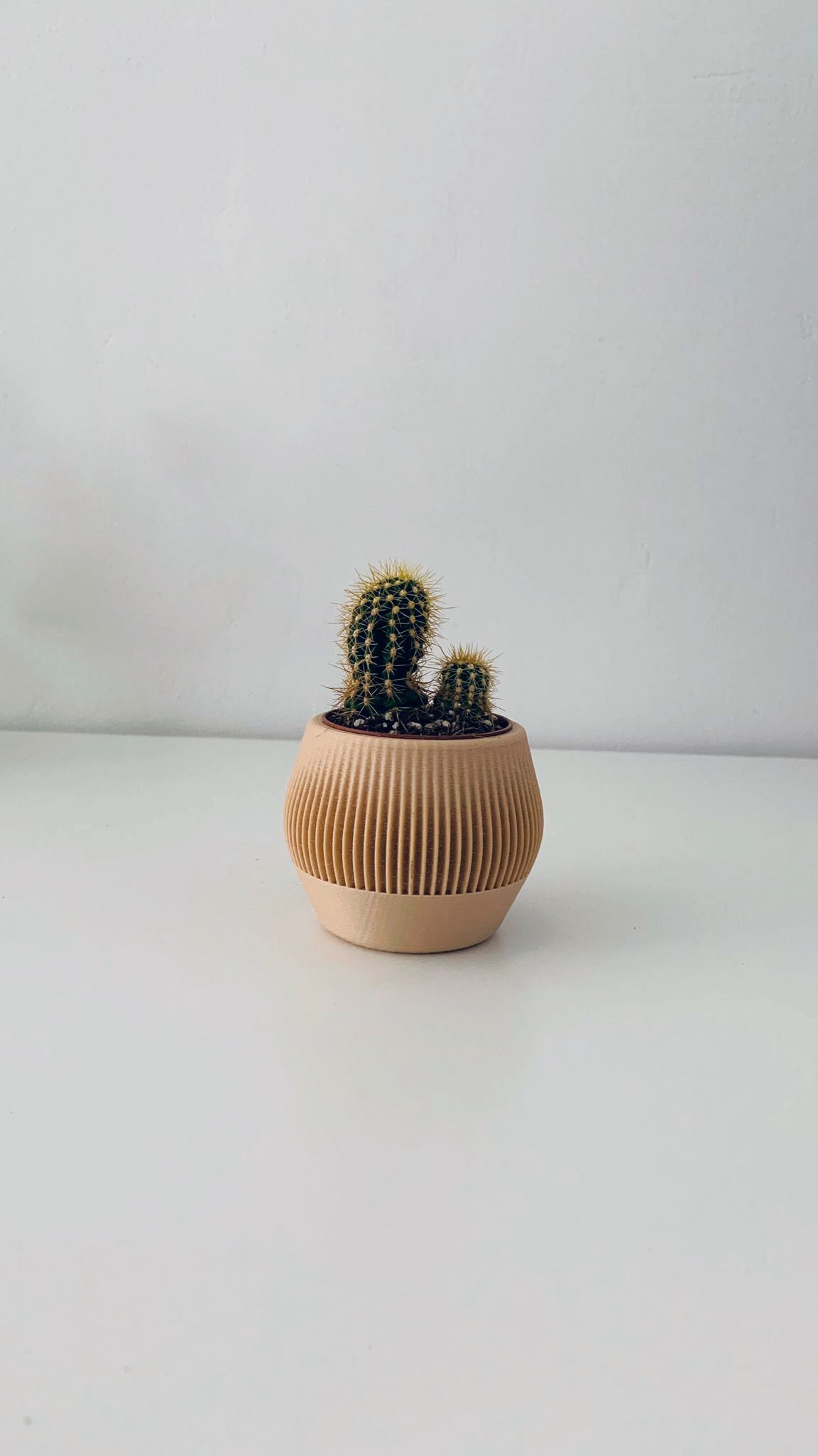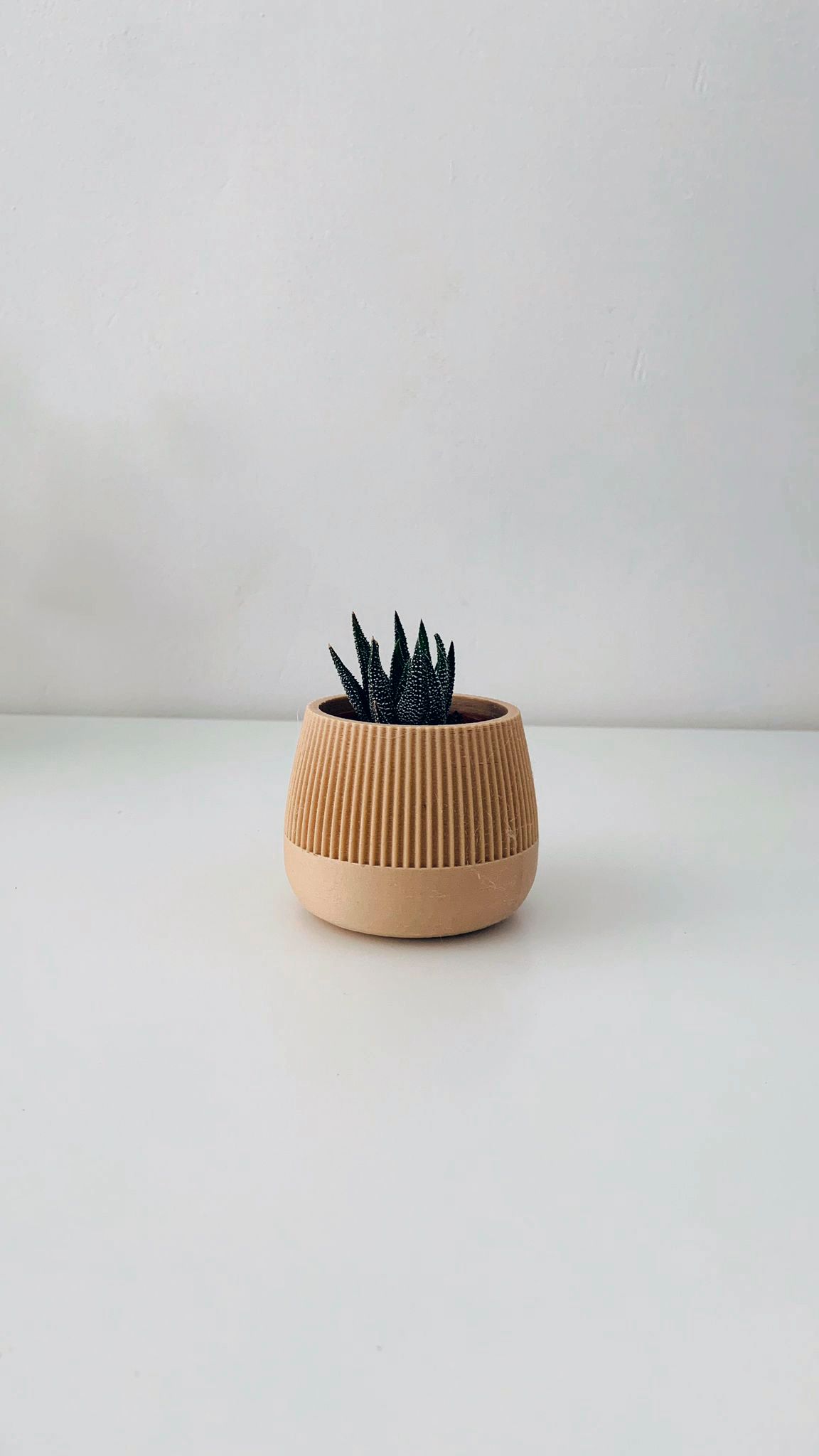 Se tratan de mini macetas impresas en 3D, utilizando un filamento de tipo madera (PLA + WOOD) y plástico (PLA + White). Su diseño se basa en el paramétrico, el cual consiste en la abstracción de una idea o concepto, relacionado con los procesos geométricos y matemáticos, que nos permiten manipular con mayor precisión el diseño para obtener los resultado deseados.