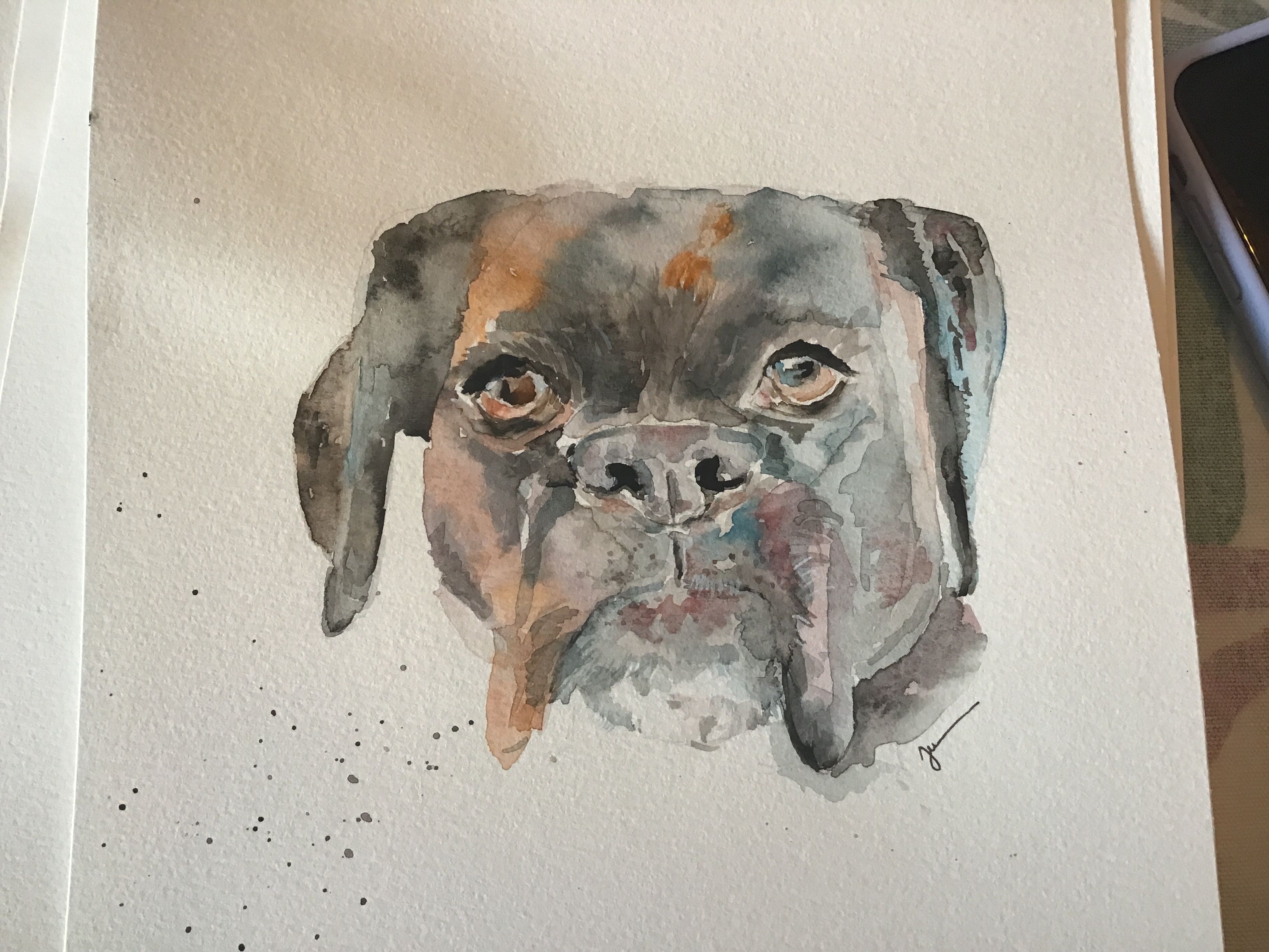Félicitations pour avoir si bien terminé les exercices du cours et aussi pour avoir réalisé un projet très individuel. Votre dernière pièce est magnifique et vous avez vraiment donné vie au chien à travers les détails dans les yeux. Vos marques de pinceau sur le reste du visage sont merveilleusement lâches et colorées. Vraiment bien fait.