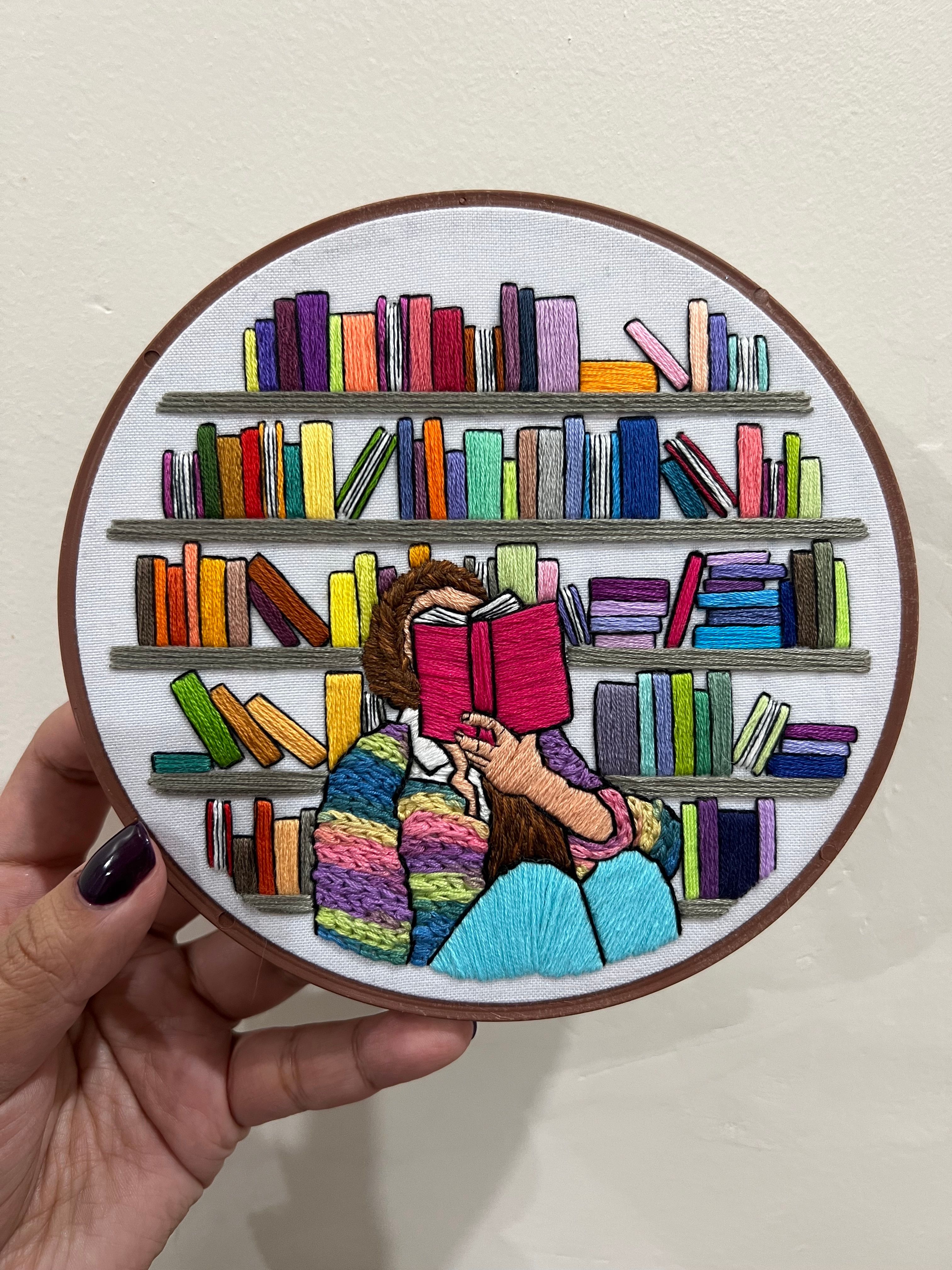 Precioso bordado,rompes con la norma y en esta creación vas al detalle de una librera y tú leyendo al frente. Captas perfectamente el ambiente que envuelve la lectura y me invitas a hacer lo mismo, a tomarme un momento para romper con la rutina y leer un buen libro con calma y en un clima de serenidad que me permita absorver mi lectura, sigue brillando ✨🍇 Rodolfo Morales