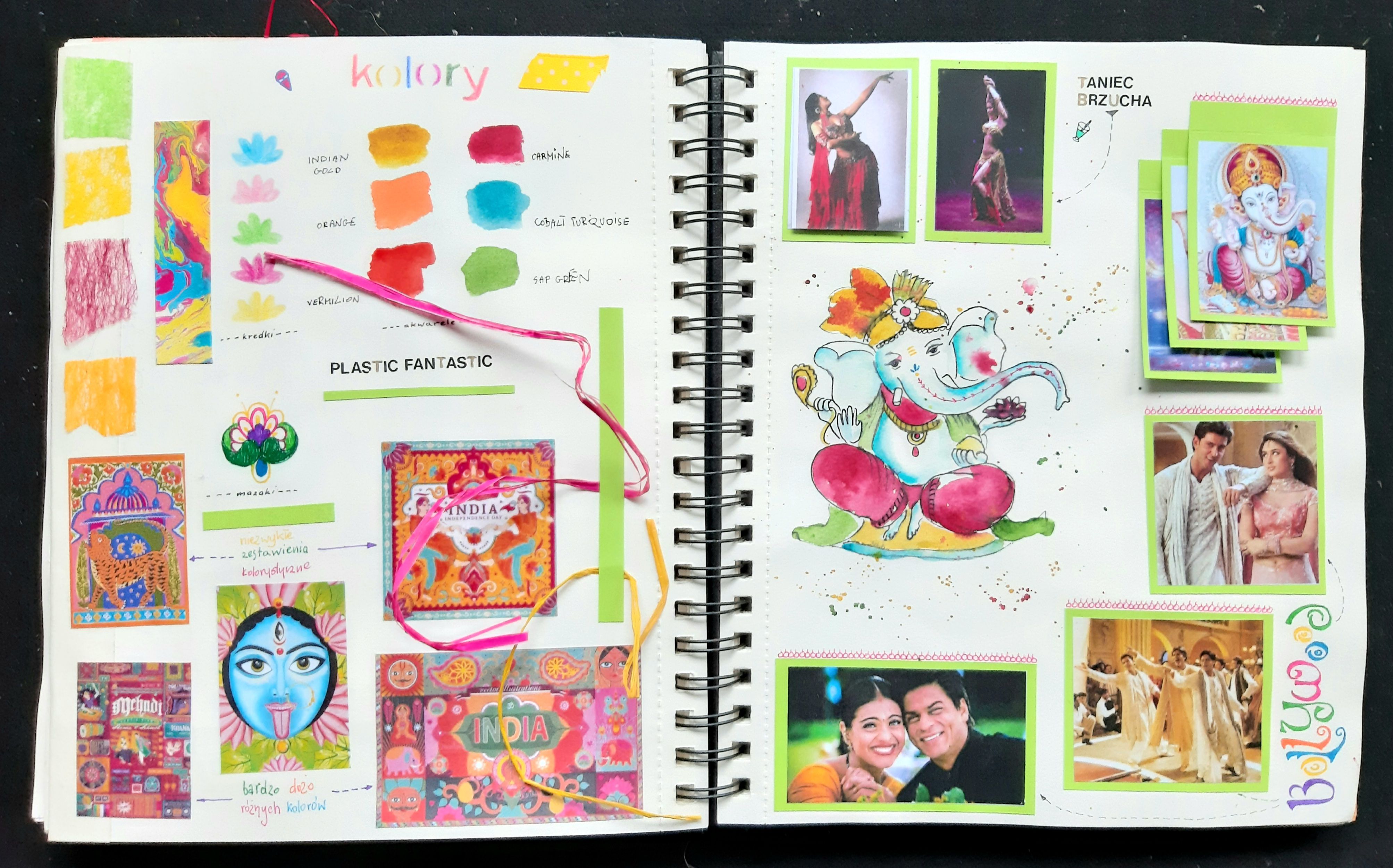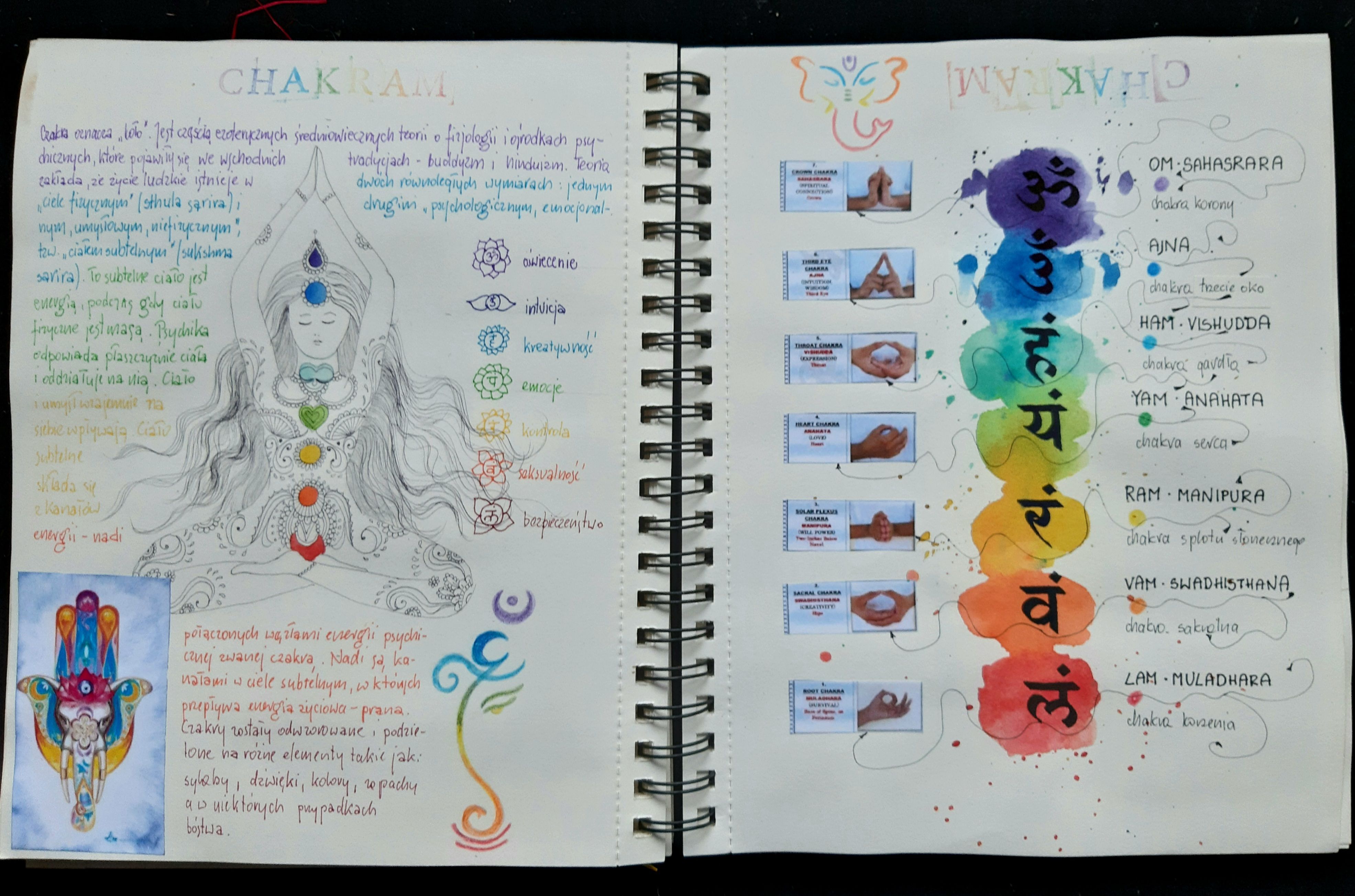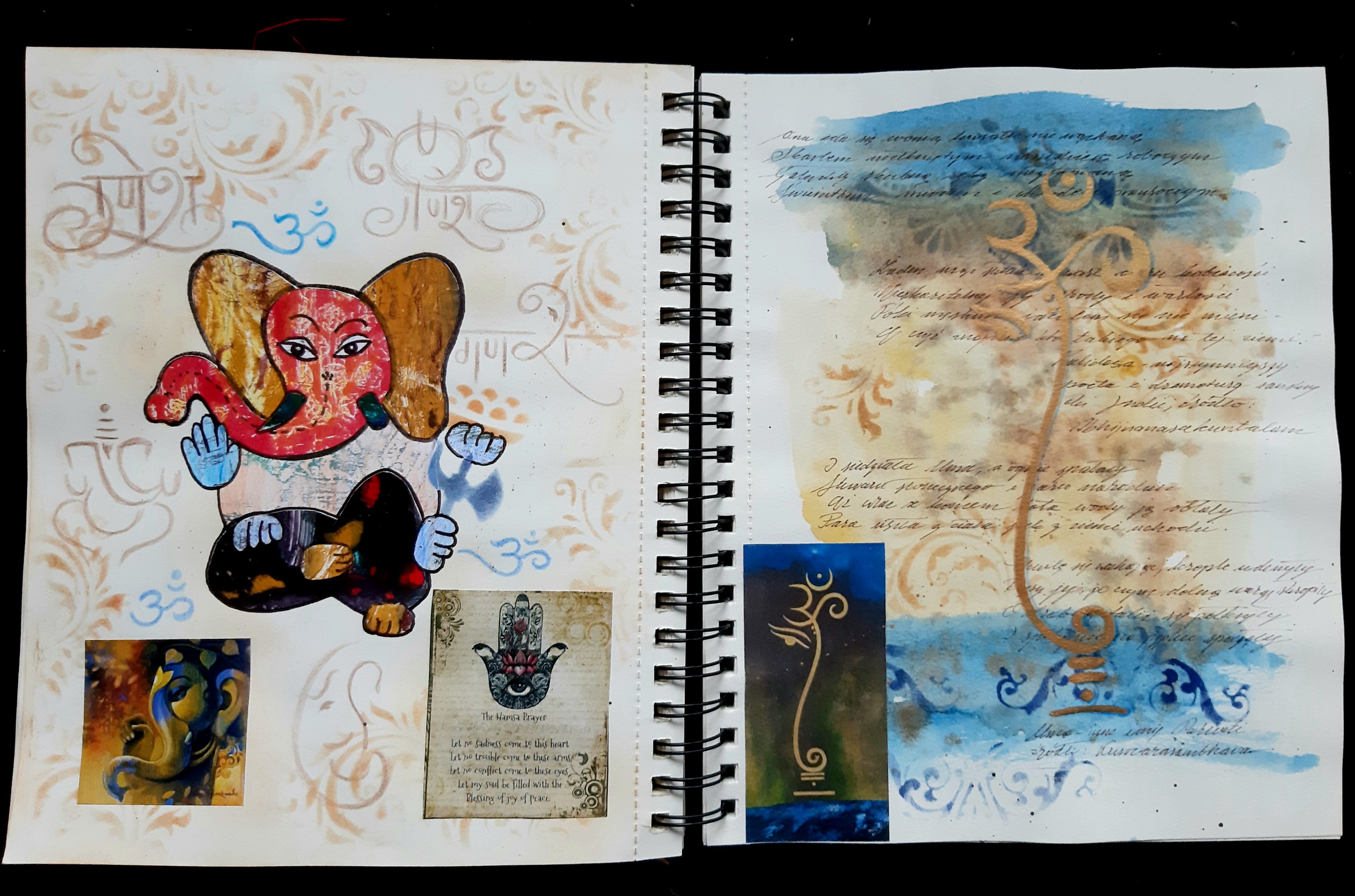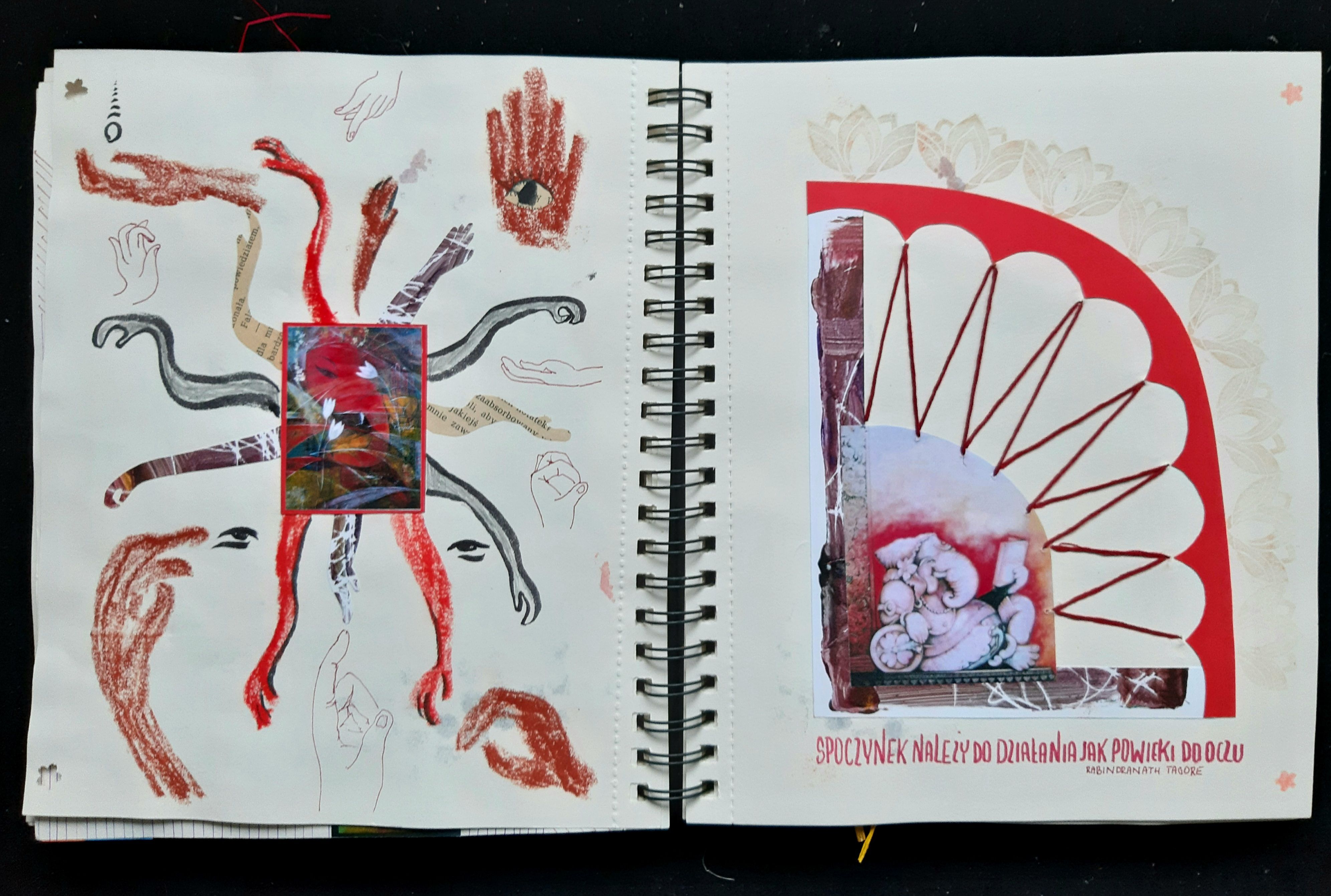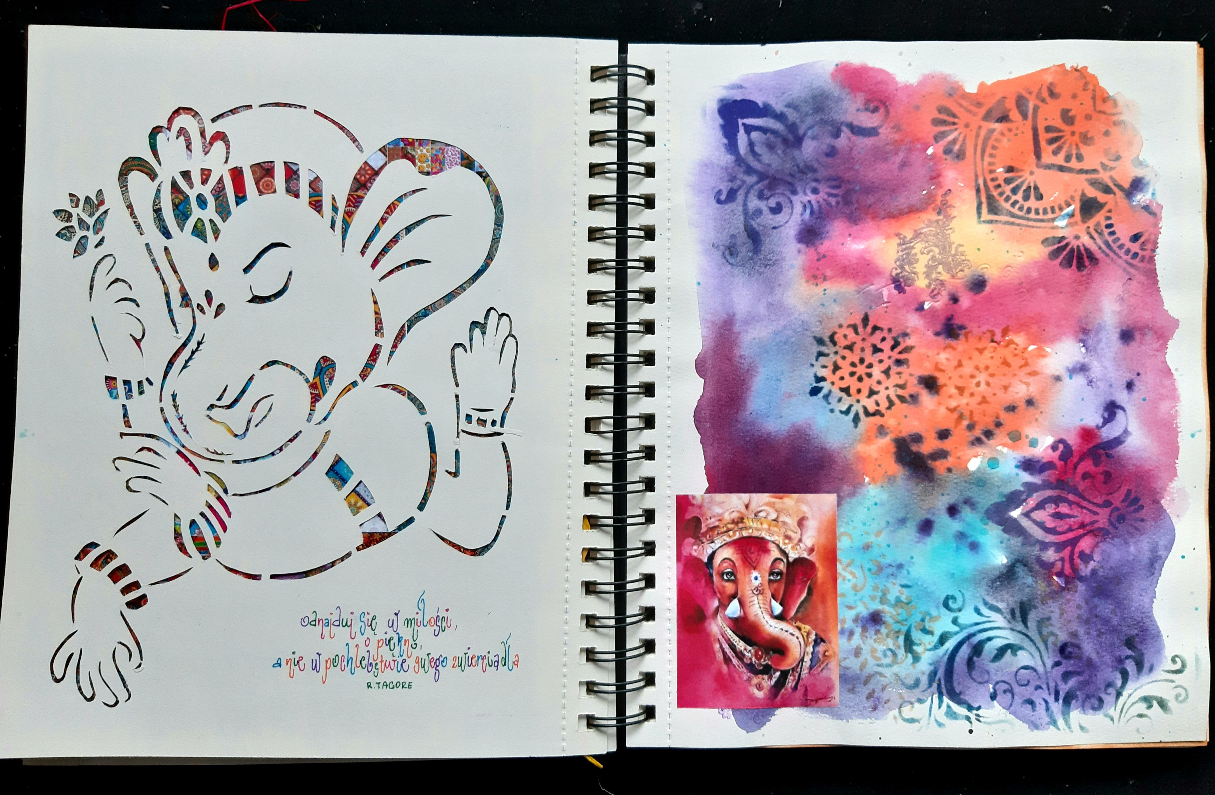 Front page. Ganesha is an elephant-headed Hindu god. I decided to do a project about it because Indian culture is completely card two. On the left side, cutouts of Ganesha with descriptions of the attributes he has. On the right side there are stampscard three. On the left - research on Ganshi's companion mouse. On the right - I learned Devanagari script especially for thiFourth card - about the festival of GaneshiFifth card - impression on many hands of Ganesha (left side), Ganesha resting - sewn with red thread (right side)card six. On the left side - back with embroidery + cut-out. On the right side there is Ganesha and a poem by a Hindu poet trCard seven, added - three-dimensional cutoutCard eight - research on colors that I associate with India and certain phenomena with which I associate this region of the wCard nine - other associations with India, colors orange, brown, gold...Tenth card - further associations with India: mandalas.Card eleven - on the left - Indian patterns, on the right - Ganesha cut out in a sheet of sketchbook so that the colors from Card twelve - reverse of cards eleven, on the right - research on Indian patterns and colors (watercolor + stencil stamps)Card thirteen - continuation of research on eastern patternsKarta czternasta - Indie kojarzą mi się z jogą (na którą regularnie uczęszczam). Tu badania na temat chakr.Card fifteen (not the last). On the left, a collage of monotype sheets, on the right - a poem by an Indian poet against the b