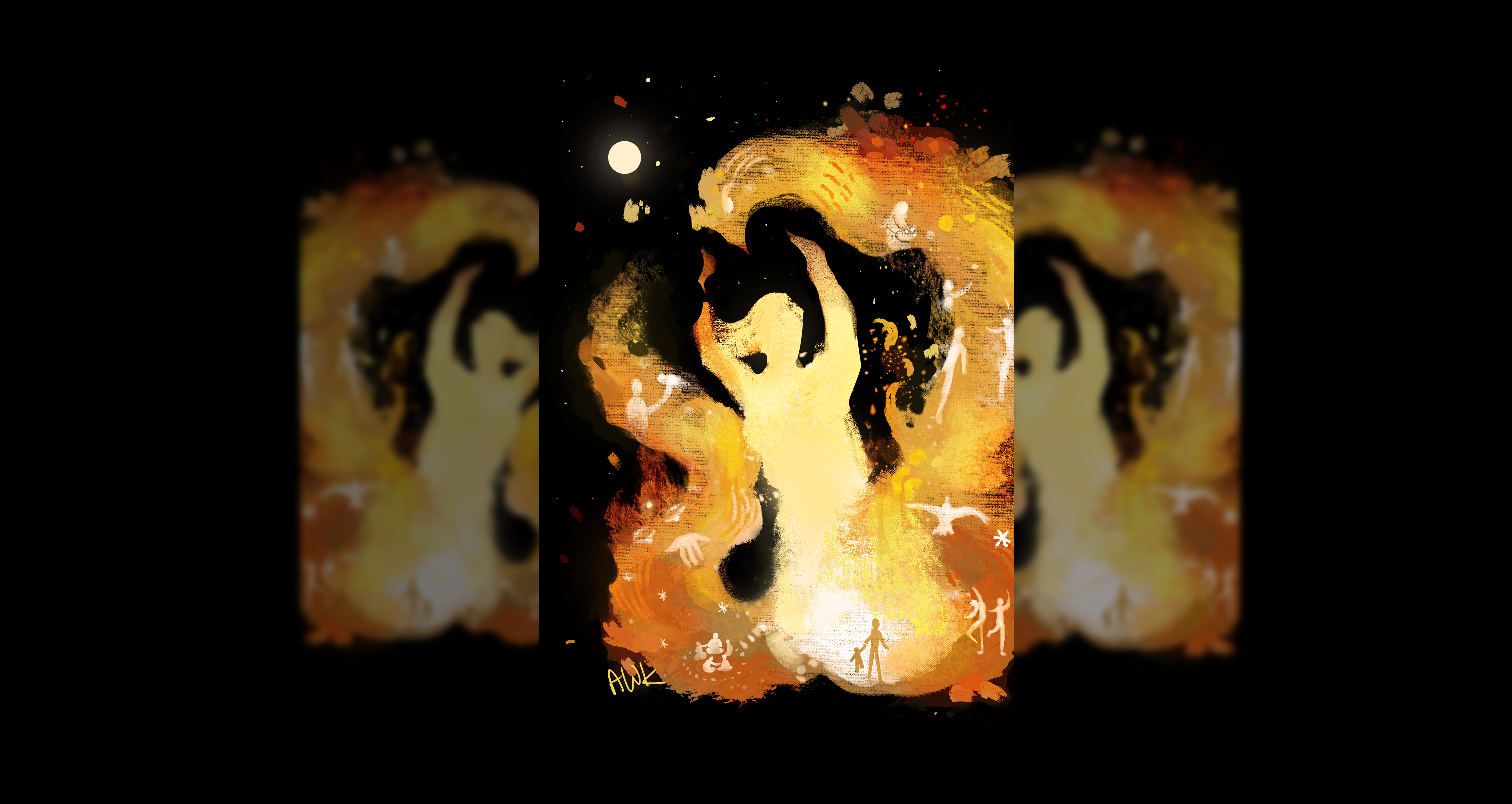 As the name suggests, the main theme of the work is sacred fire and connecting with the ancestors through it. There are also hidden symbols of rebirth, freedom and wildness in it.