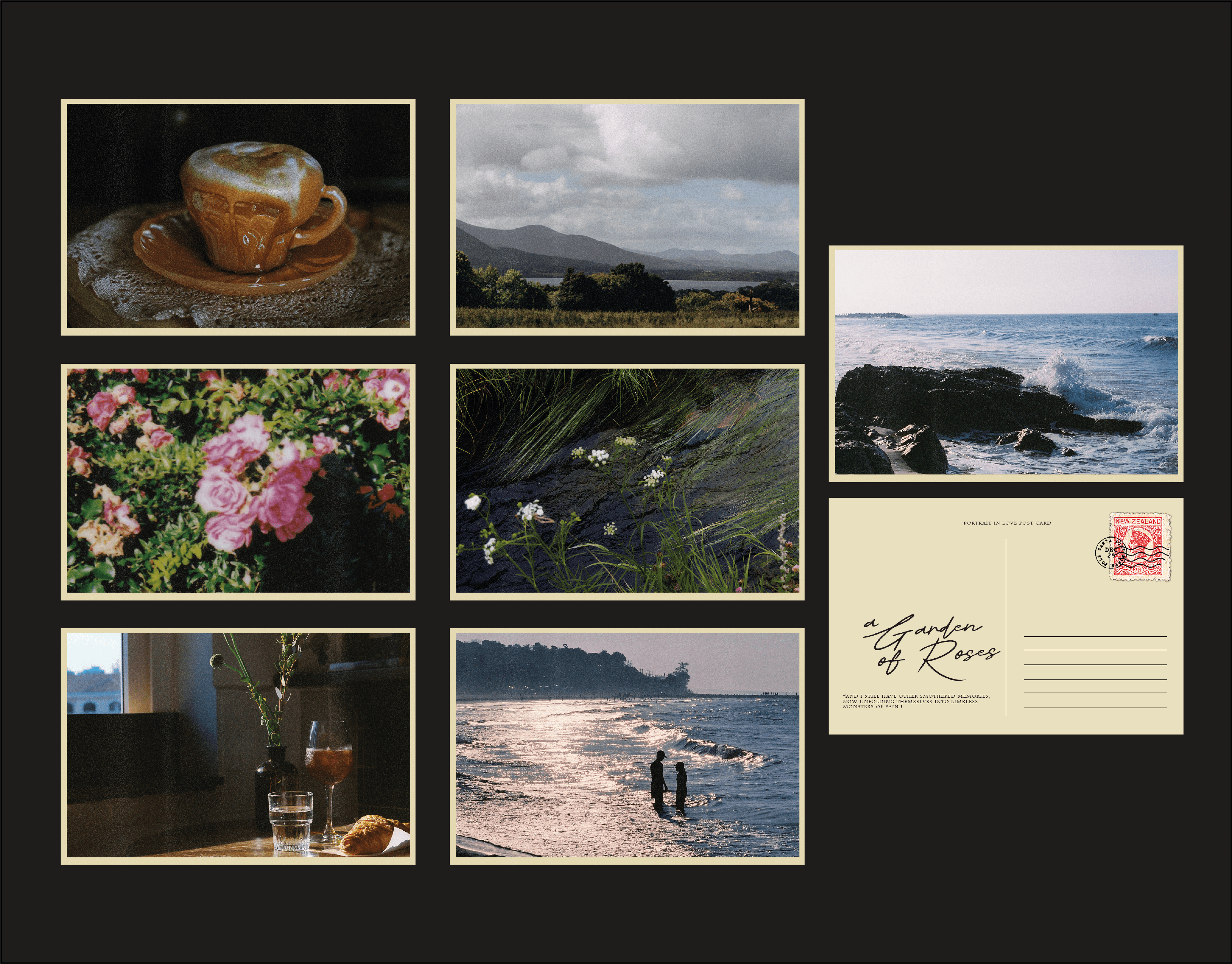 esp. portrait in love es una colección de postales nostálgicas que representan una selección de canciones pertenecientes al álbum “portrait in love” de rook1e y softy. el álbum forma parte del género musical “lo-fi”, caracterizado por su evocación a las emociones positivas, la relajación y la nostalgia. cada fotografía asignada a un título busca su representación, no limitándose exclusivamente a su significado literal, sino también a la esencia de la melodía y el lenguaje musical de cada canción.