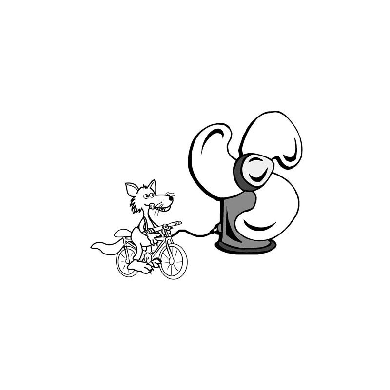 O porquinho não gostou nada do desafio do lobo. Ele olhou por um buraquinho e viu o lobo ir embora, mas logo ele voltou numa bicicleta com um ventilador enorme!