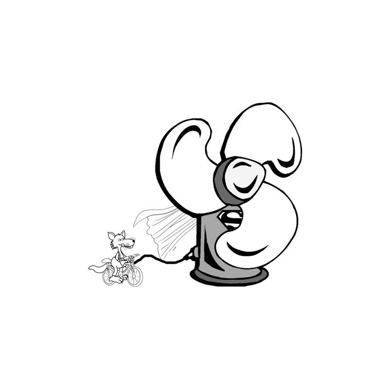 O lobo tentou soprar de novo, mas não adiantou. Ele pegou seu ventiladorzão, pedalou e pedalou, mas a casa só balançou um pouquinho de nada. Então ele teve outra ideia e criou um super mega vetiladorzão!