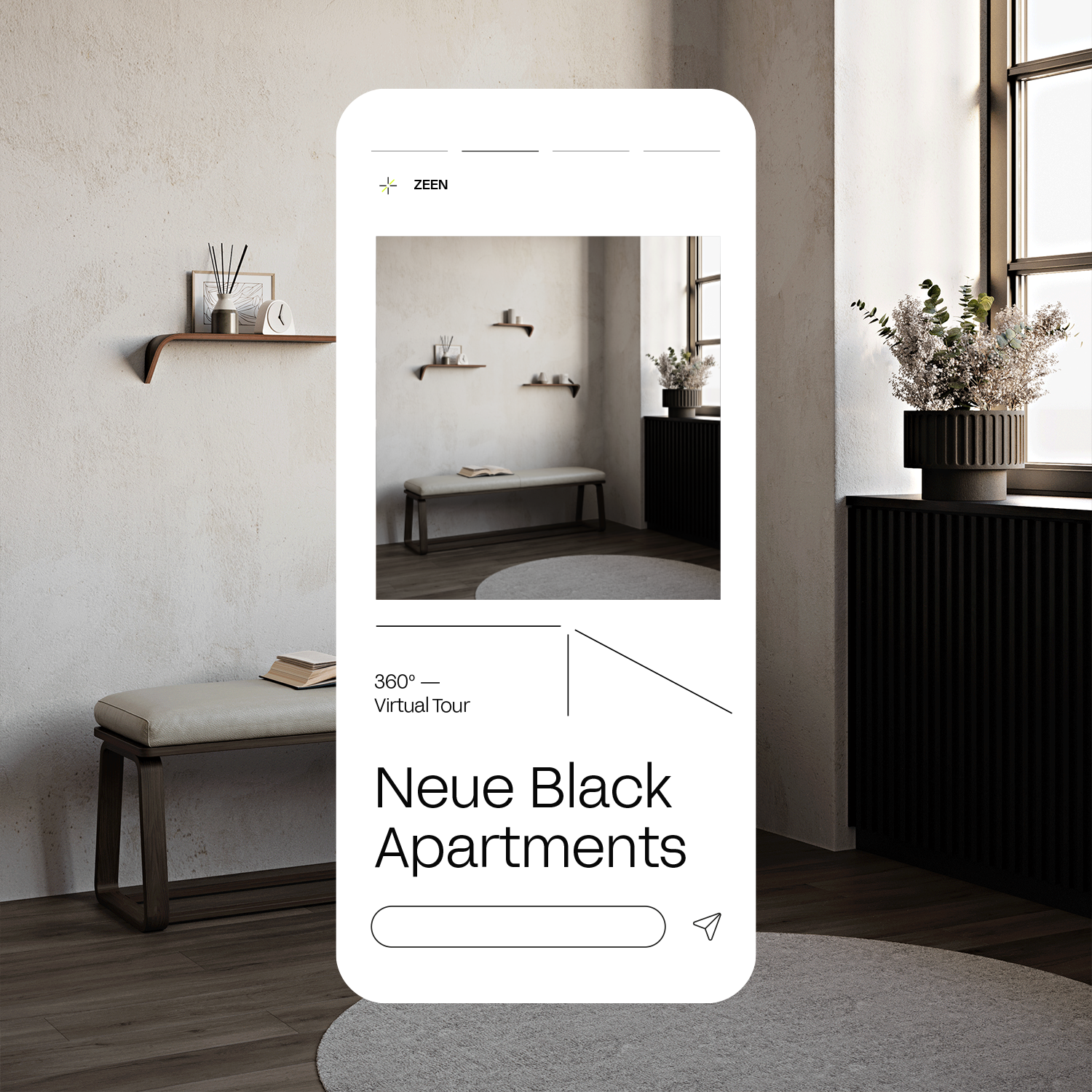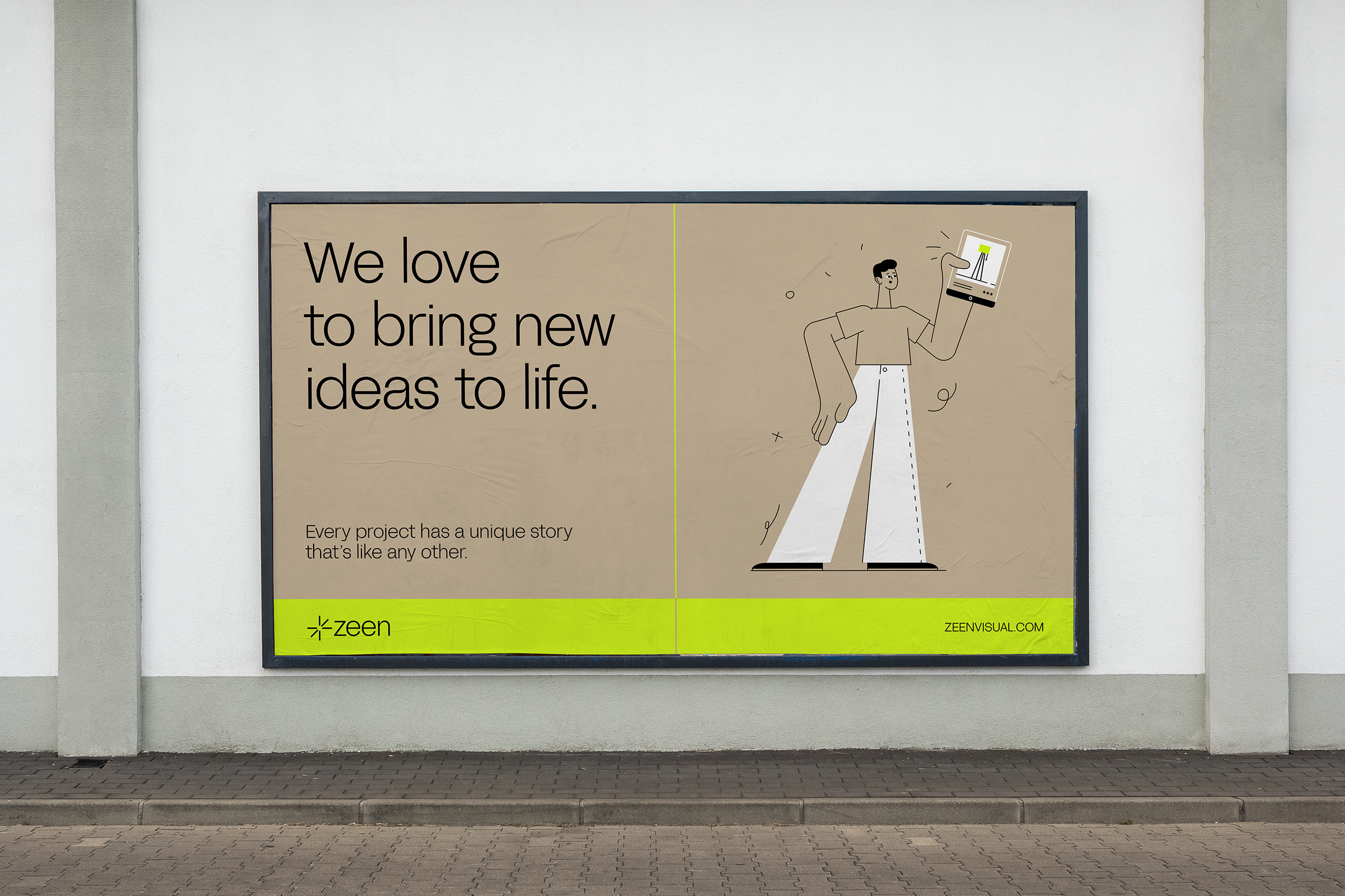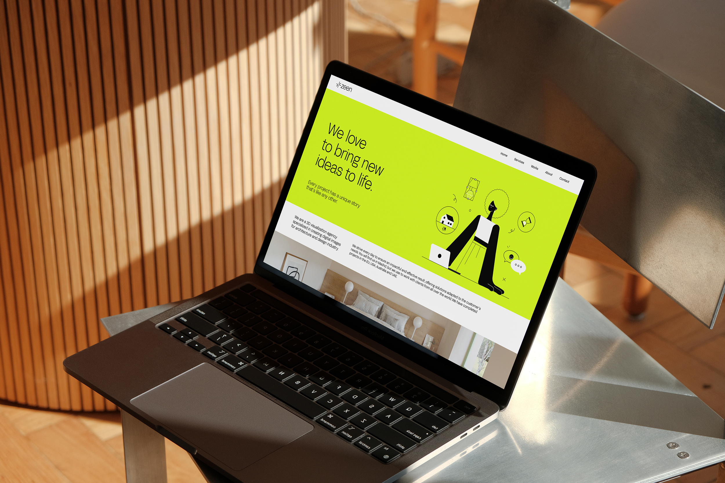 Zeen es un estudio de visualización 3D que trabaja[1] ba con estudios de arquitectura, el sector industrial e interioristas, para materializar sus ideas en renders realistas. El reto que nos planteaban era conjugar en una nueva identidad su beneficio racional "hacer tangible lo intangible" con su beneficio emocional "la confianza en un partner que me ayuda a dar el salto del proyecto a la realidad".