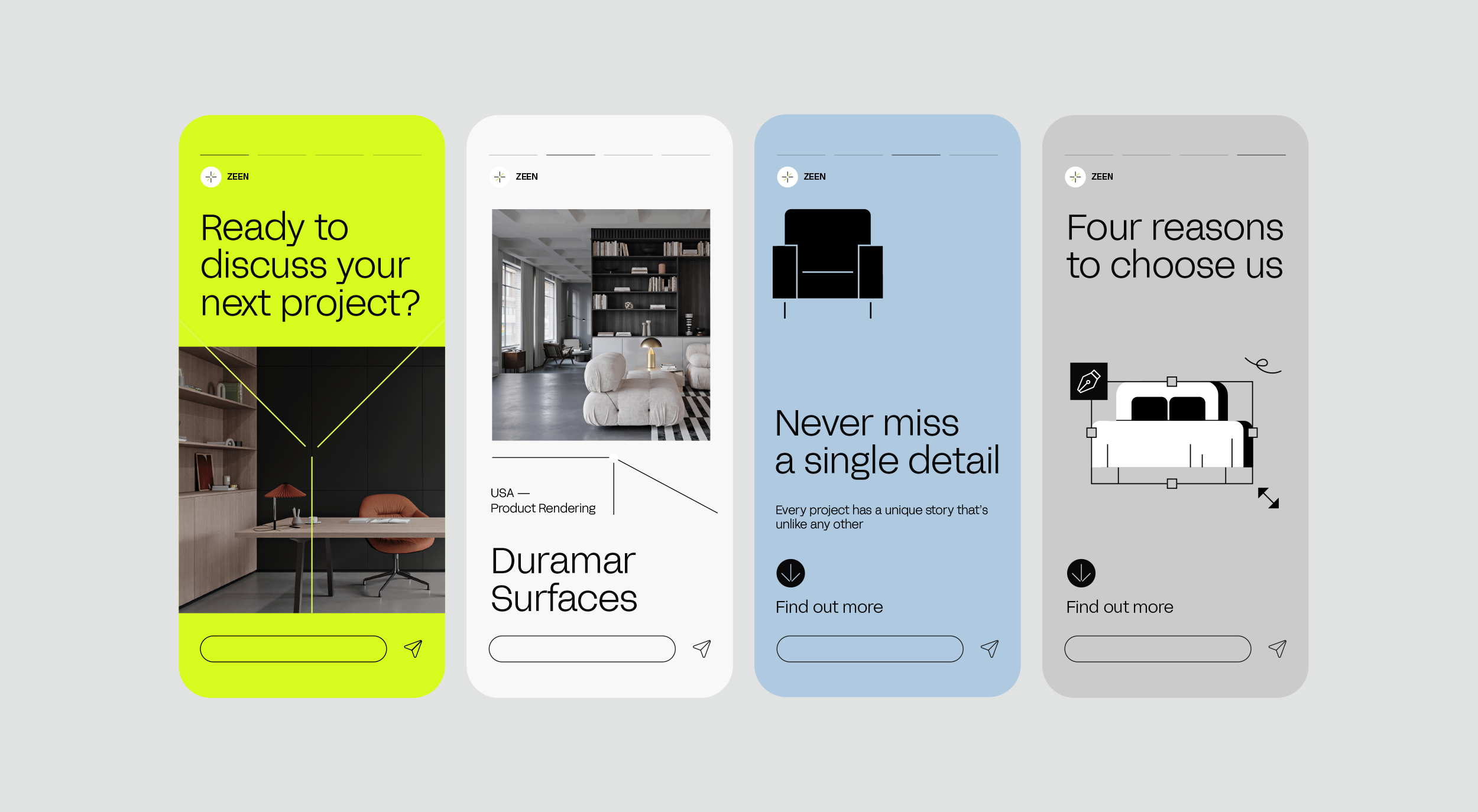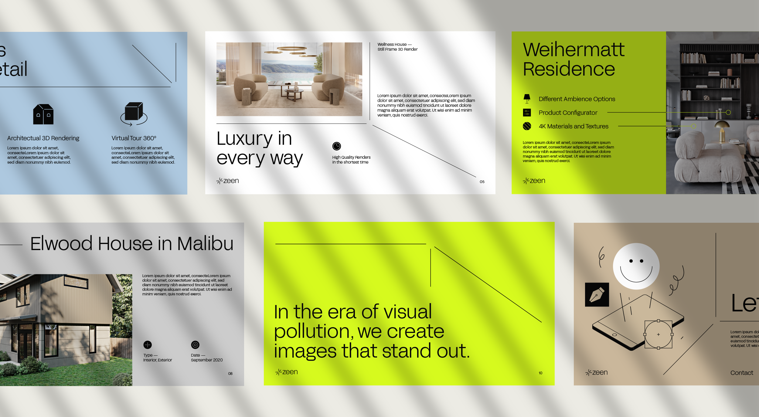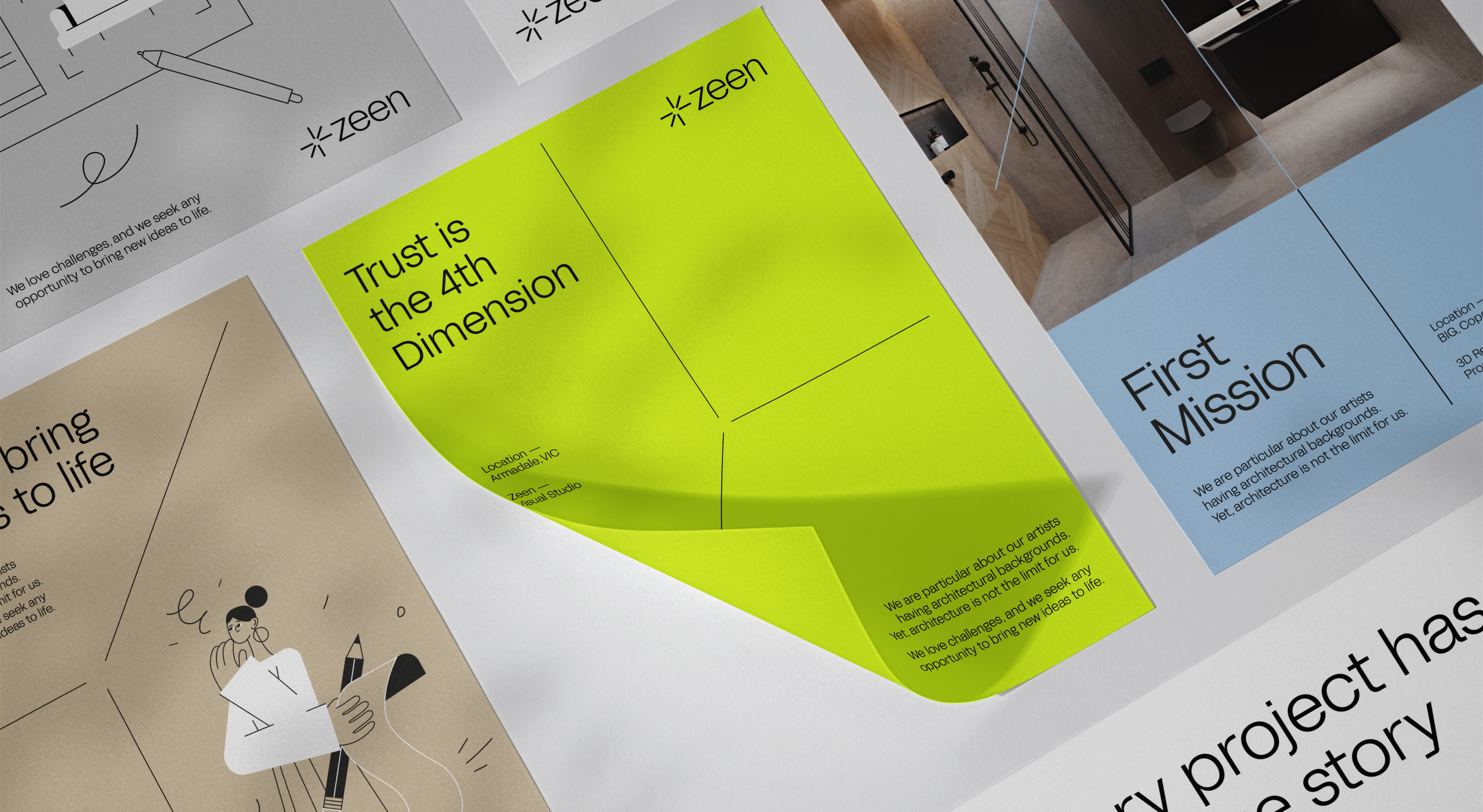 El sistema visual se basa en el juego con los ejes del espacio, incluso en el layout de las piezas. Esto no solo es una referencia al trabajo tridimensional de Zeen, sino también una manera de subrayar el enfoque de la empresa de transformar conceptos y diseños en creaciones visuales tridimensionales y realistas.