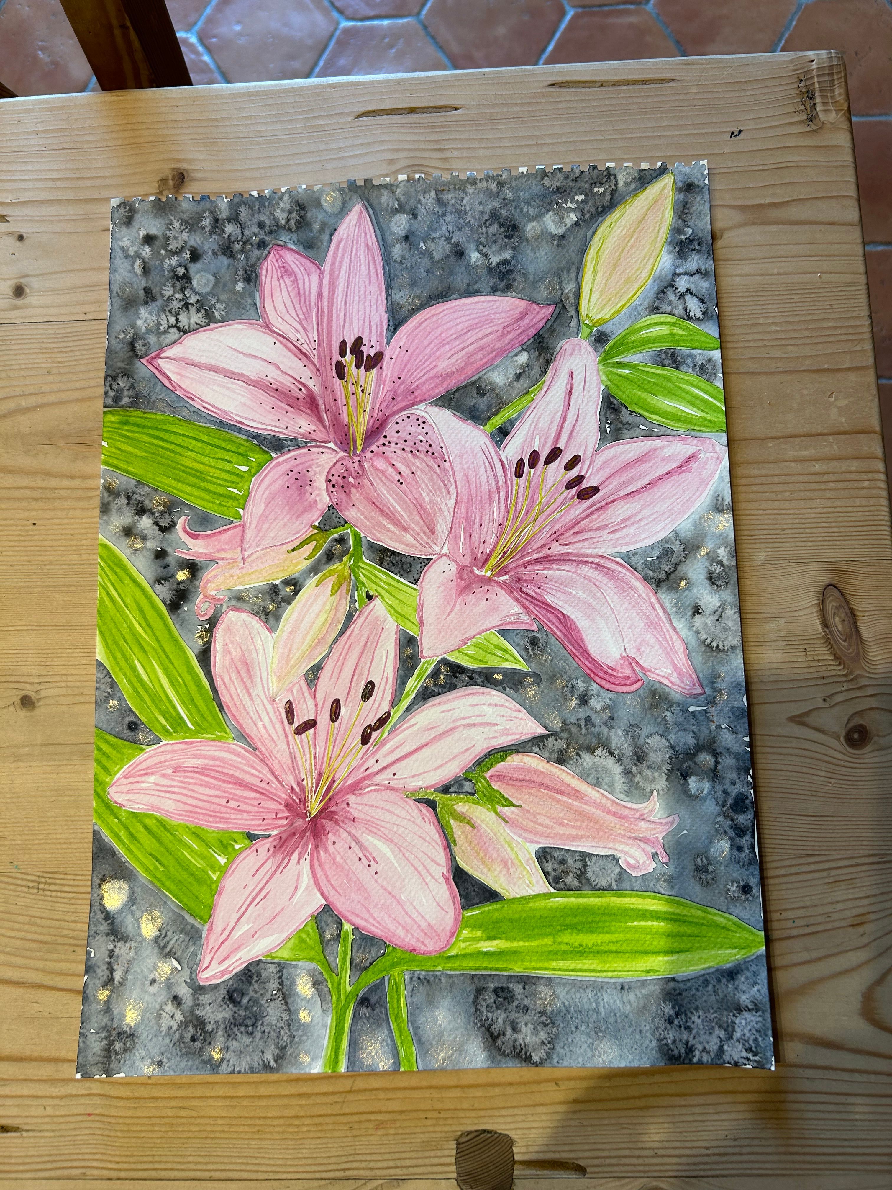 Ana Victoria Calderon est pour moi une artiste inspirante. Je viens de débuter l’aquarelle et j’ai essayé de mettre en pratique toutes les techniques enseignées dans le cours sur la peinture que je vous poste