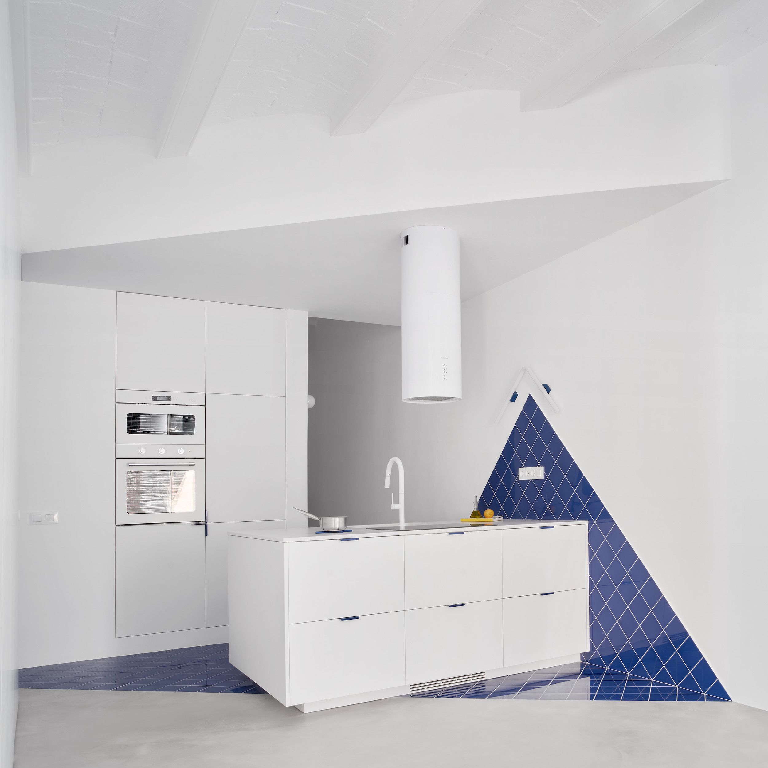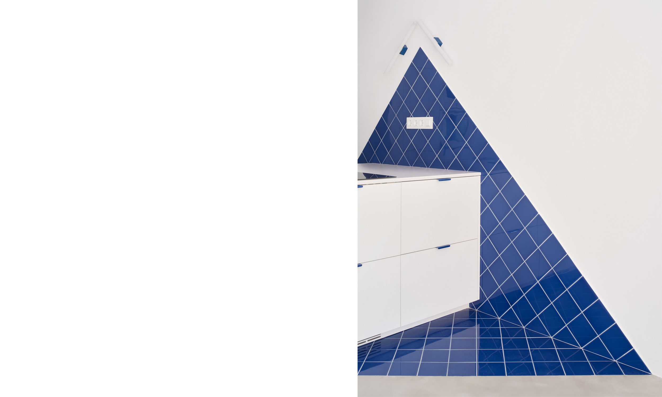 La cuisine, transformée en meuble, devient l'épicentre du projet. De son côté, l'utilisation de carreaux émaillés contribue à souligner et à définir l'espace de circulation qui lui est associé. Parallèlement, elle efface ses limites en s'ouvrant sur les autres pièces. La salle de bains fonctionne comme un conteneur intégrant des panneaux amovibles, permettant ainsi de cloisonner l'espace selon les besoins.
