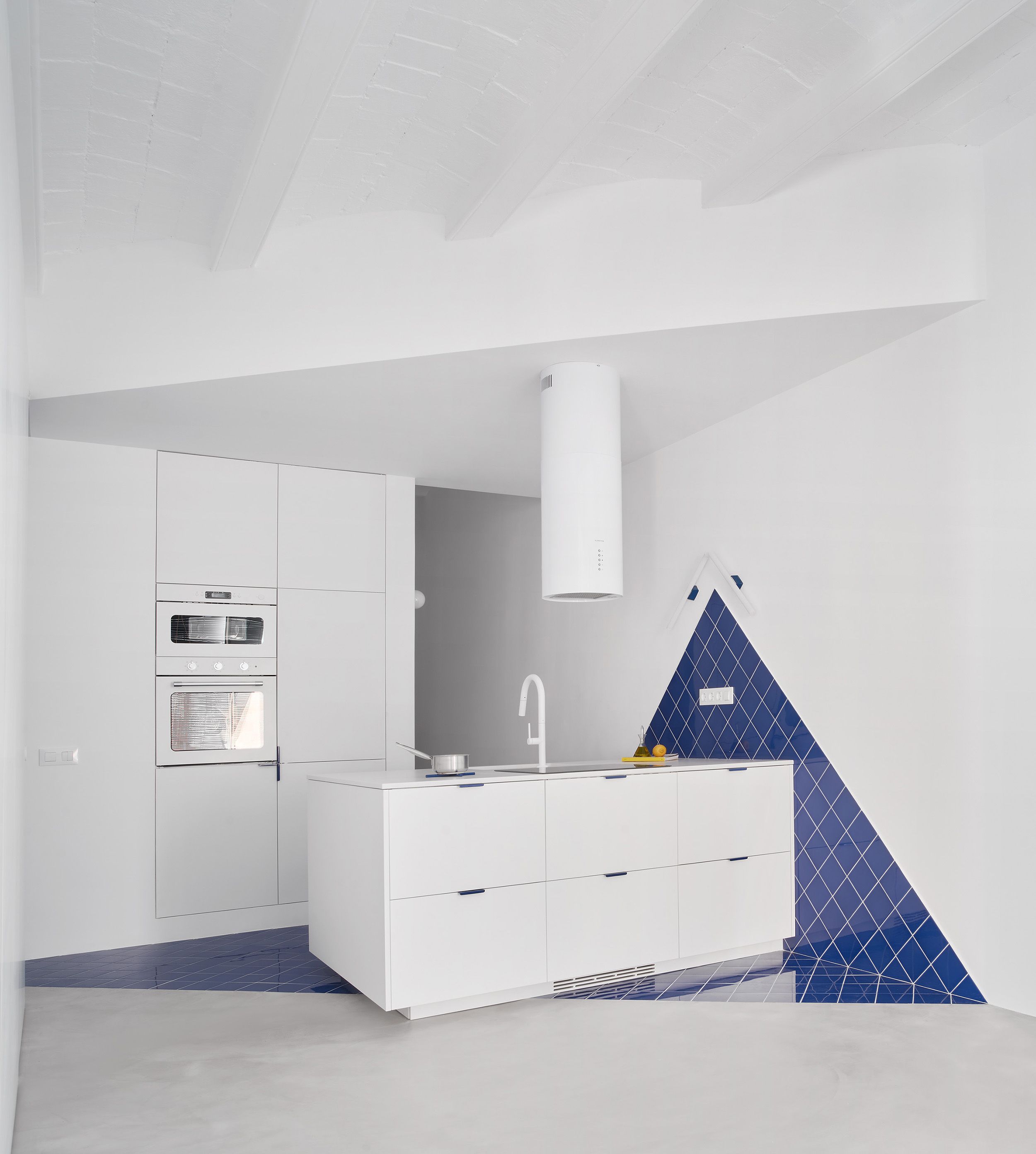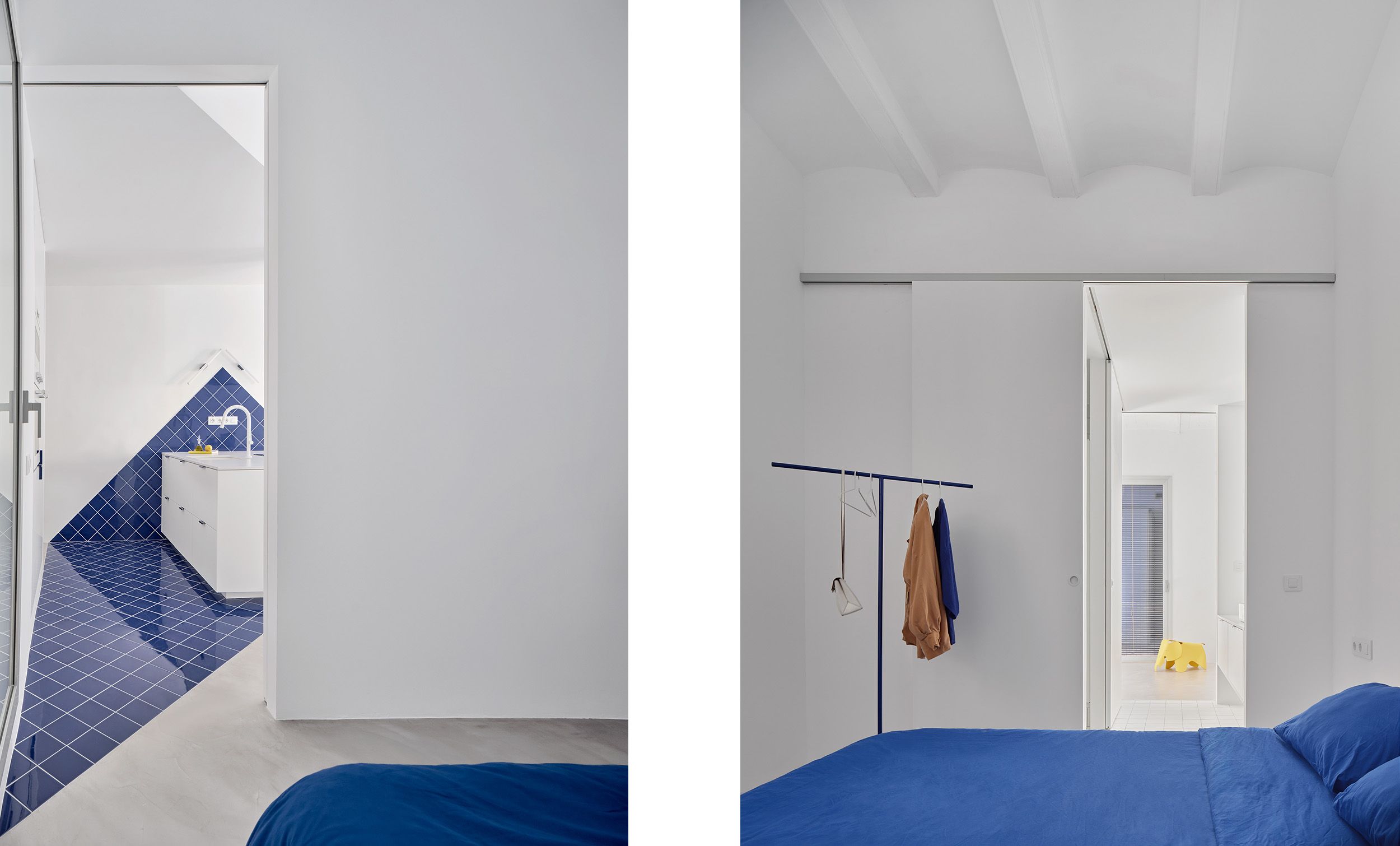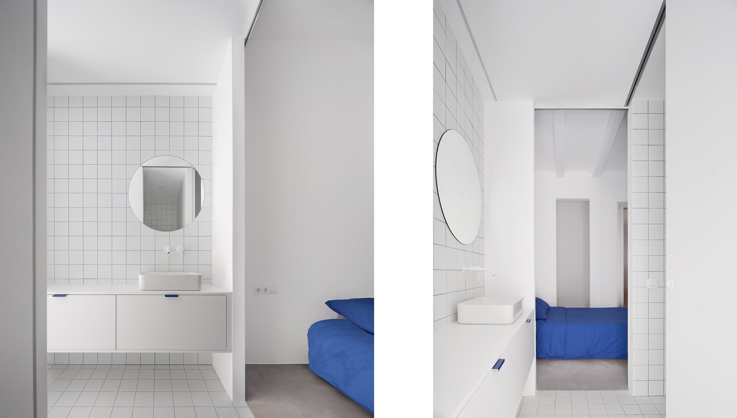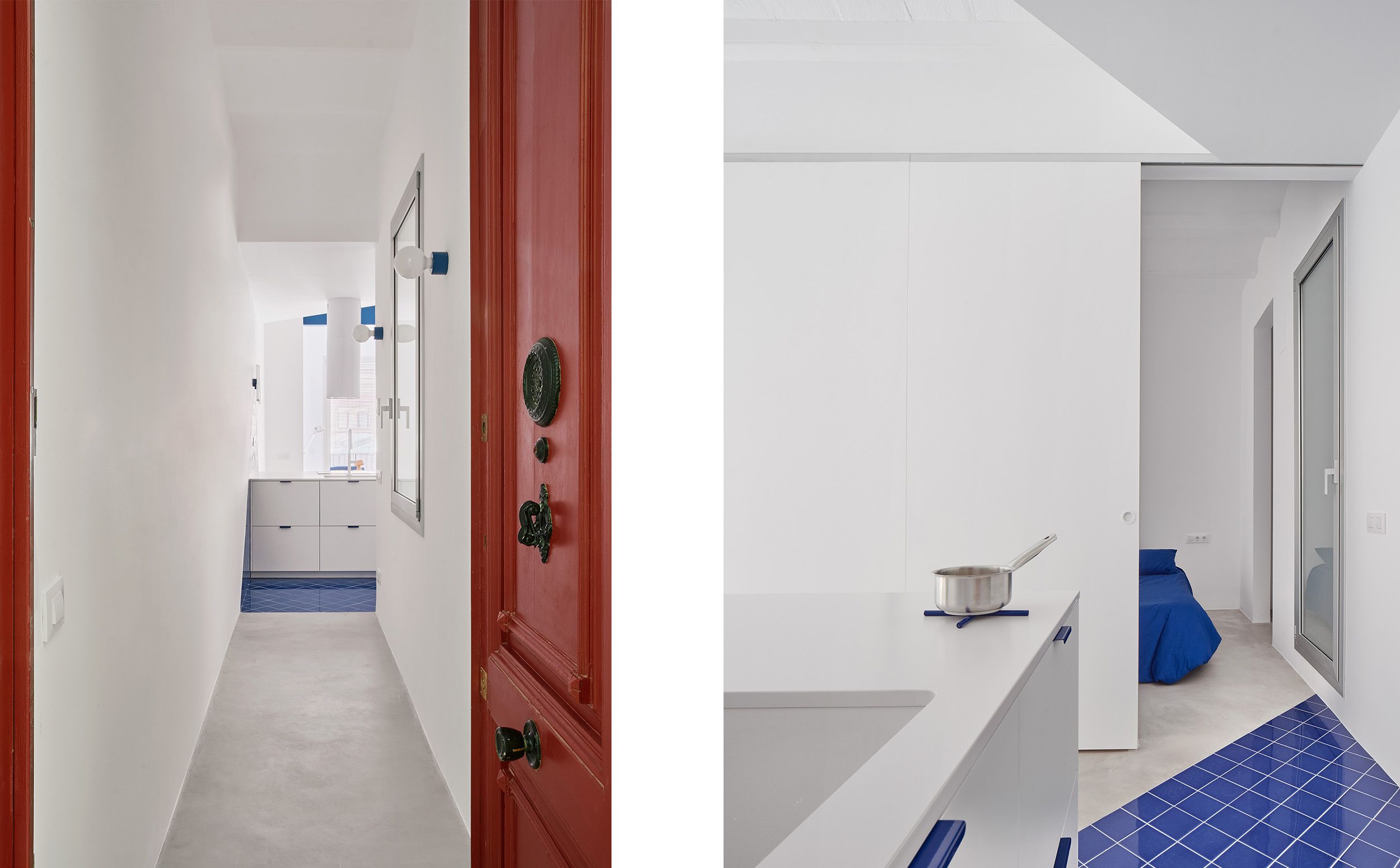 La cocina, transformada en una pieza de mobiliario, se convierte en el epicentro del proyecto. Por otro lado, la utilización de baldosas vidriadas contribuye a enfatizar y definir el área de circulaciones relacionadas con esta, aunque al mismo tiempo disuelve sus límites al introducirse en otras estancias. En cuanto al baño, funciona como un contenedor que integra los paneles móviles, permitiendo segregar el espacio según las necesidades.