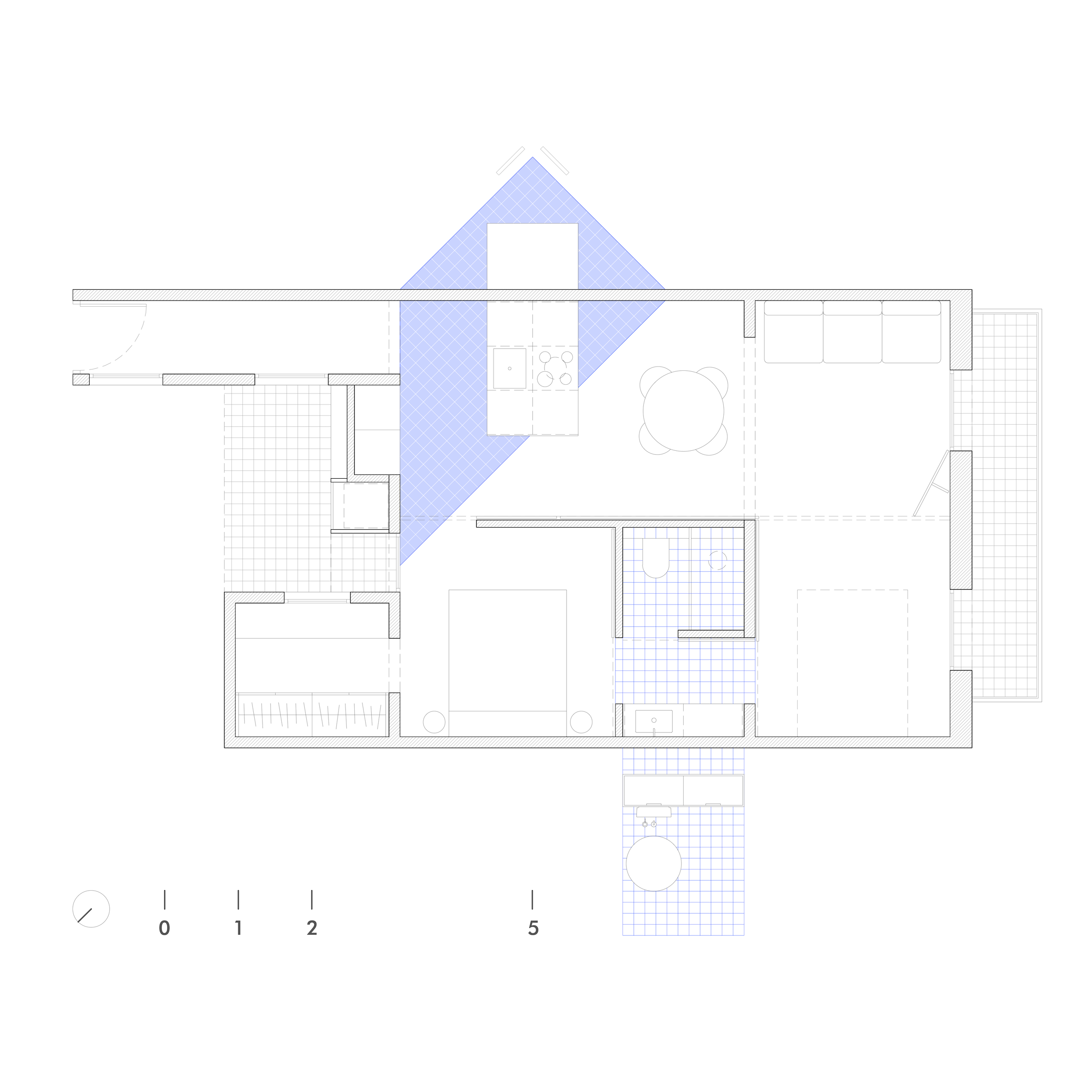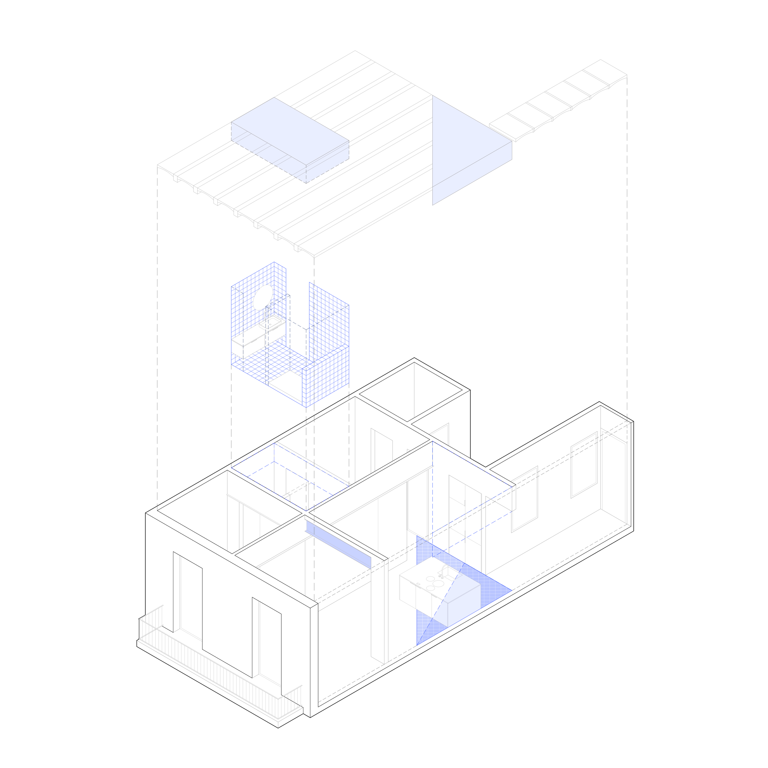 Partant d'une maison comportant plus de pièces que de fenêtres, la proposition consiste à ouvrir et vider l'espace. Les cloisons existantes sont supprimées et, à partir de la définition de deux éléments – la cuisine et la salle de bains, ce que nous appelons « les moyens minimaux d'habiter un lieu », une série de vides non planifiés sont créés, susceptibles d'accueillir différents usages. La présence de plusieurs portes dans ces vides permet un passage continu, facilitant la réalisation simultanée de différentes activités.