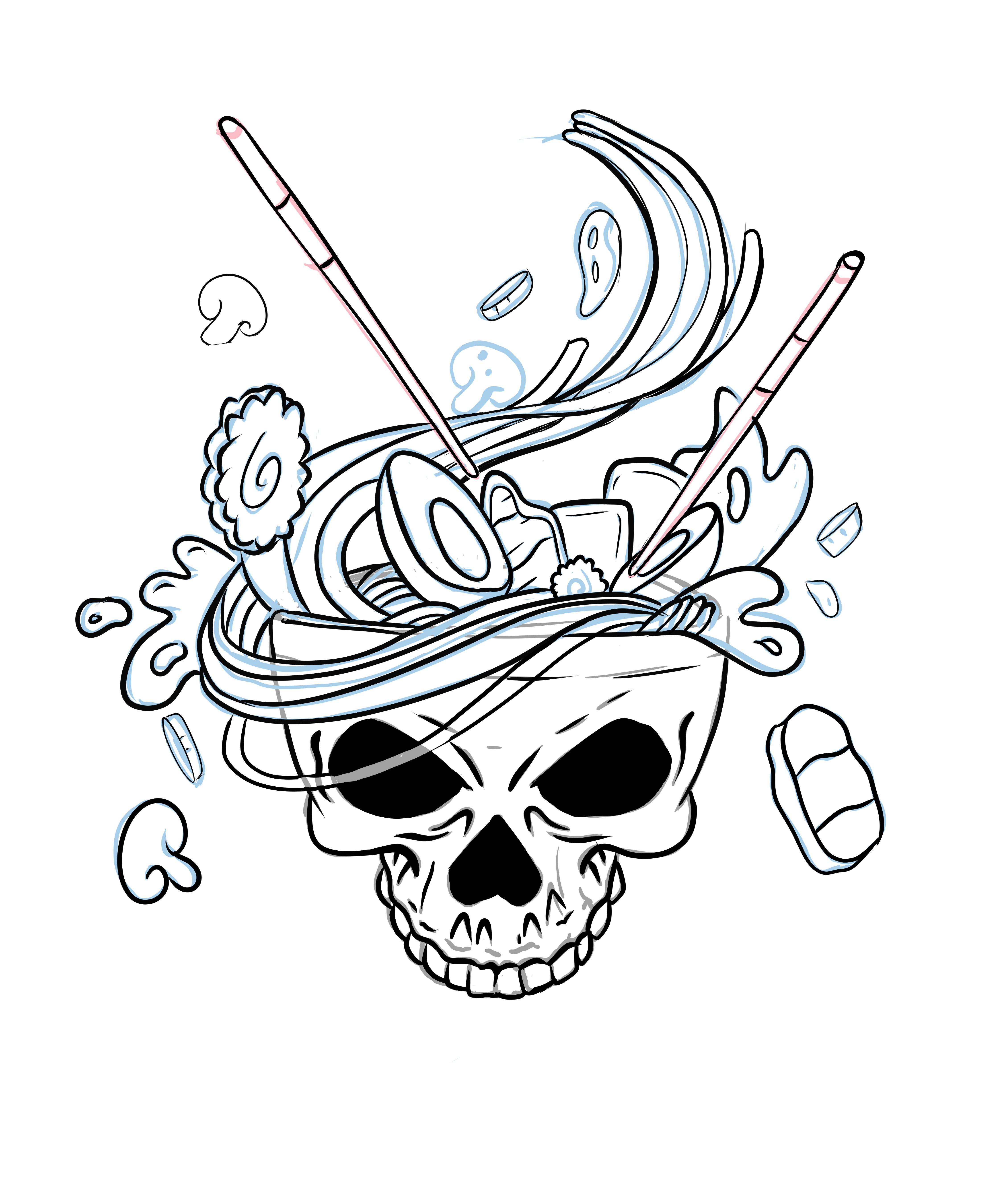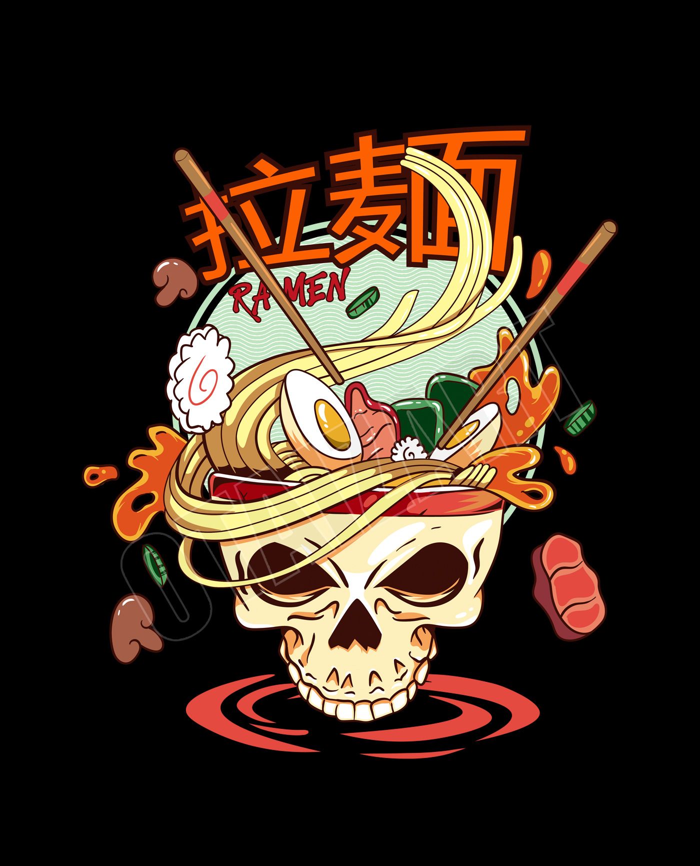 Divertida colección de esqueletos comiendo ramen, estos huesitos tienen hambre, en esta colección encontrarás, unos brazos sosteniendo palillos con fideos, un cuenco con forma de calavera y un esqueleto disfrutando de un plato de ramen caliente en el más allá con llamas azules japonesas.