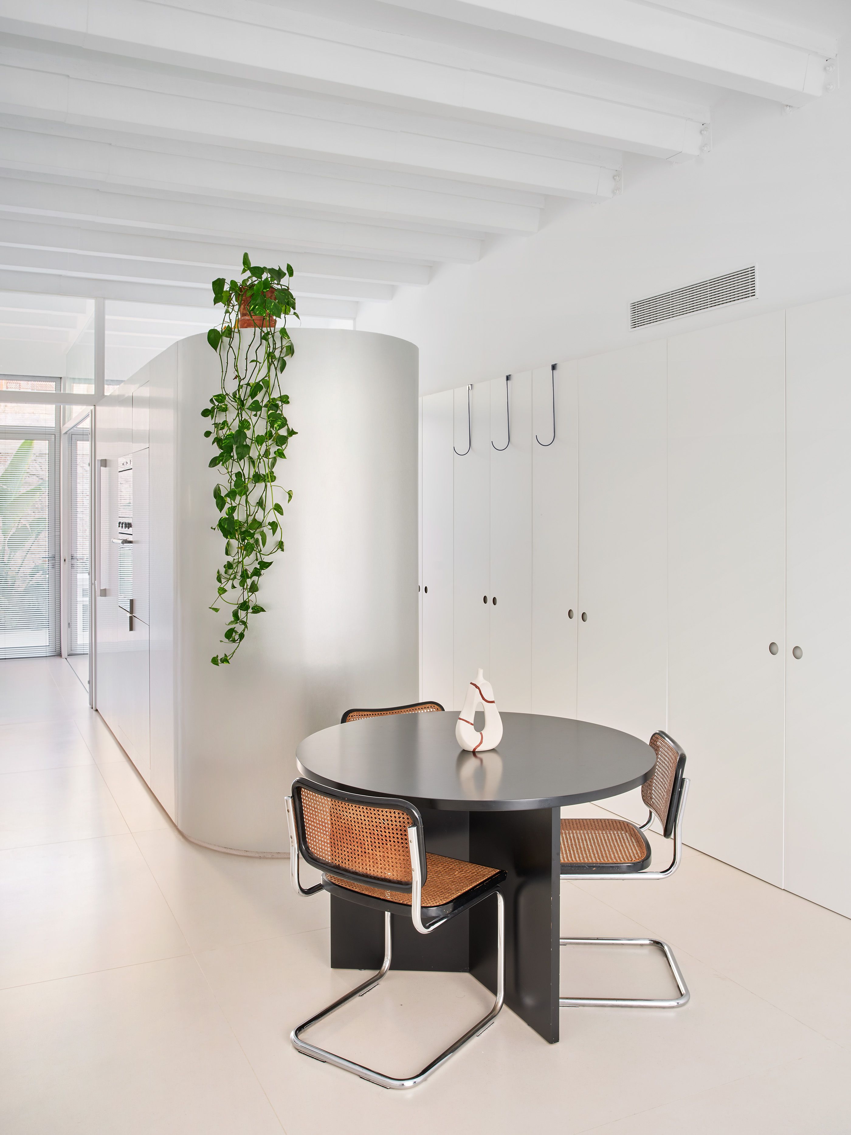 Le projet combine deux stratégies éprouvées dans des propositions antérieures. Le programme fonctionnel et les espaces de rangement sont concentrés en périphérie, libérant ainsi le reste de l'espace. Simultanément, un volume indépendant fait office de filtre entre les différentes pièces, intégrant la salle de bains, une partie de la cuisine et des panneaux mobiles permettant de moduler l'espace au gré des besoins. À partir de la définition et de l'agencement de ces éléments – ce que nous appelons « le minimum vital pour habiter un lieu » – se créent des vides imprévus, susceptibles d'accueillir divers usages.