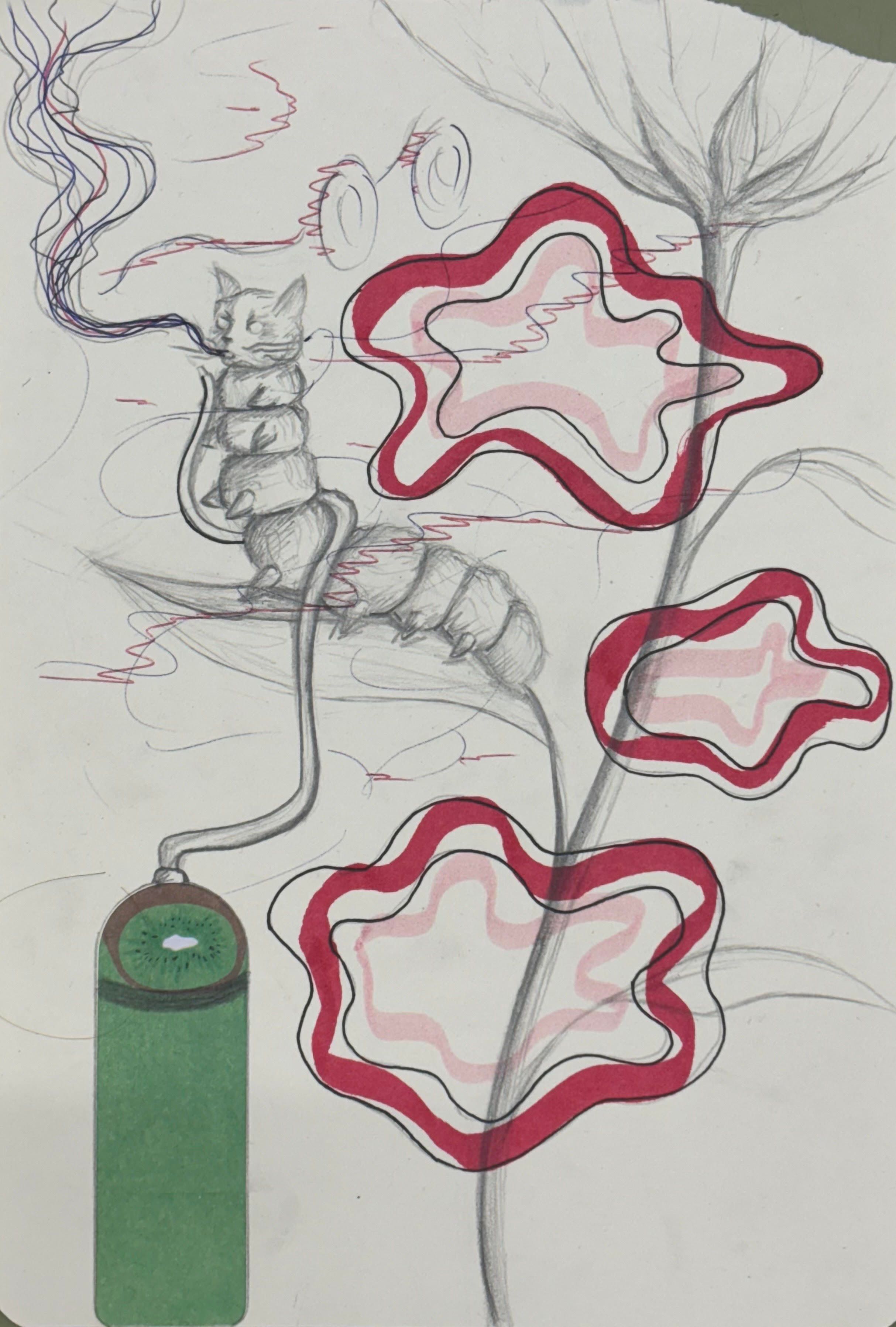 Em vaig inspirar en l'oruga d'Alicia en el país de les merevelles i el vaig barrejar amb el cap d'un gat posat en una fulla d'una flor.