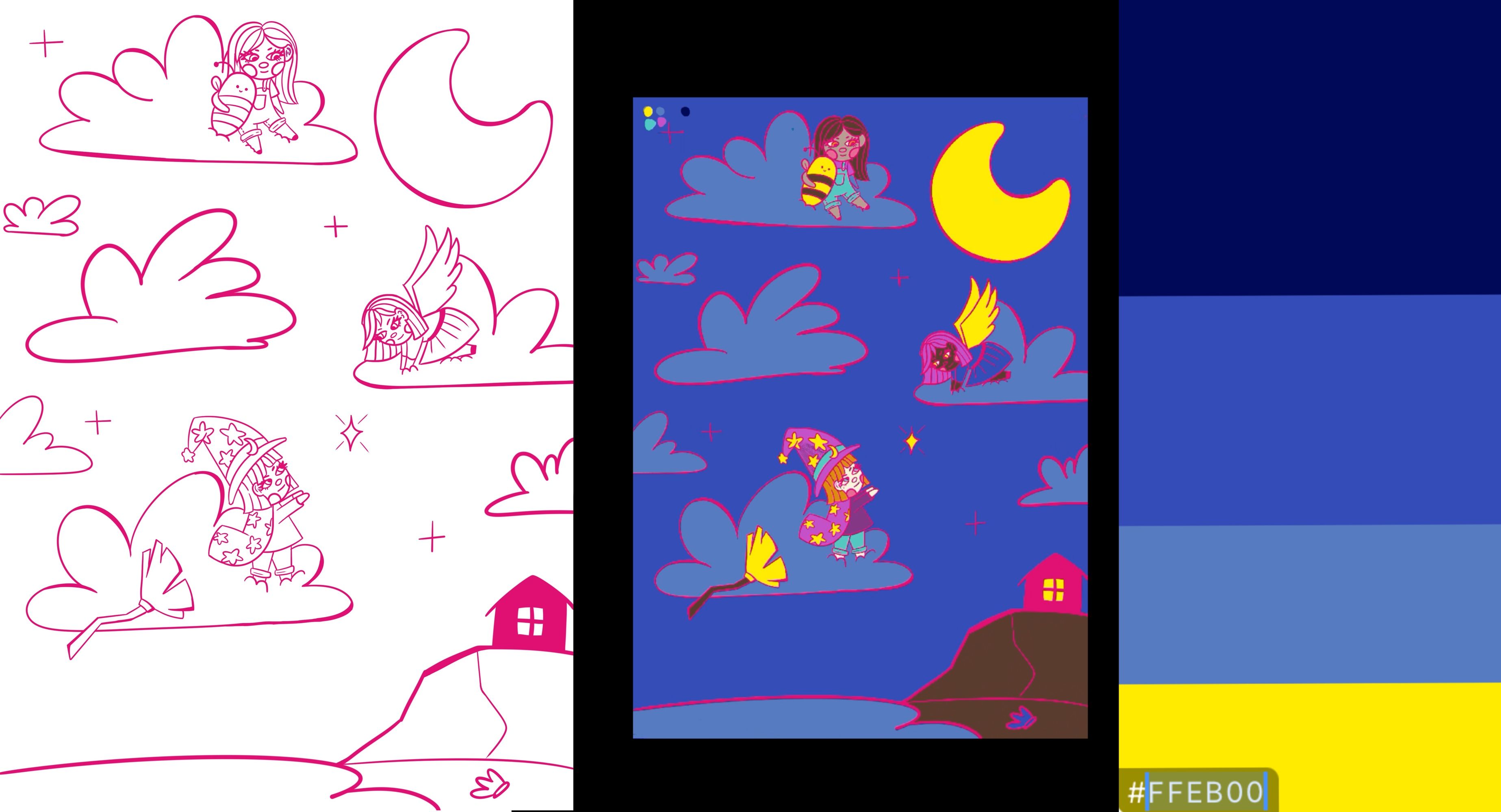 EN:I start by seeking inspiration from visual references to define the colors of the illustration. I choose cooler colors to bring the freshness of the night into the illustration, working with more vibrant colors and avoiding very warm tones. I select some shades and test and adapt them to what I want to achieve. Next, I do the color blocking, where I define the main areas that will be colored. It’s a fun moment, as I begin to see how the colors interact and bring my project to life. You can change the colors whenever you want to adapt to your project.