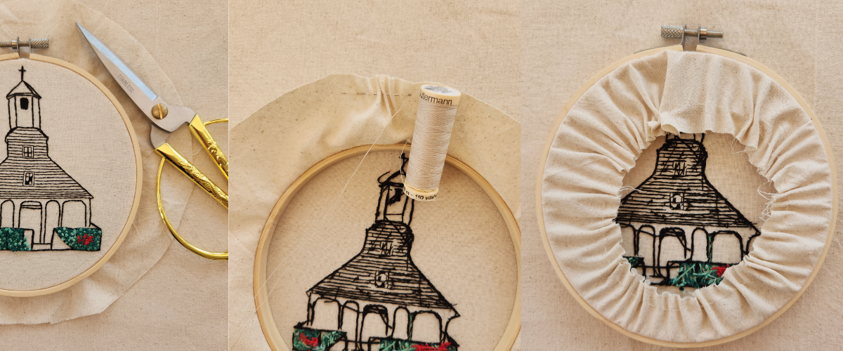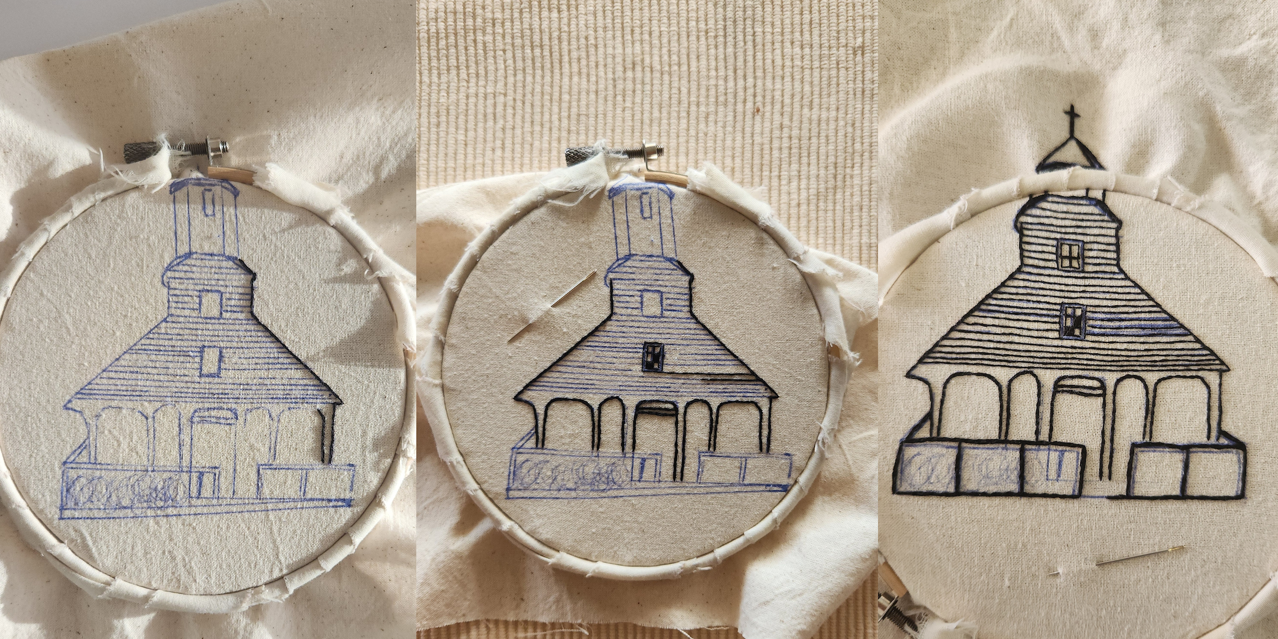 Finalement, j'ai choisi la photo d'une église patrimoniale de l'île de Chiloé (Chili). C'est un lieu qui me rappelle de bons souvenirs, et je voulais lui rendre un petit hommage à travers la broderie.