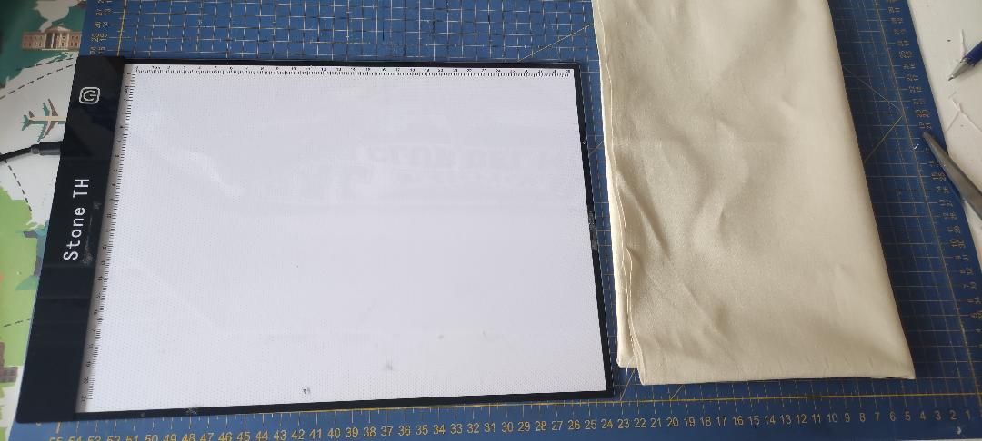 Pour marquer notre dessin sur le tissu, je le place sur la table lumineuse et je place le tissu dessus.