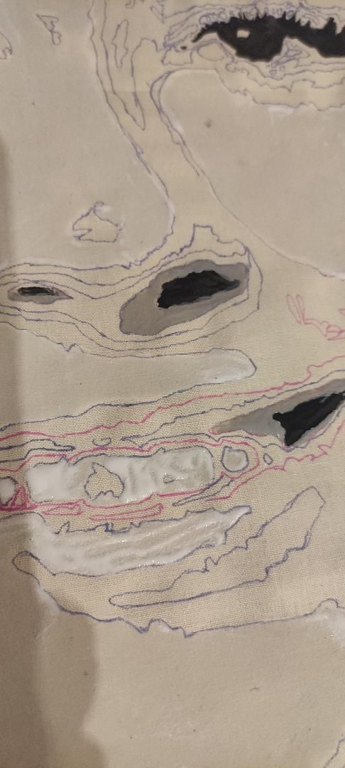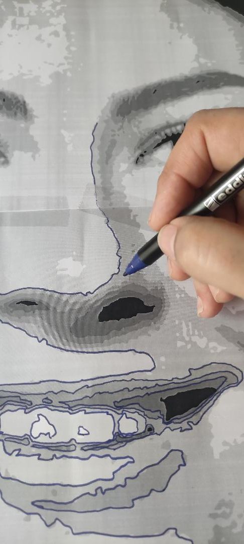La foto tiene una información sobre los colores en forma de mapa degradado, para poder transmitir esa información a la tela , lo primero que hago es repasar la foto con un rotulador permanente.