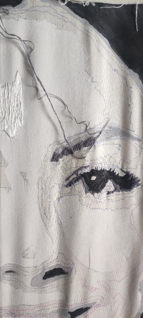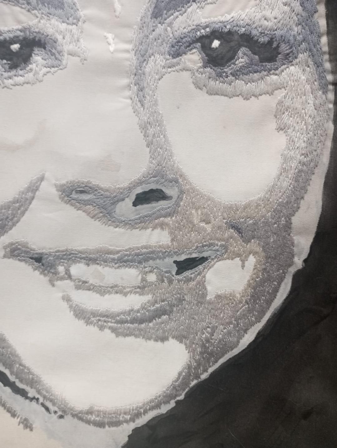 Mon expérience de création d'un portrait brodé à la peinture a été véritablement enrichissante et riche d'enseignements. J'ai commencé par sélectionner une photo qui m'inspirait profondément, puis j'ai décidé d'associer peinture et broderie pour lui donner une touche unique et personnelle. J'ai d'abord peint le tissu avec les couleurs et les détails que je souhaitais mettre en valeur, en expérimentant différentes techniques de peinture pour obtenir des effets d'ombre et de lumière qui donnaient vie au portrait.