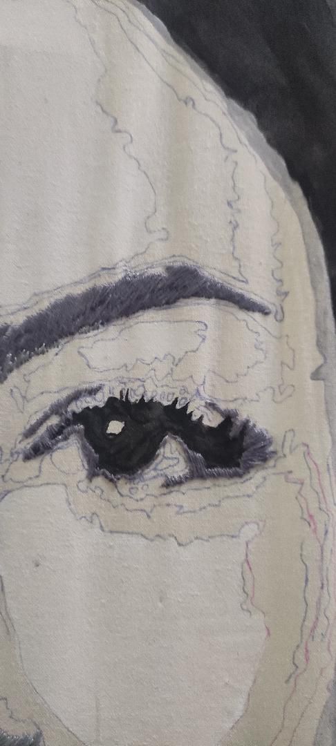 Luego, pasé a bordar sobre la pintura, lo que fue un proceso muy delicado y creativo. Me permitió agregar texturas y detalles que la pintura sola no podía lograr, como los cabellos, los ojos y las expresiones faciales. Durante el proceso, aprendí a equilibrar la pintura y el bordado, asegurándome de que ambos elementos se complementaran y no se sobrecargaran.