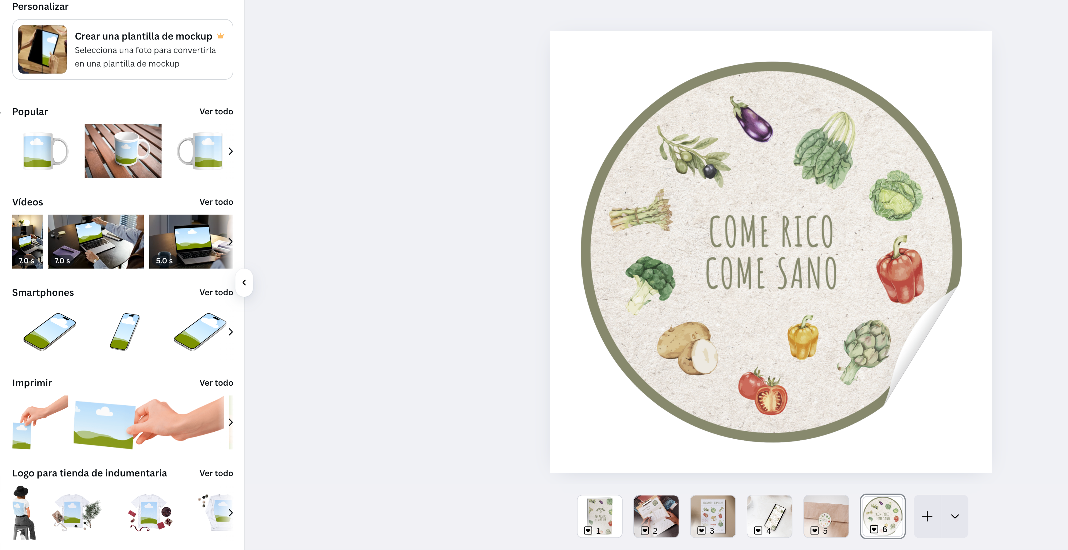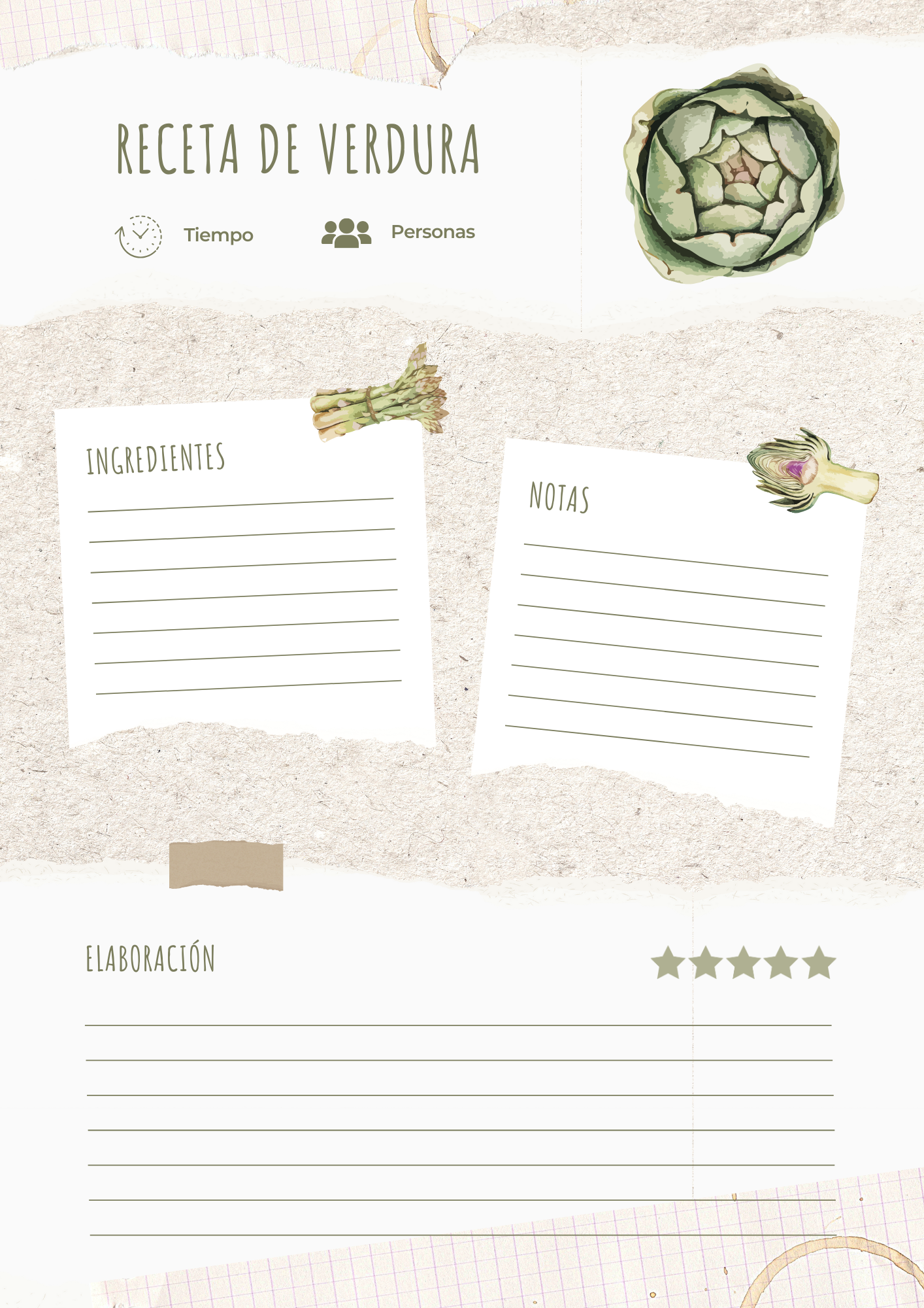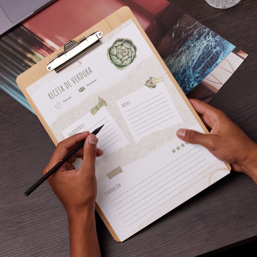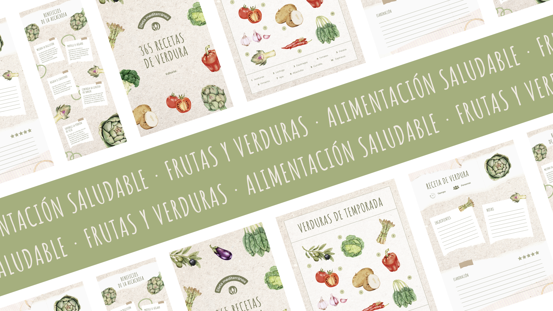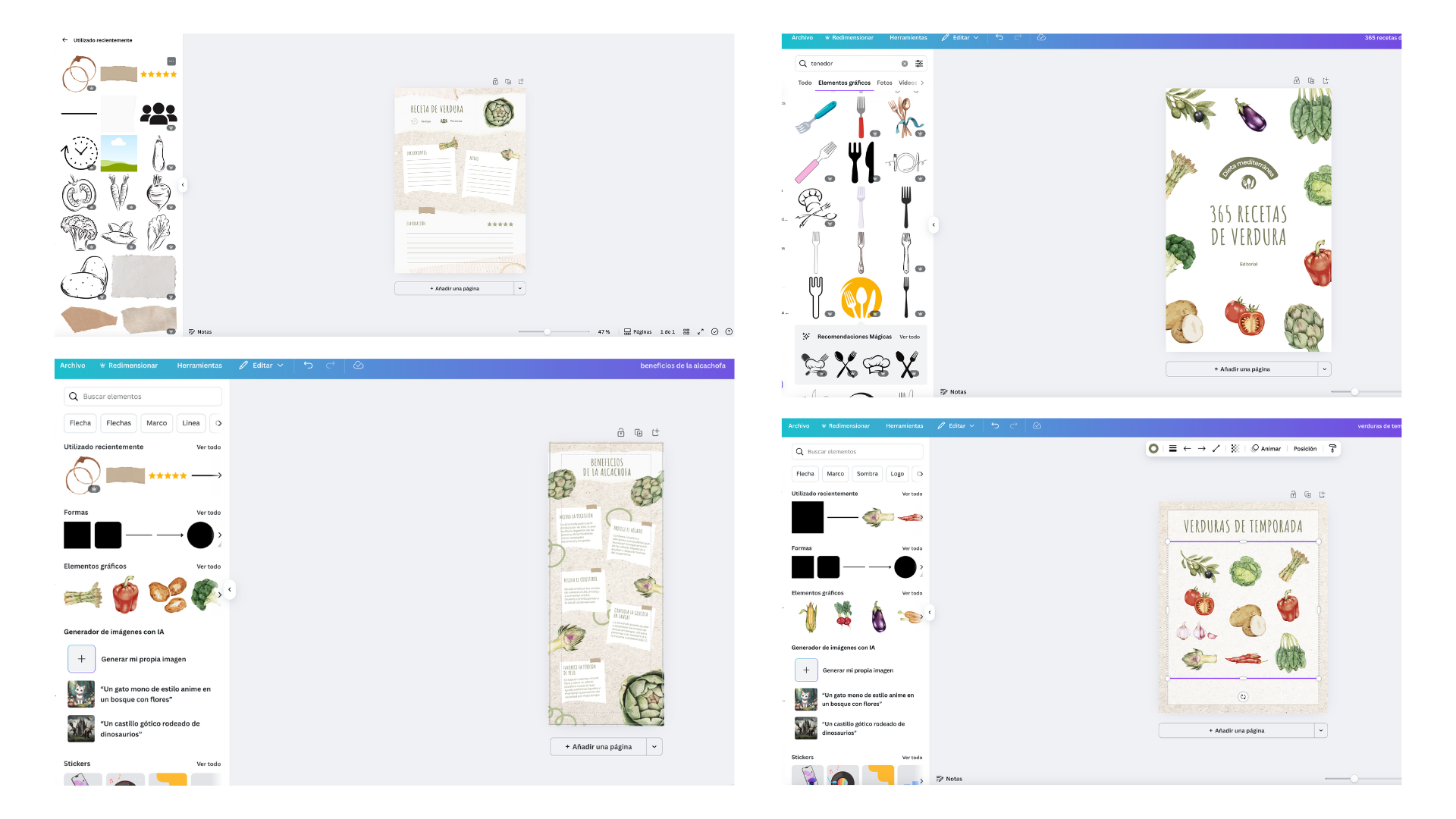 Aquí se muestran las 5 plantillas realizadas: hoja de receta, infografía, portada de libro, pegatina y cartel.