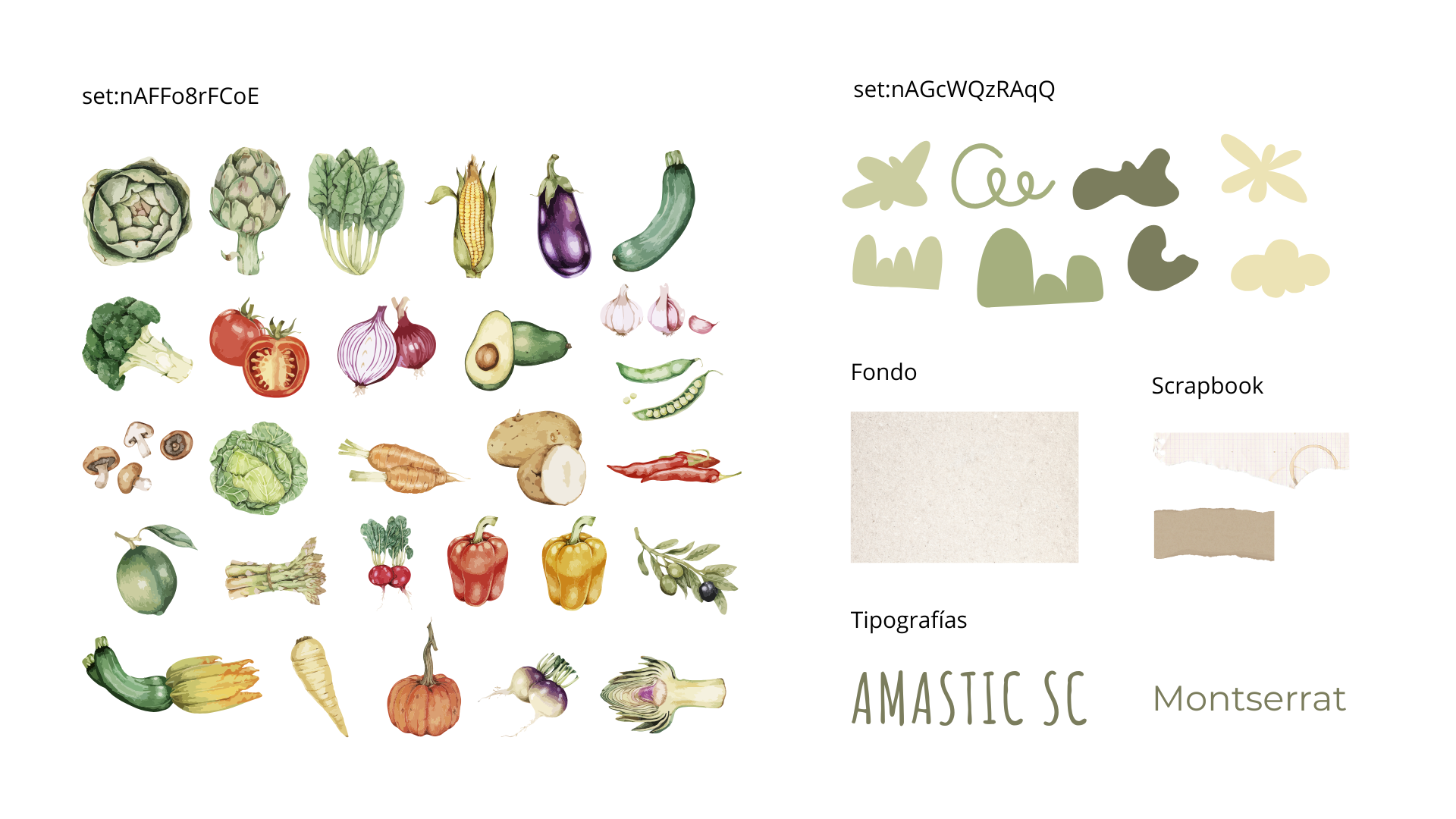 * Elementos seleccionados: se han usado elementos con los códigos adjuntos, basados en verduras y frutas de acuarela, así como en formas orgánicas.