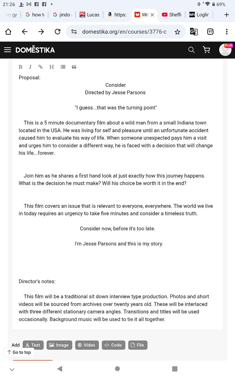 Normally, my process involves little paperwork. I am a very visual person, so I tend to do more on the fly, filming as well as editing. Although, I do tend to make notes and sometimes I'll do storyboards. I am fairly new to film making though. I learned a lot about the proposal process as well as the logline.