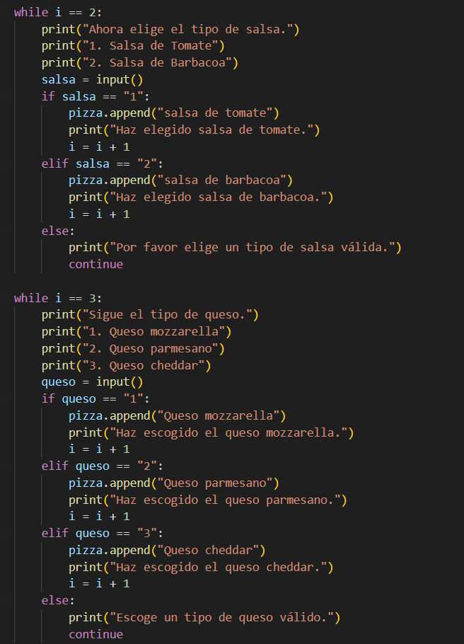 Se escribe la bienvenida, y se le asigna 1 al valor "i" quien será fundamental para los ciclos más adelante. También se define la lista, a la cual se le añadirán los ingredientes de la pizza.