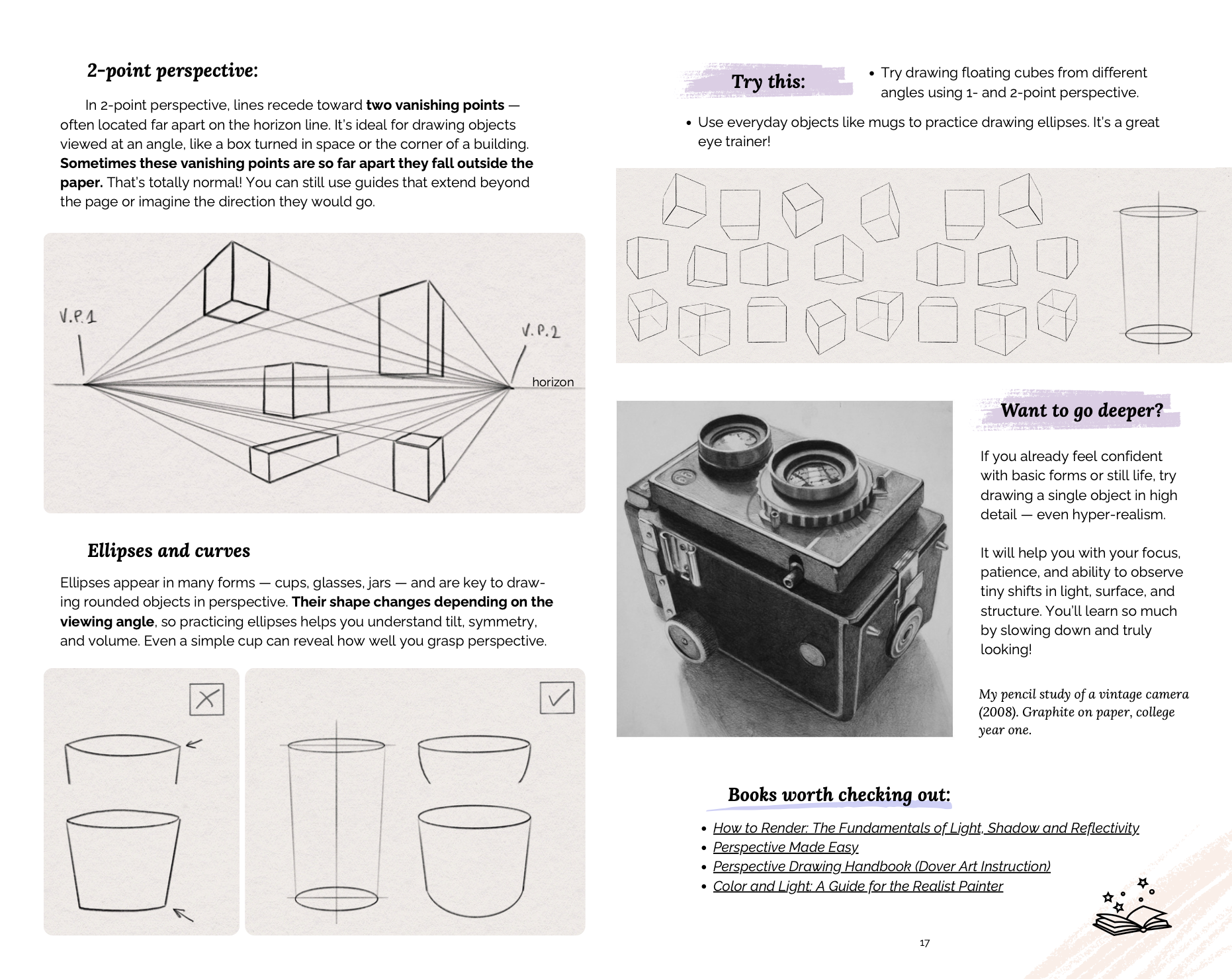 It’s full of my own drawings and includes creative worksheets to help artists apply what they’ve learned.