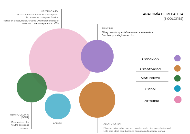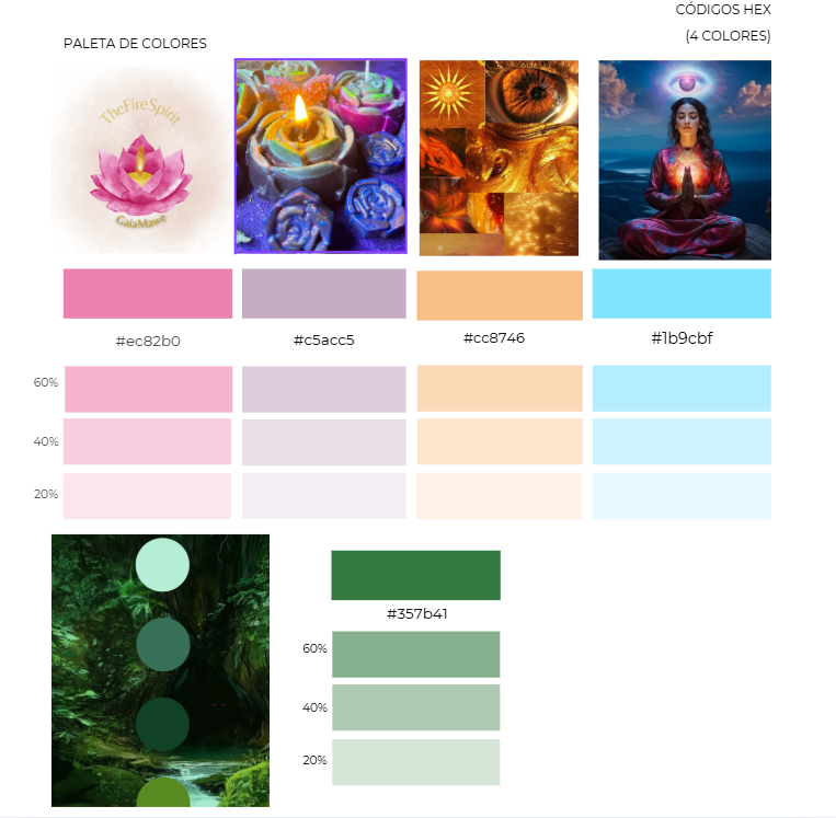 PALETA DE COLORES : Fuerón seleccionados de acuerdo el Imagotipo de mi marca, el cual habia diseñado previamente con los recursos de canva. Y a su vez aprovechando la guia del curso pude darle un contexto de acuerdo con el circulo cromatico y la representación de cada color de acuerdo con la psicologia de los mismos, además quise asociarlo desde una perspectiva holistica como lo son los ---centros energeticos del cuerpo---
