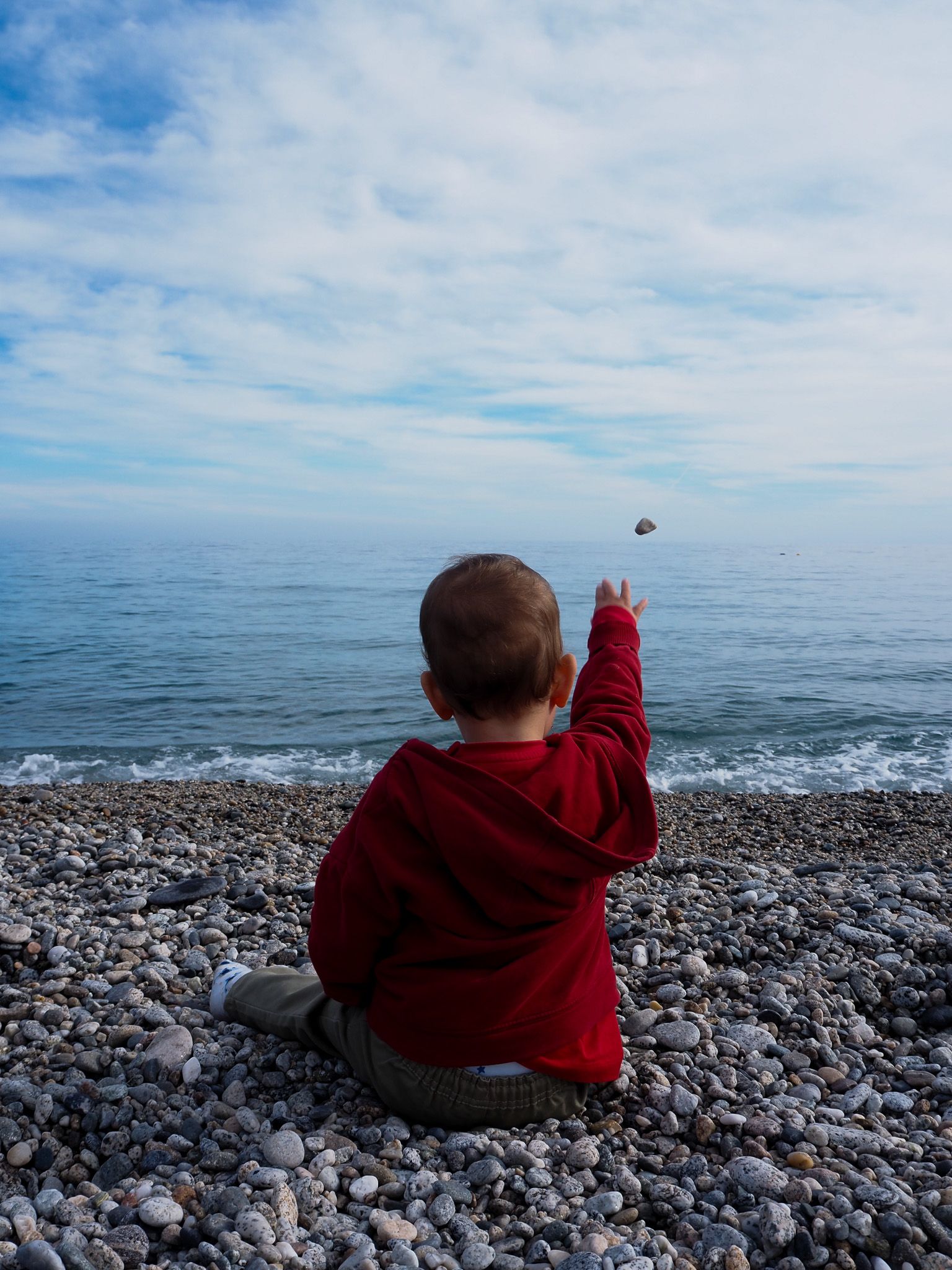 A quiet moment of discovery — a child sits by the shore, throwing a stone into the sea.