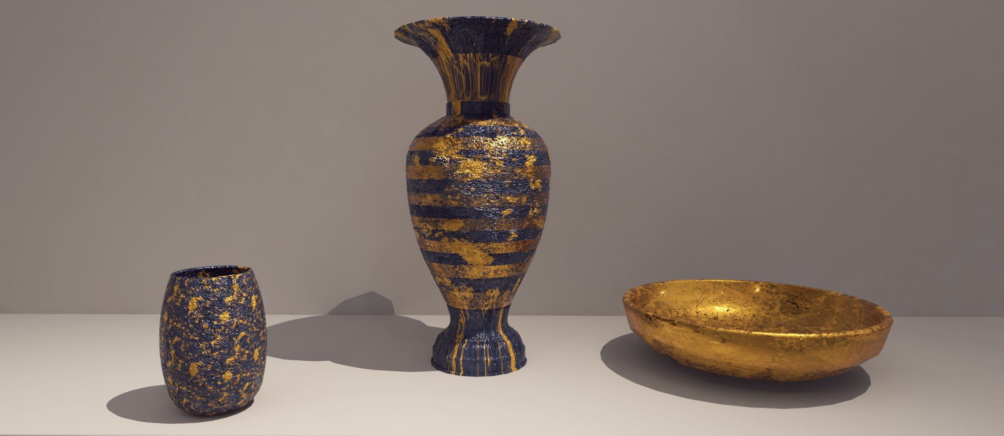 Creé y edité materiales de madera, vidrio, tela y metal para detalles y decoraciones de este proyecto. Elegí una madera oscura, casi negra para la celosía que divide la sala del comedor. Vidrios para los floreros y botellas de la mesita de centro y botella junto al T.V., edité la tela del sofá y jugué con el acabado metálico de algunos detalles decorativos. Para poder aplicarlo, primero practiqué con otros modelos haciendo diferentes patrones, texturas y colores.
