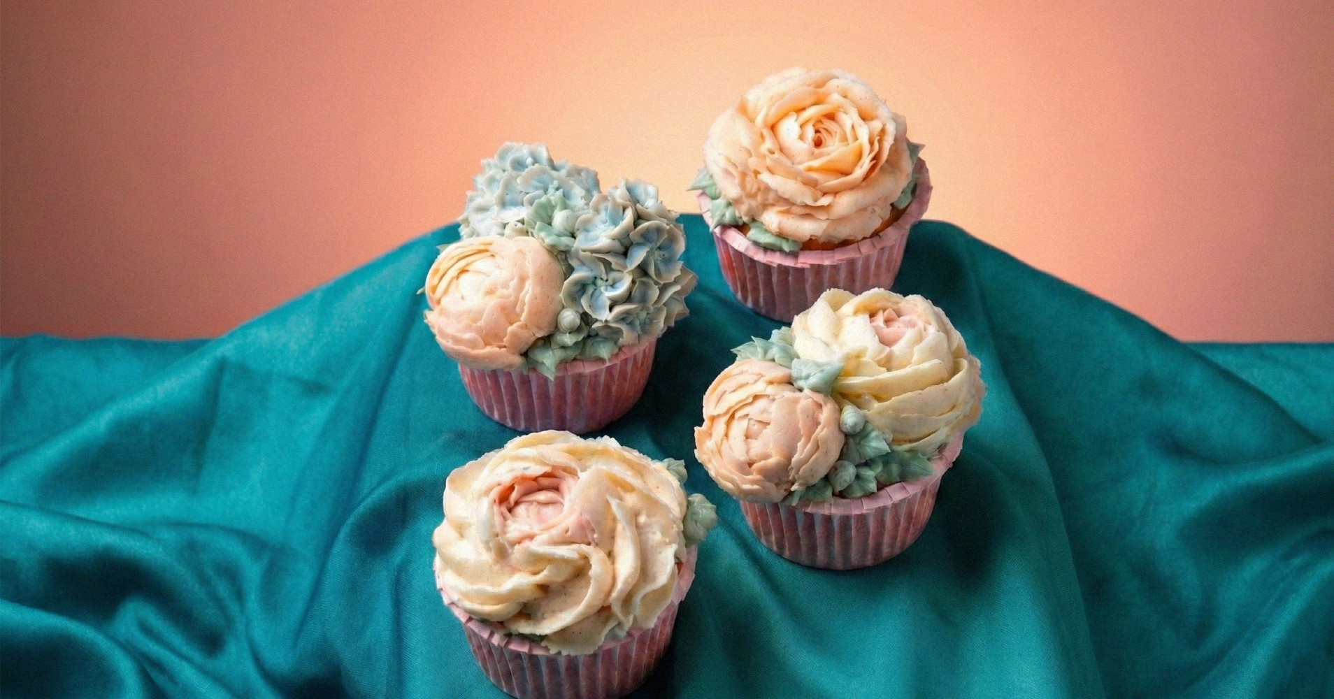 The final arrangement. Once the flowers were chilled and firm, I transferred them onto the cupcakes. To complete the artistic presentation, I needed a backdrop that would make the peach tones pop, so I raided the toy box. I arranged the cakes on a teal play silk from my toddler's Lovevery kit. Its soft sheen and specific shade of blue traveled on the opposite side of the color wheel from the flowers, creating a visual vibration that made the petals appear brighter.