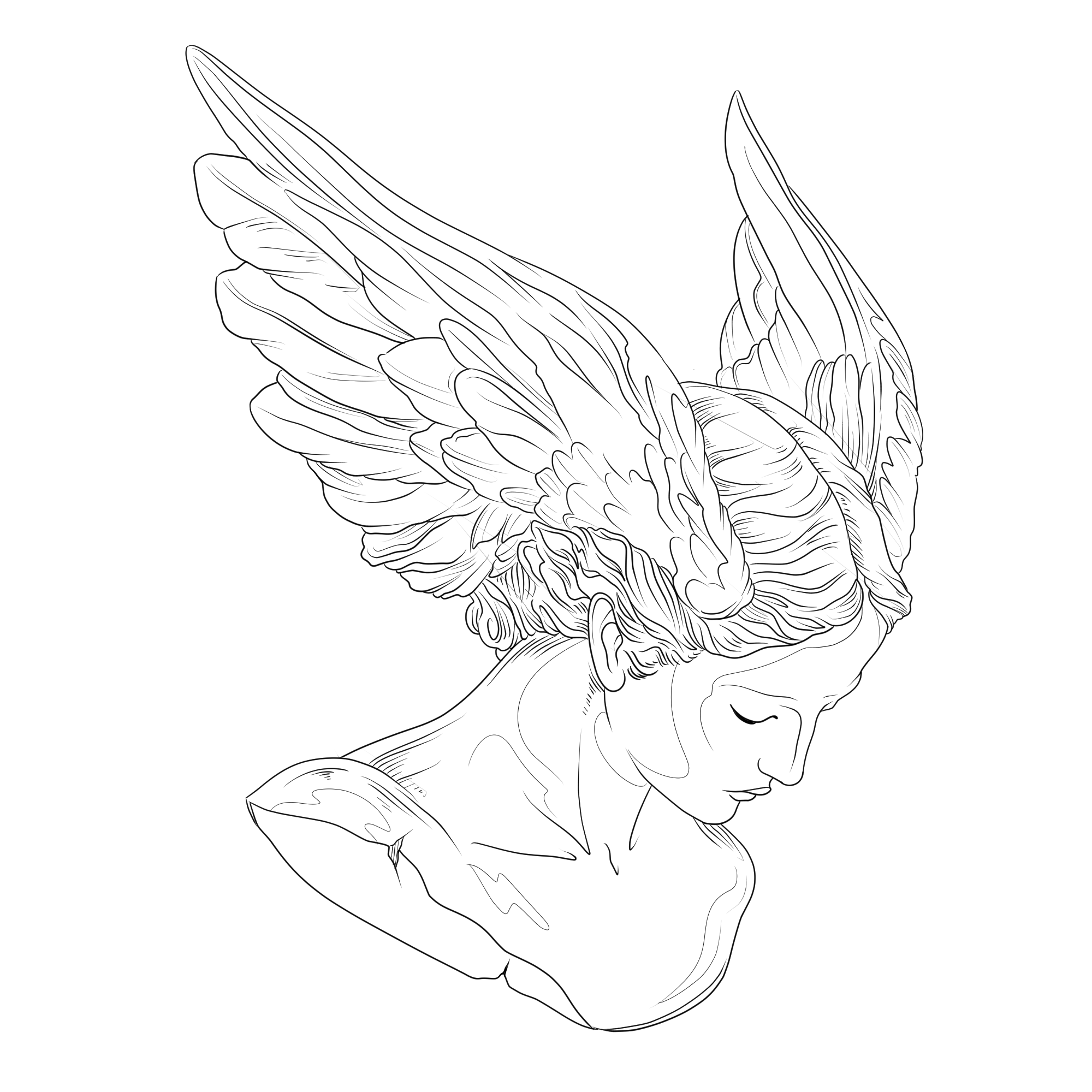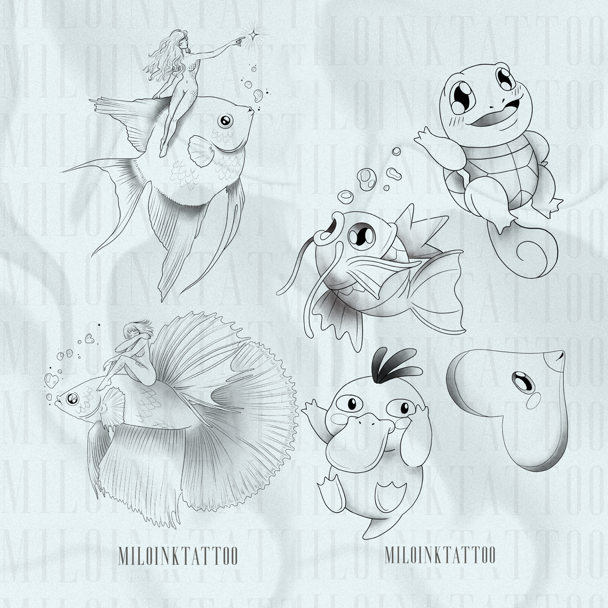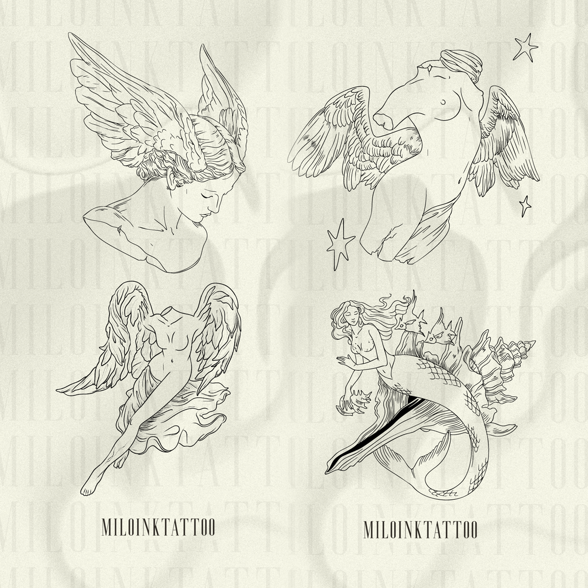 Basandome principalmente en la figura femenina realice una serie de diseños donde combino esculturas de cuerpos femeninos con alas emulando arpias, sirenas aladas y directamente un sintetisación de una ilustración de una sirena. Otra seríe un poco más enfocada en mis gustos personales y lo de mis potenciales clientes, todos pensados para ser tatuajes estilos fine line